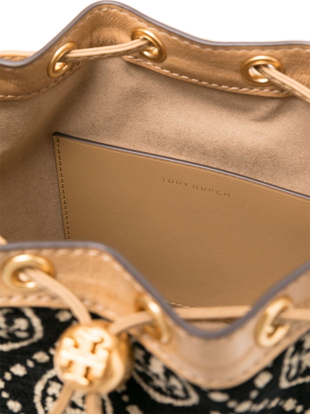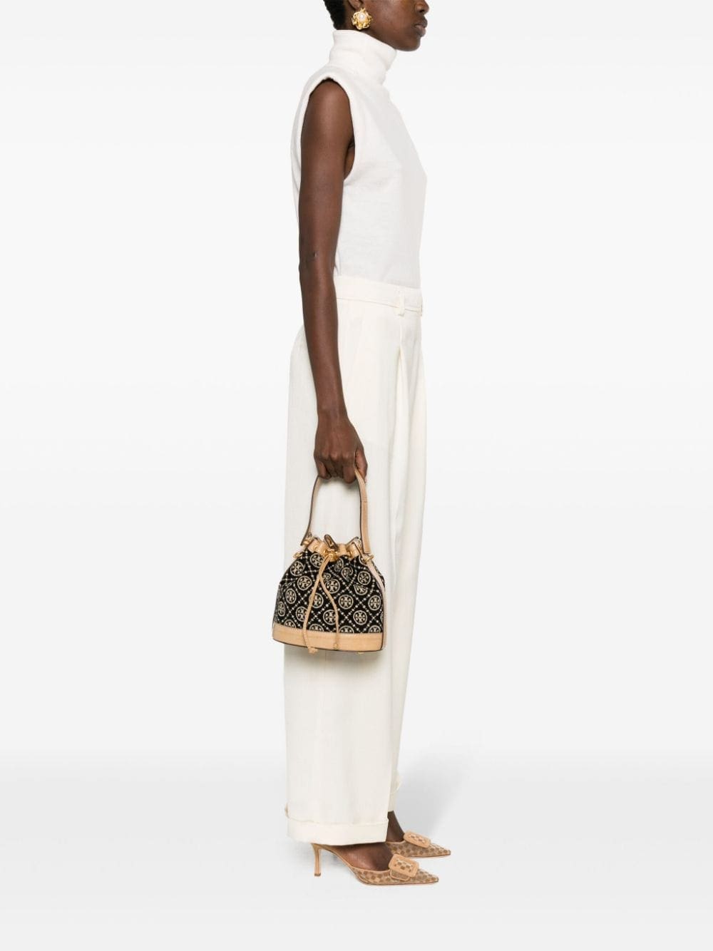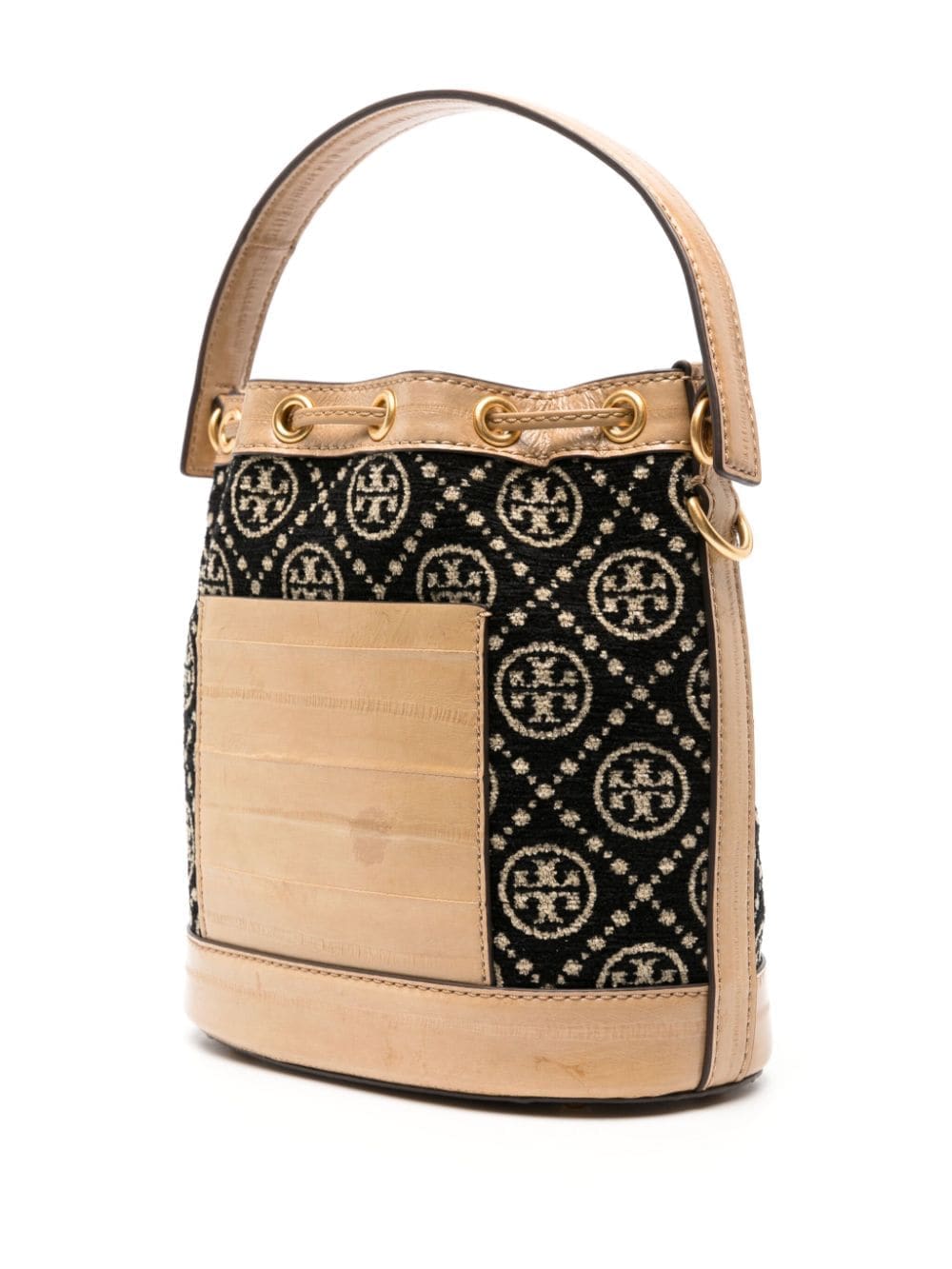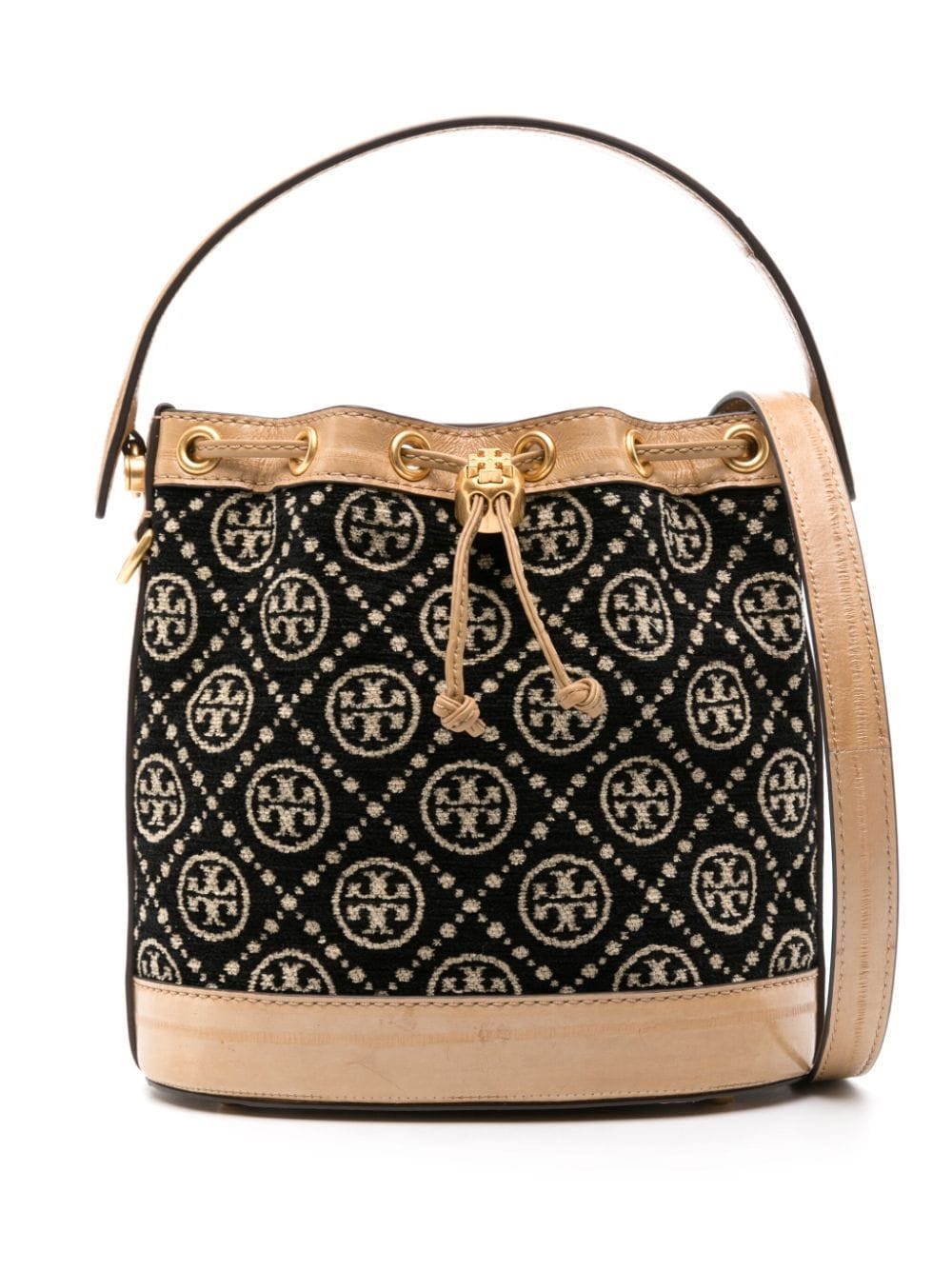 This Tory Burch bucket bag is decorated with the iconic Double T motif — a logo inspired by the geometry of Moroccan architecture and the bold graphics of David Hicks’ interiors from the '60s and ’70s. It’s trimmed with leather and finished with polished gold-tone metal hardware.