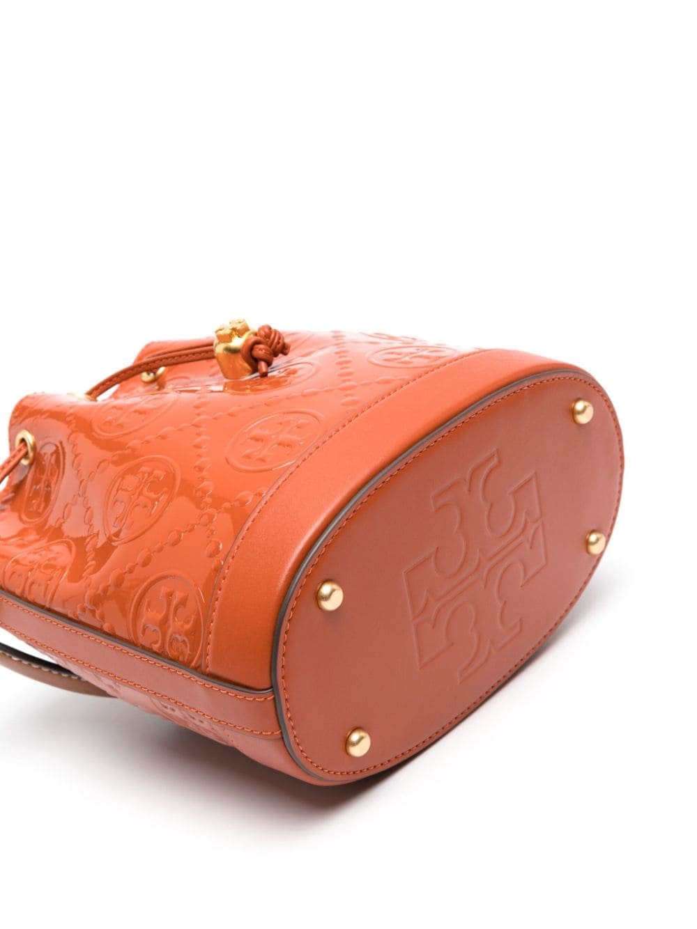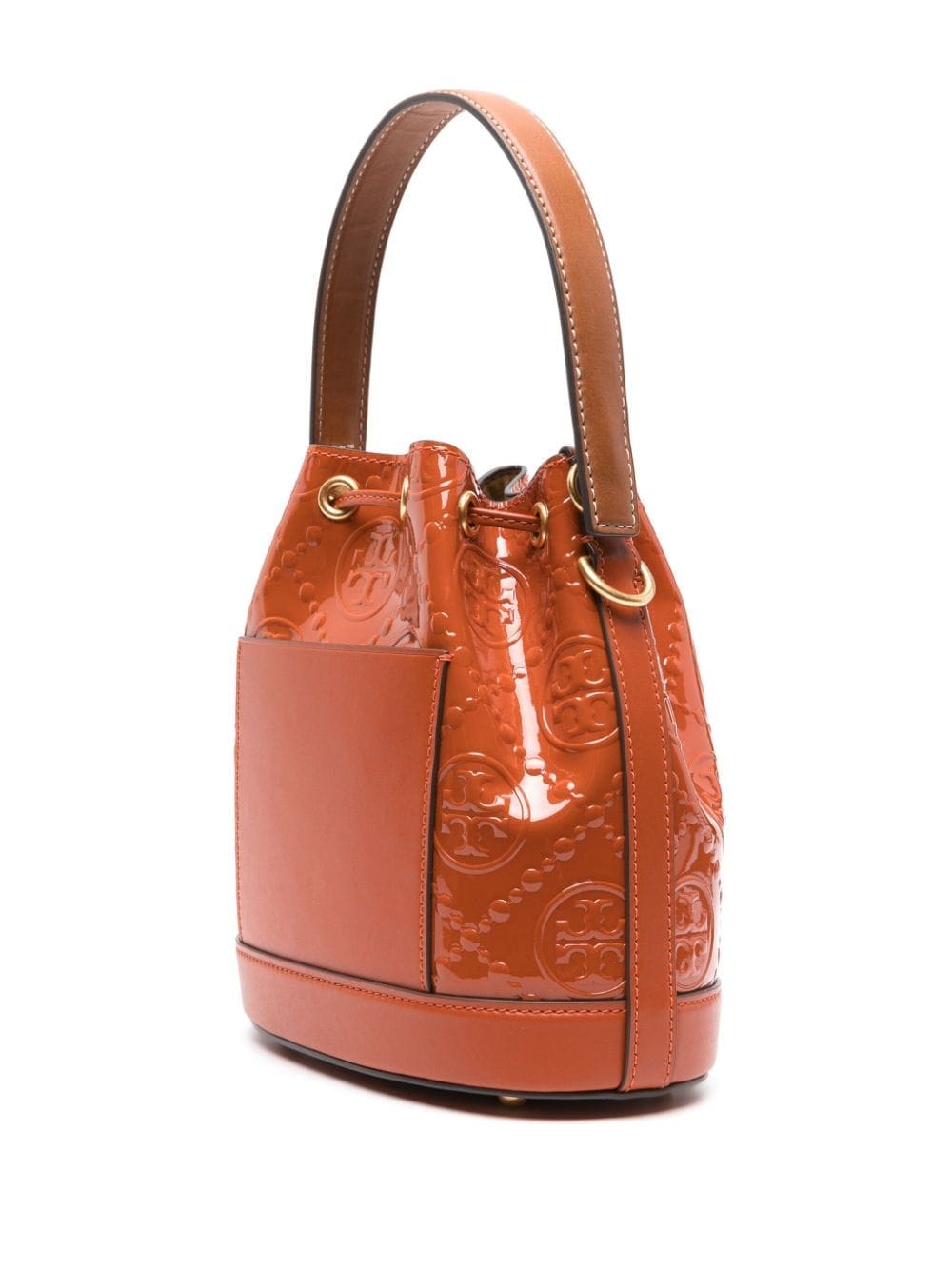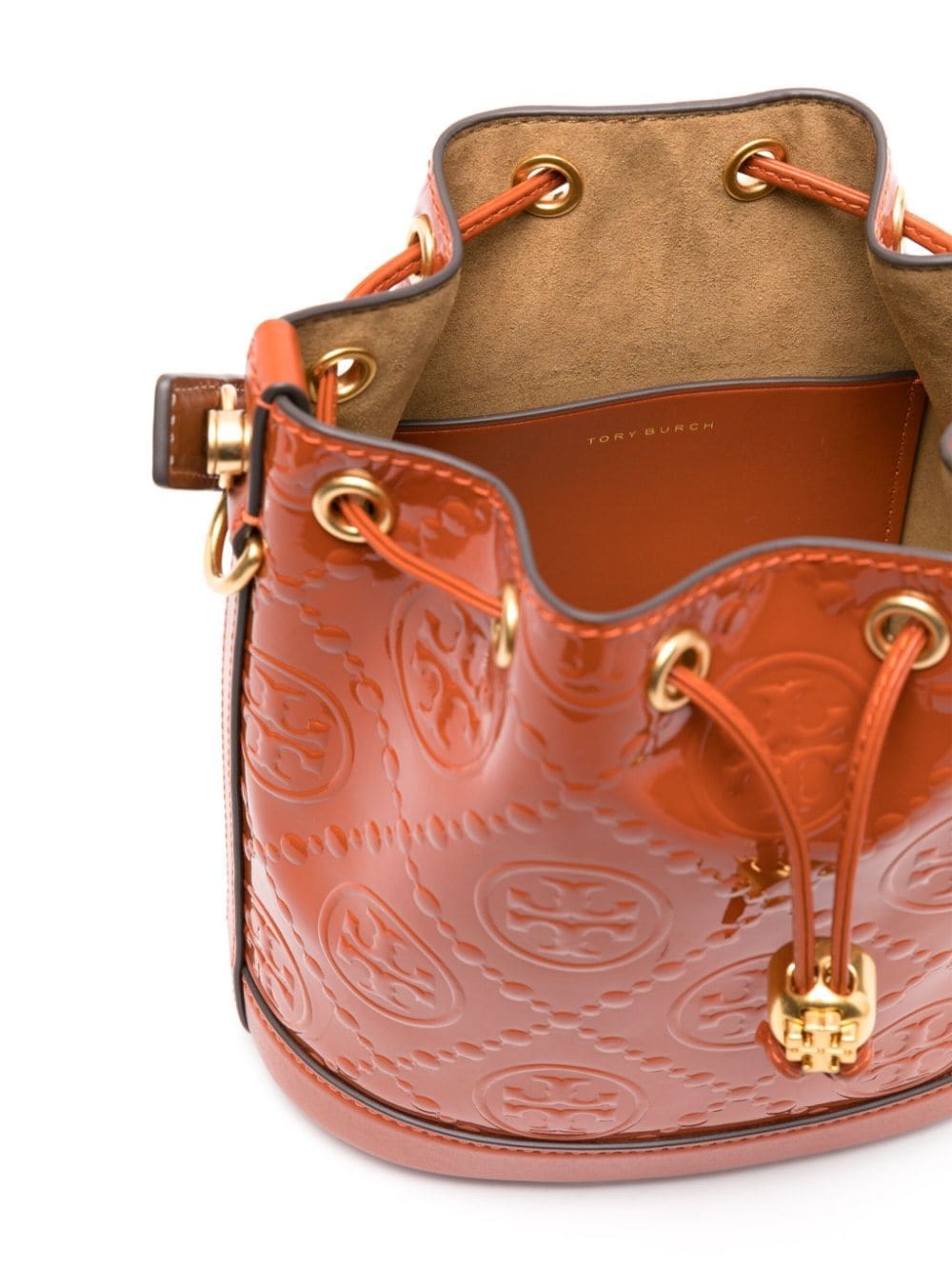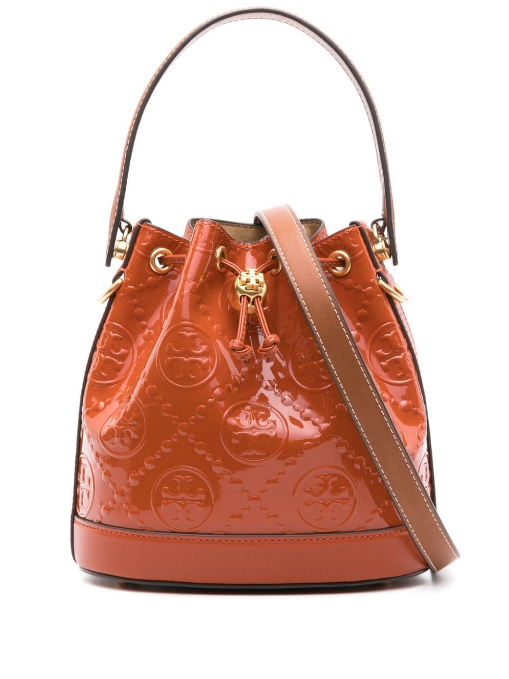 Descendant of a line of bucket bags, this two-way iteration displays Tory Burch's Double T embossed monogram on a patent-finished drawstring construction.