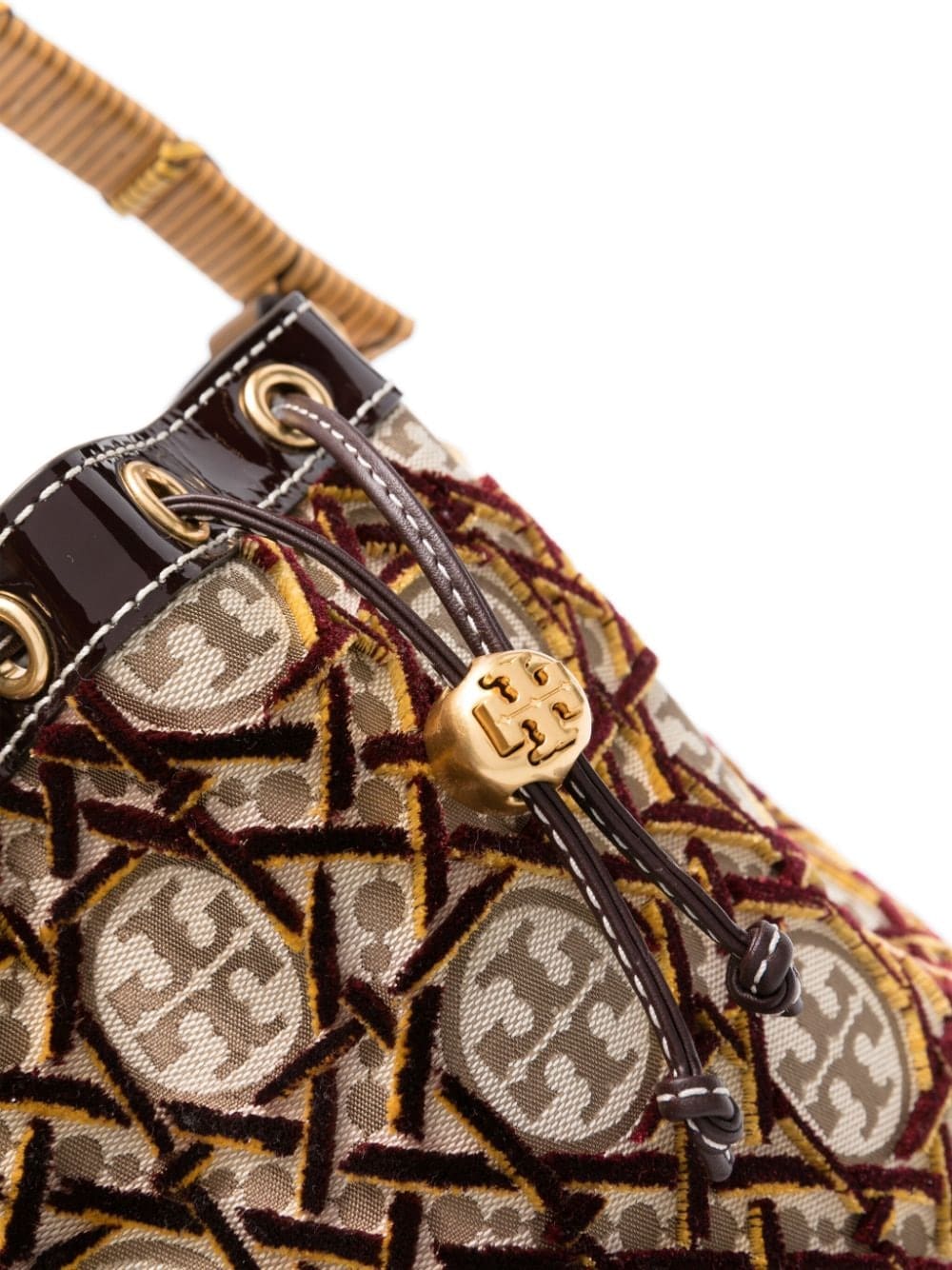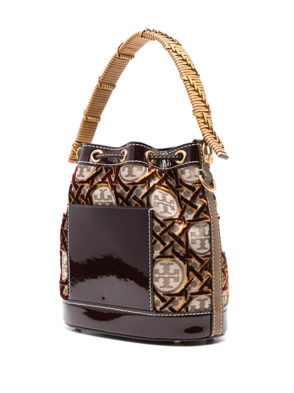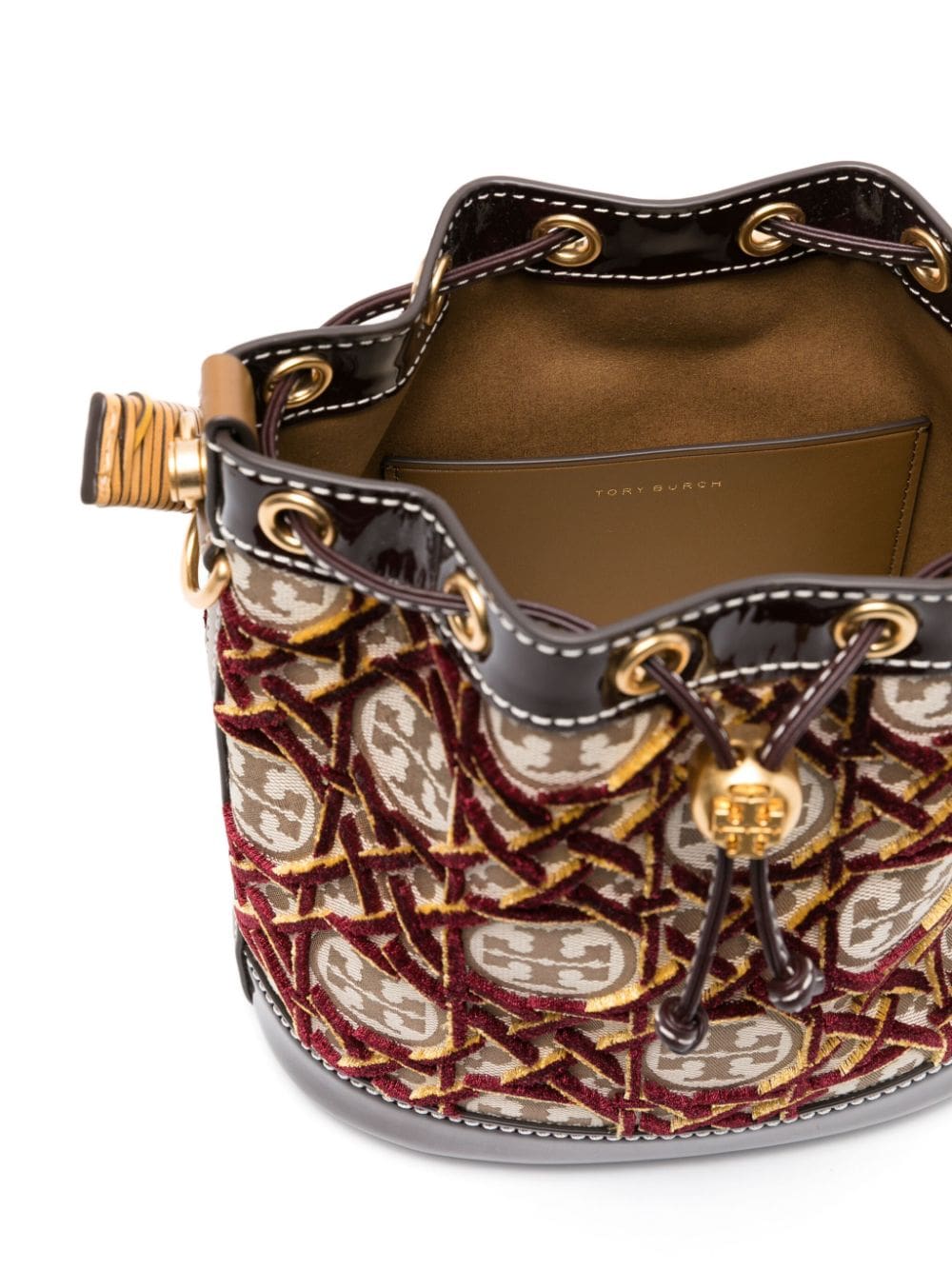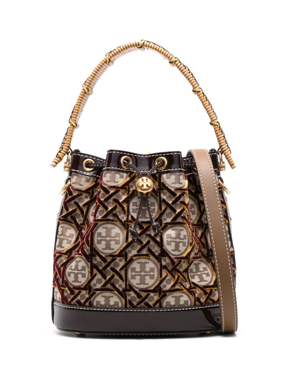 Descendant of a line of bucket bags, this two-way iteration displays Tory Burch's Double T printed monogram on a drawstring construction. It's distinction is enhanced by velvet mustard and burgundy fil coupé detailing.