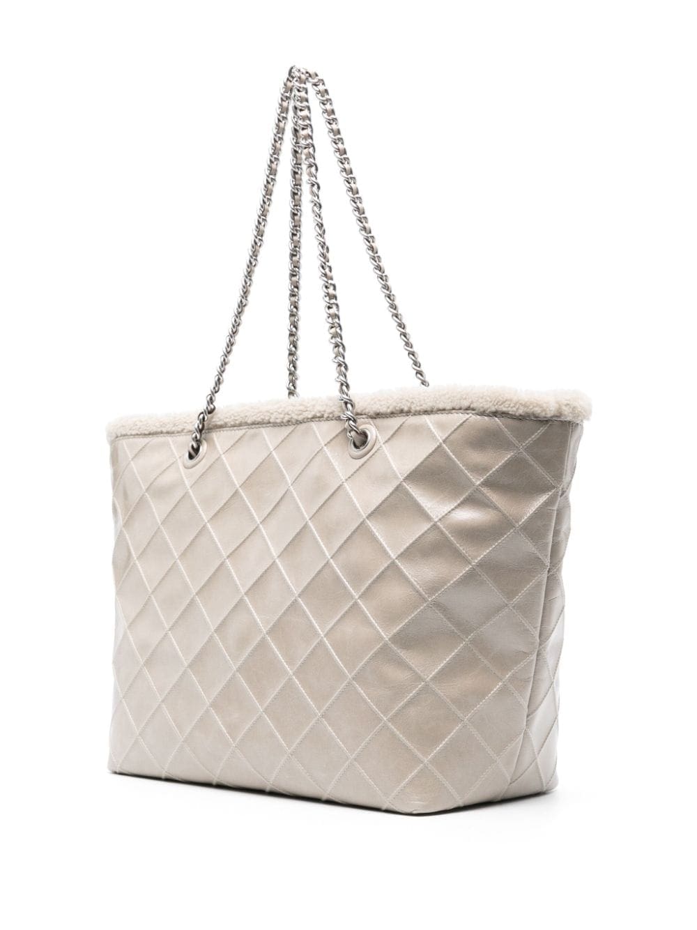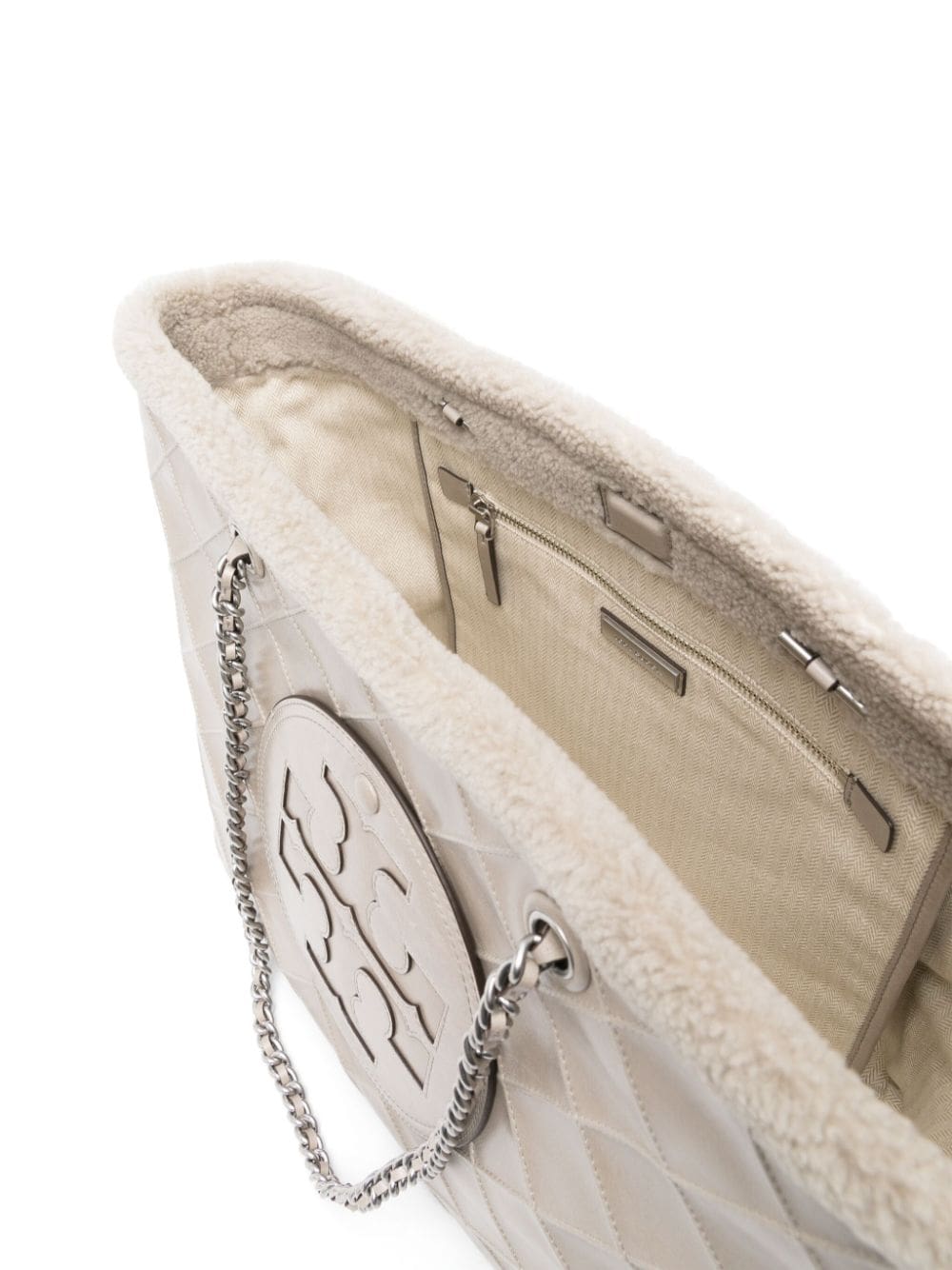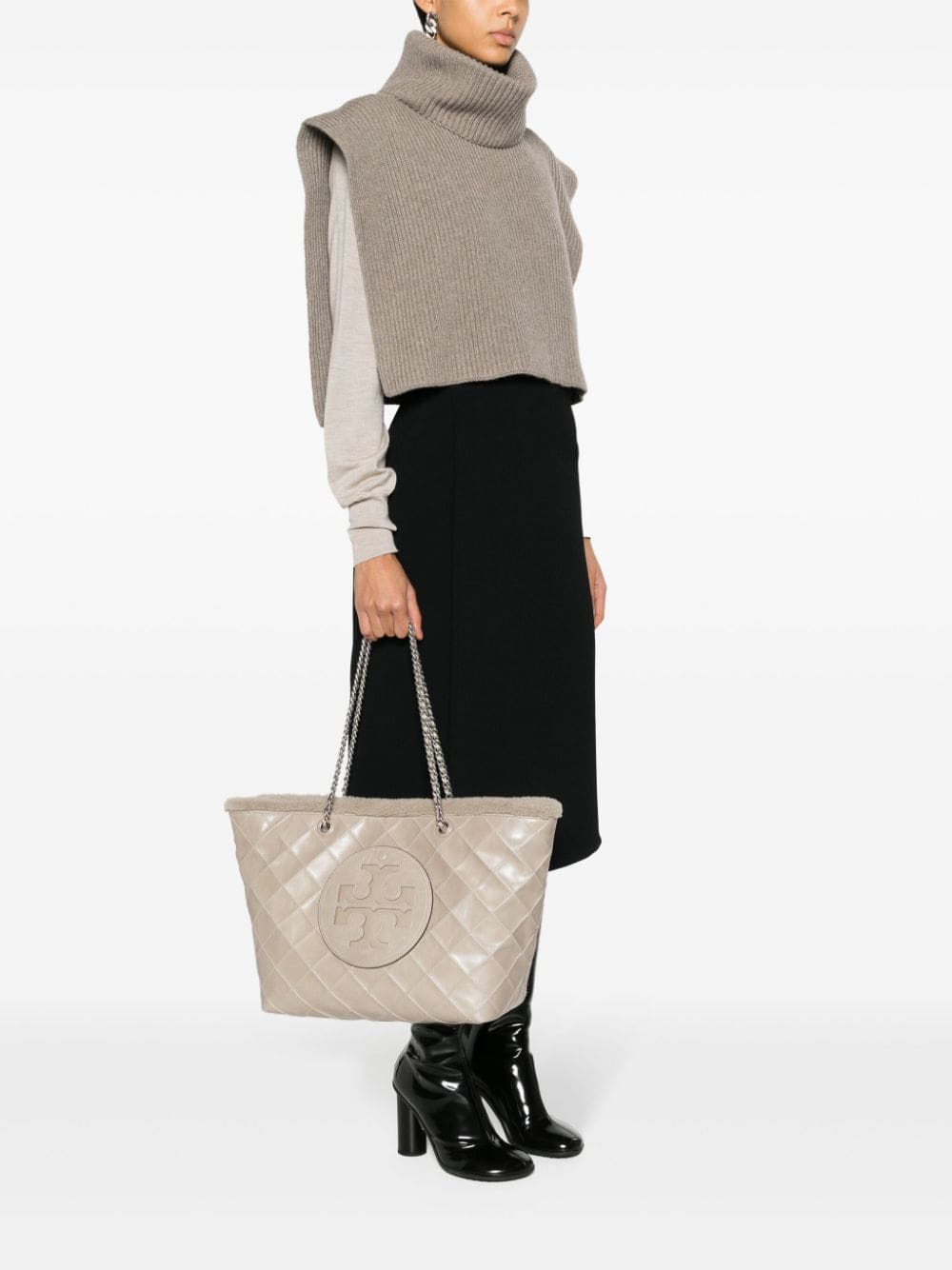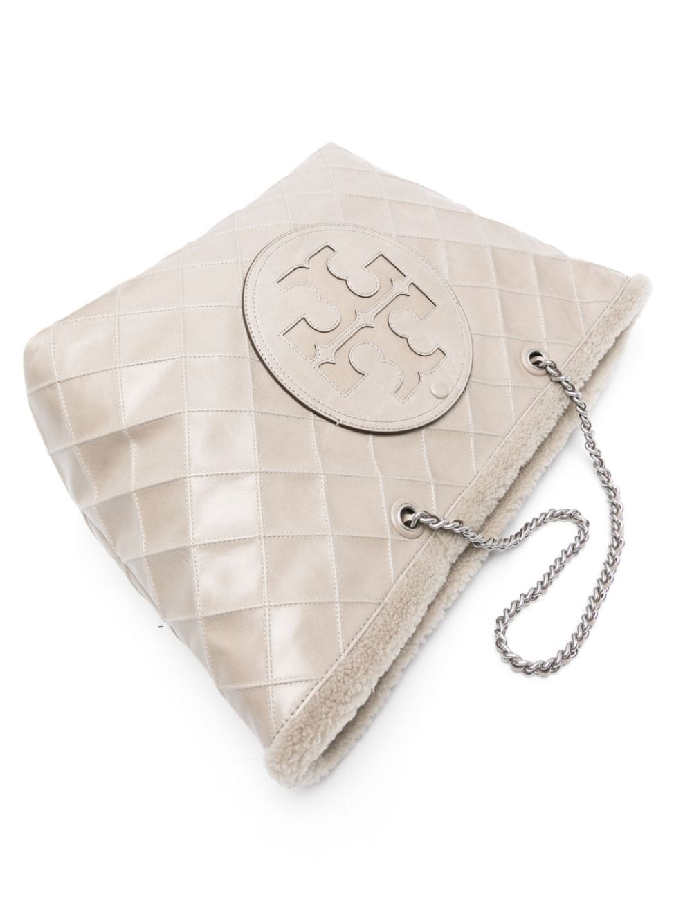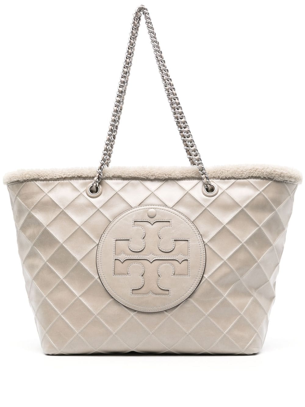 Tory Burch's Double T monogram was introduced in 2004 and takes inspiration from the work of Moroccan interior designer David Hicks. It's showcased as a tonal logo patch at the front of this light grey Ella tote bag.