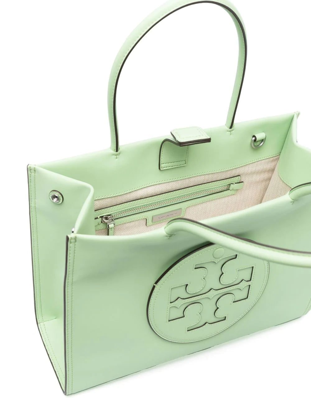 embossed-logo tote bag from TORY BURCH featuring mint green, embossed logo to the front, two rolled top handles, adjustable detachable shoulder strap, silver-tone hardware, main compartment and internal zip-fastening pocket.