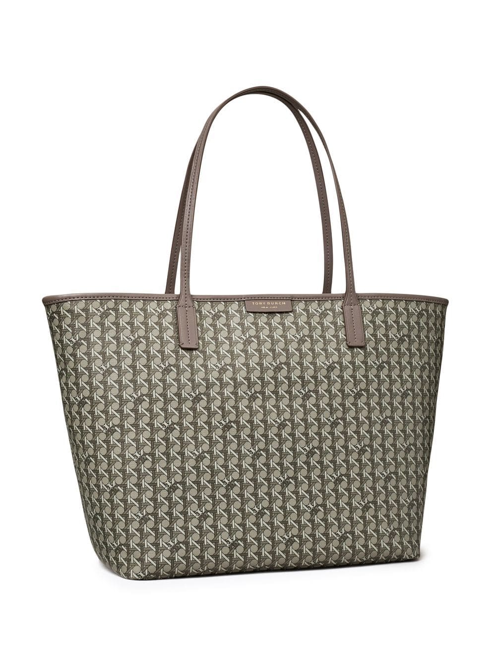 dark grey monogram print logo patch to the front top zip fastening circular top handles main compartment removable pouch