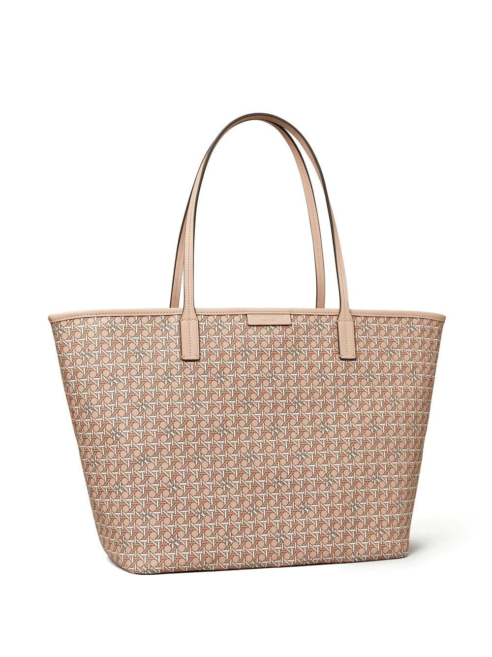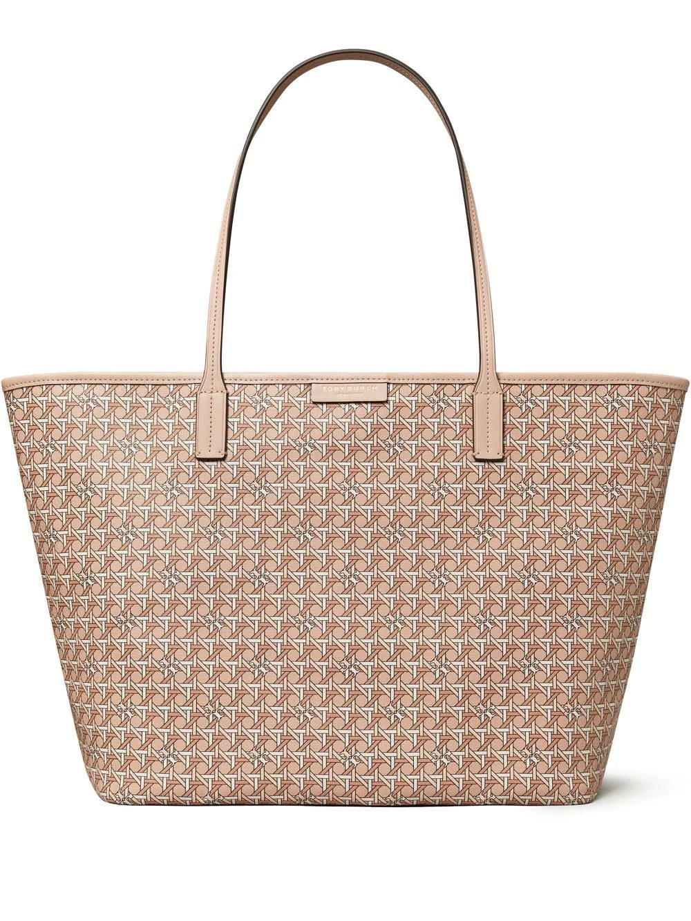 Ever Ready monogram tote from TORY BURCH featuring peach pink, monogram print, logo patch to the front, top zip fastening, circular top handles, main compartment and removable pouch.