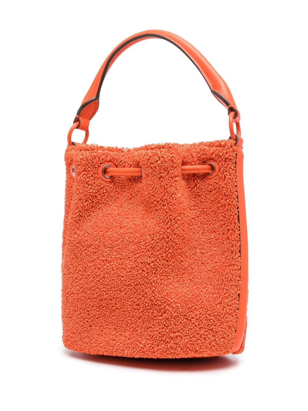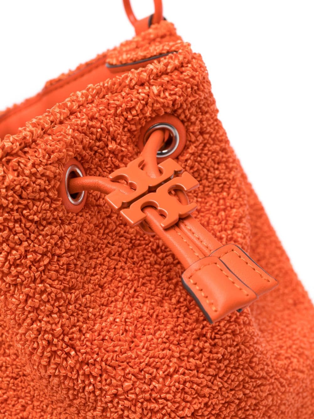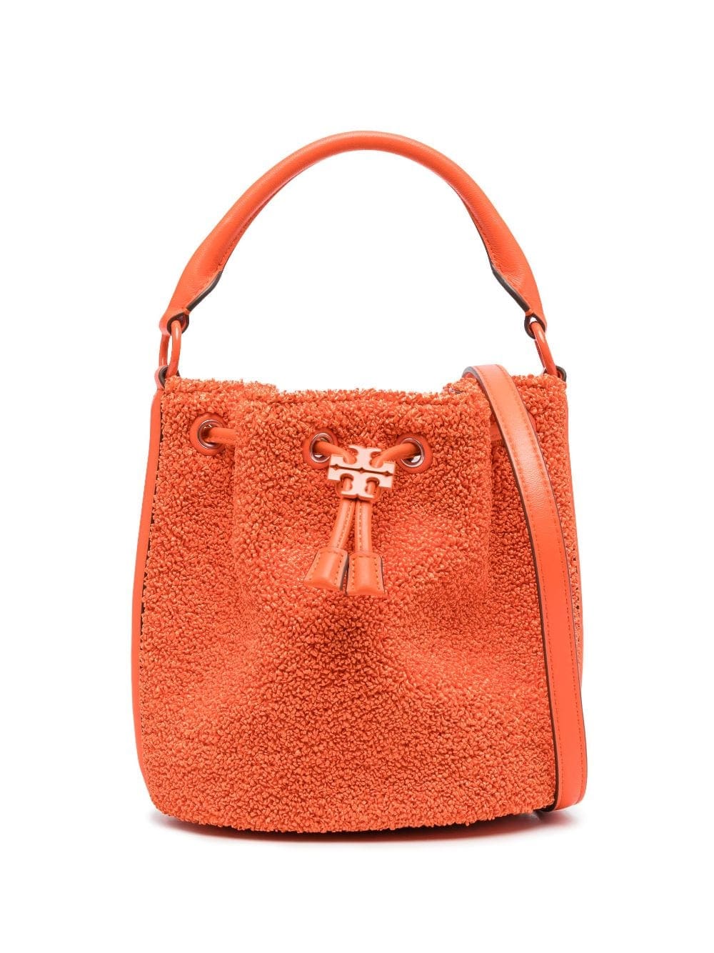 With a faux-shearling construction, this bucket bag from Tory Burch is presented in a bright orange hue and is emblazoned with a tonal iteration of the ubiquitous T logo plaque. It can be held by the top handle or worn crossbody, thanks to the detachable shoulder strap.