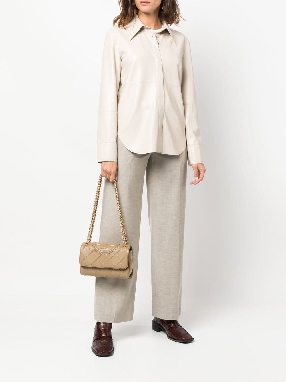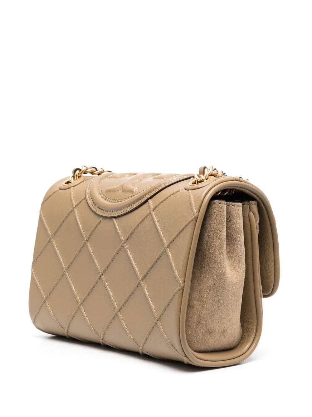Part of Tory Burch's Fleming line, this shoulder bag is updated in pebblestone-brown leather decorated with a diamond-patterned pintuck outer. An oversized Double T adorns the flap closure of this accessory for a signature branded finish.