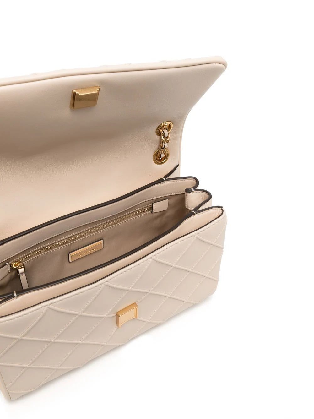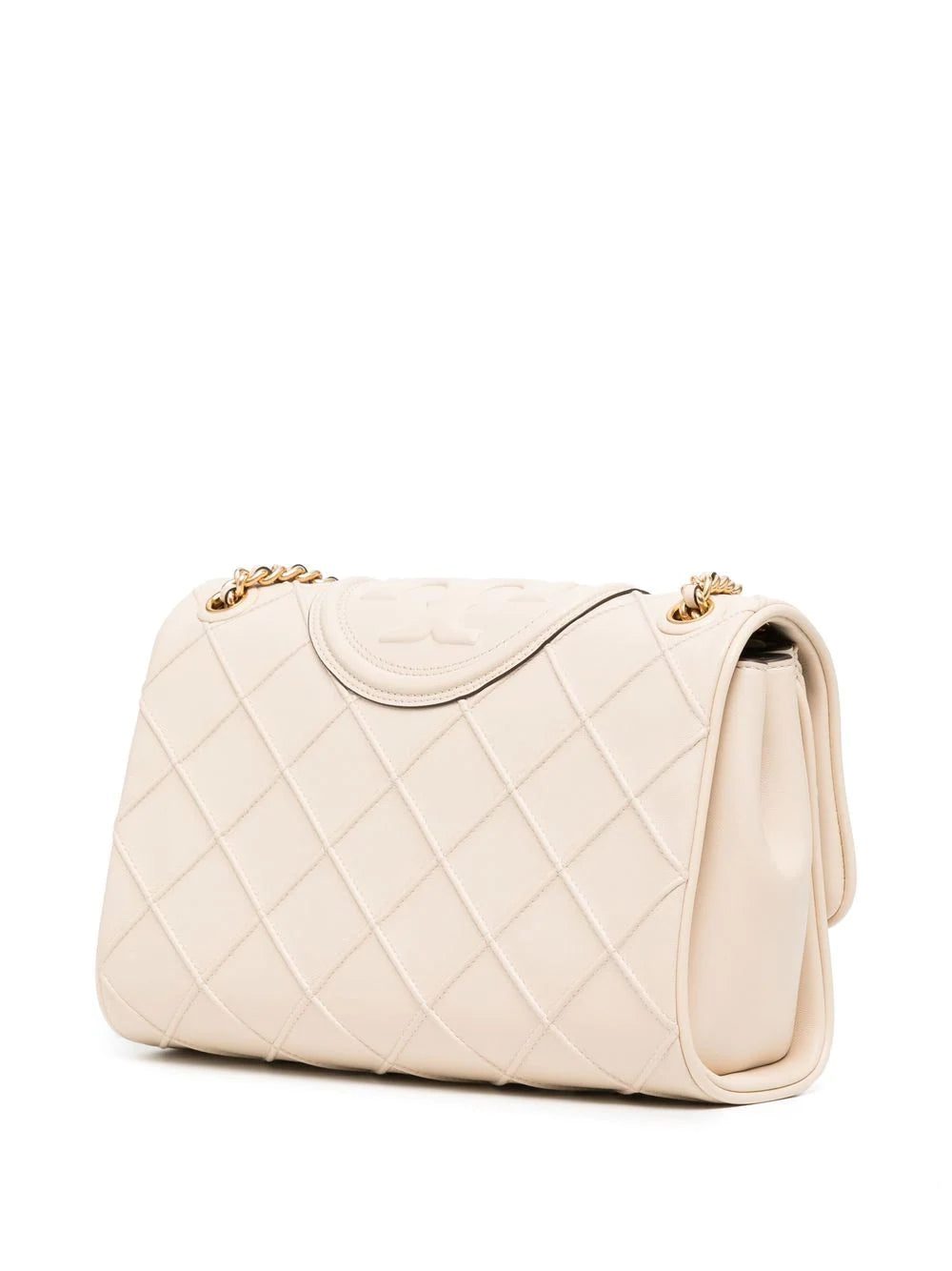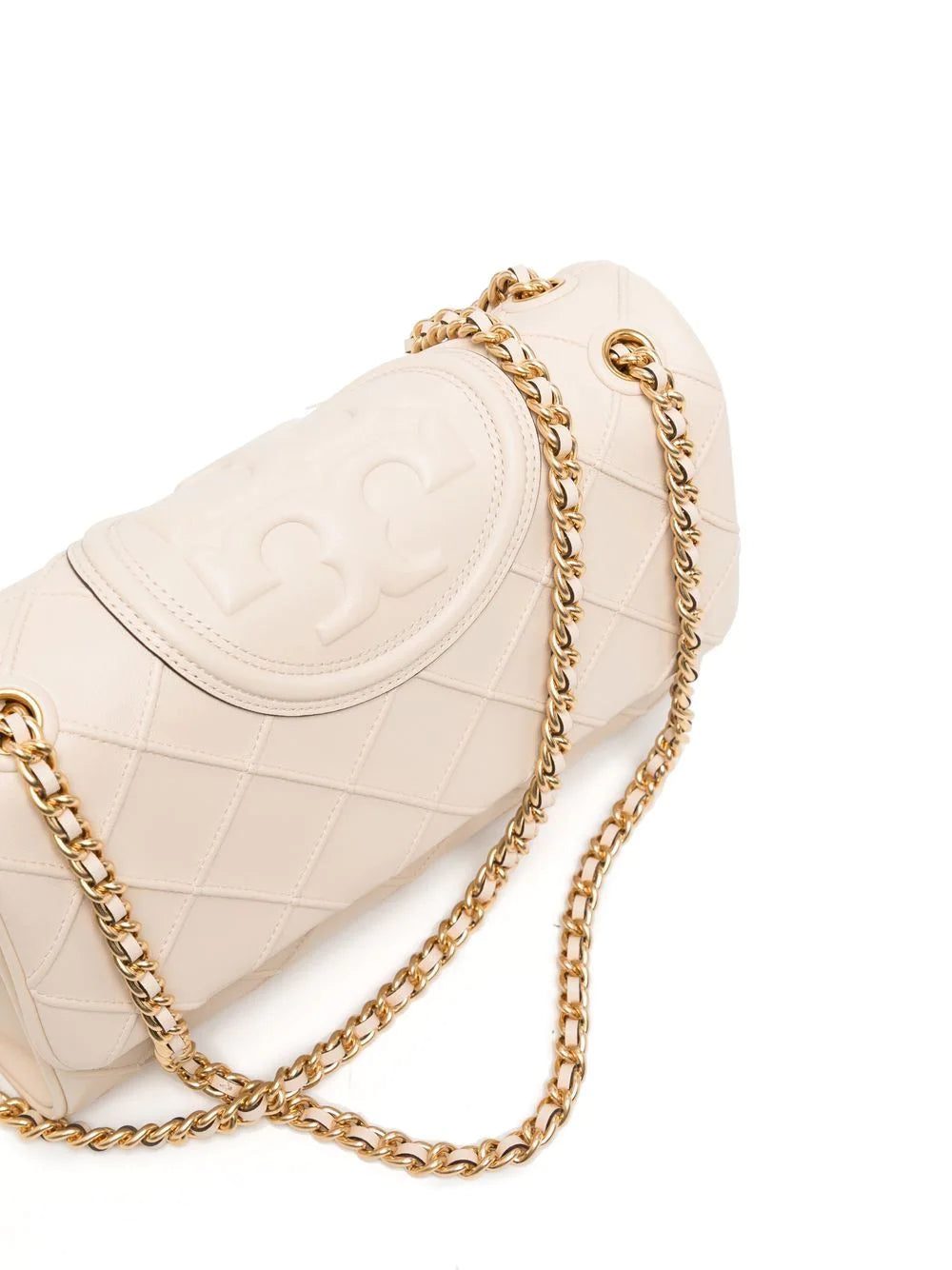 An ode to Tory Burch's craftsmanship, the brand introduces the Fleming shoulder bag for AW22. Appearing here in a versatile cream-white shade, it stands out with its diamond-pattern pintucks and oversized Double T logo in a bombé debossing.