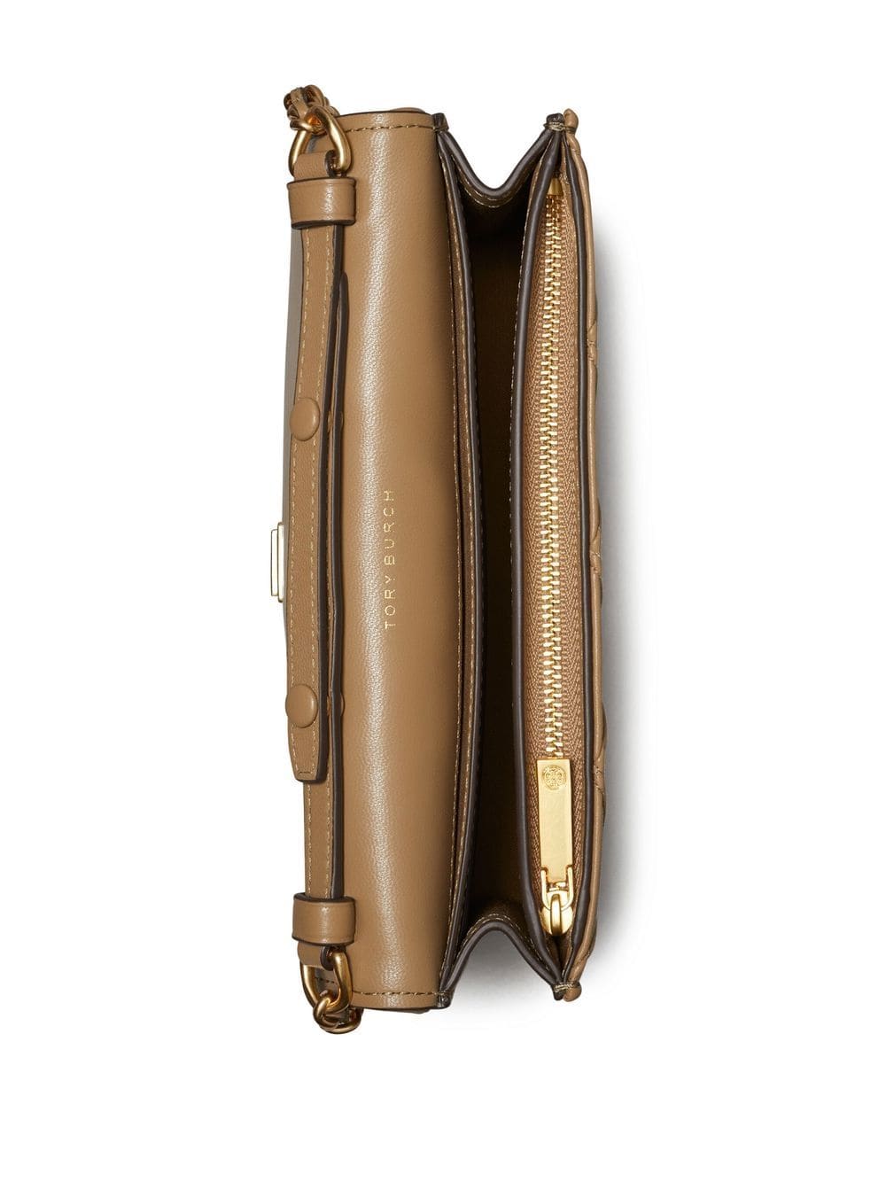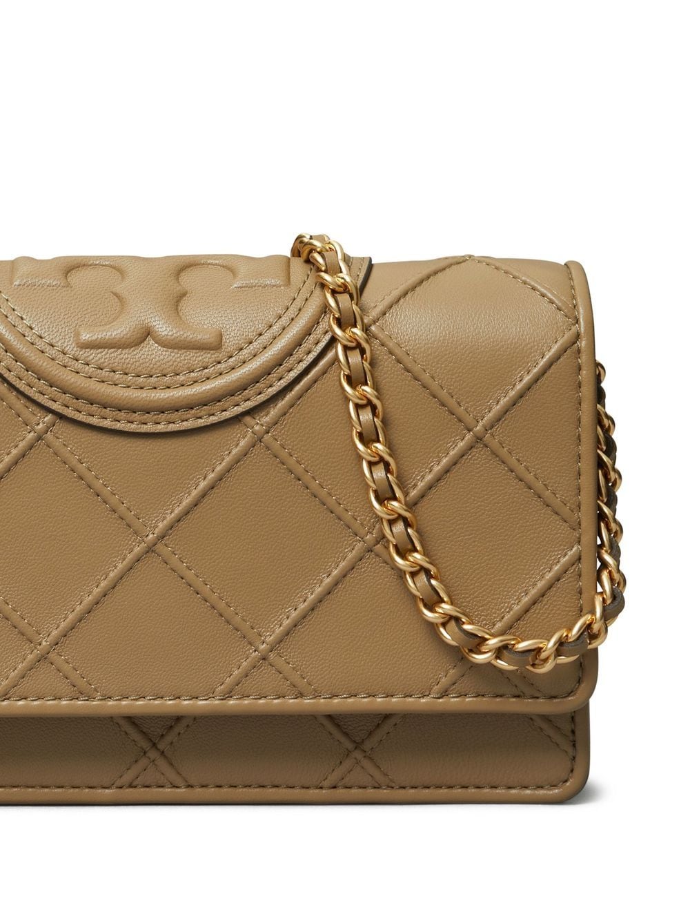 Fleming logo-embossed crossbody bag from TORY BURCH featuring leather, signature Double T motif, diamond pattern, pintuck detailing, gold-tone hardware, detachable leather and chain-link shoulder strap, foldover top with magnetic fastening, internal zip-fastening pocket and pebblestone green.