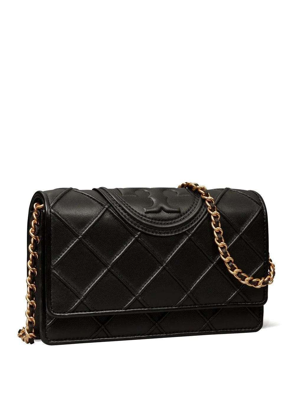 Fleming logo-embossed crossbody bag from TORY BURCH featuring black, leather, signature Double T motif, diamond pattern, pintuck detailing, gold-tone hardware, detachable leather and chain-link shoulder strap, foldover top with magnetic fastening and internal zip-fastening pocket.