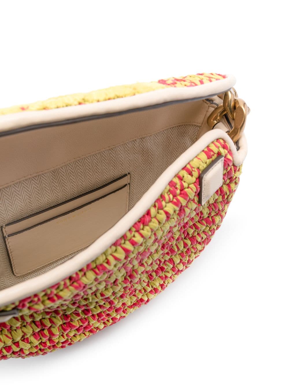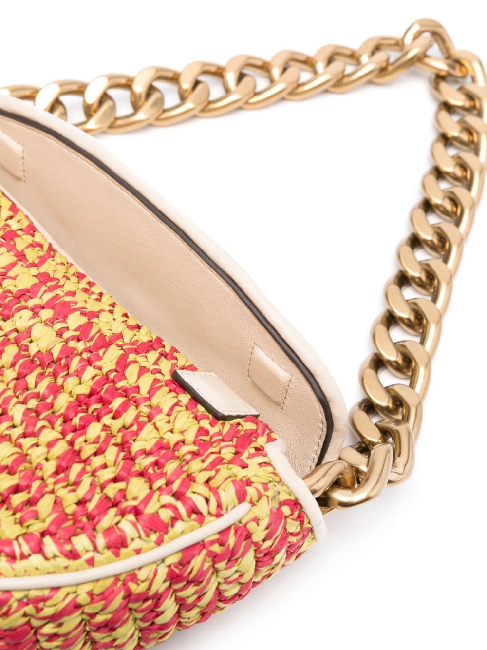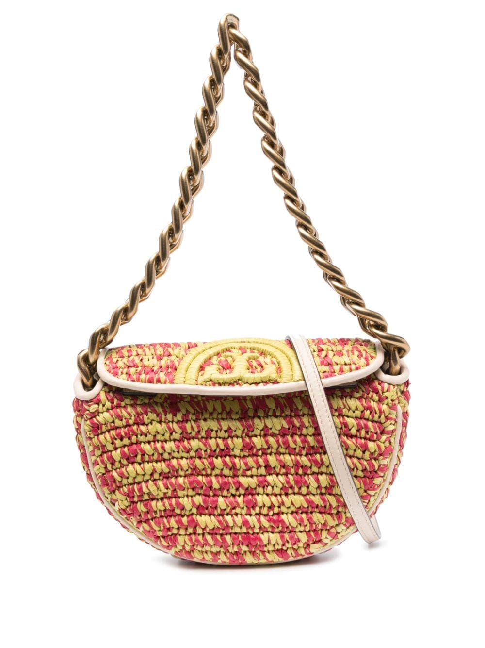 Tory Burch's Fleming bag is characterised by the Double T emblem that punctuates the front flap. This vibrant version is crafted from red and green hand-woven raffia to a structured half-moon design and fitted with a chunky chain-link shoulder strap. The interior is lined and equipped with slip pockets.