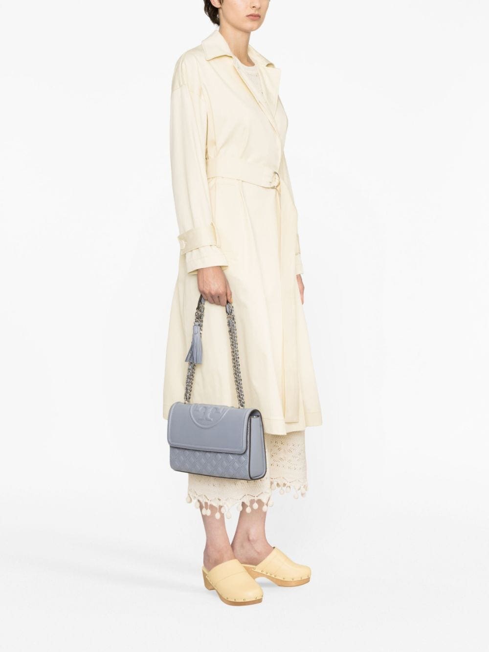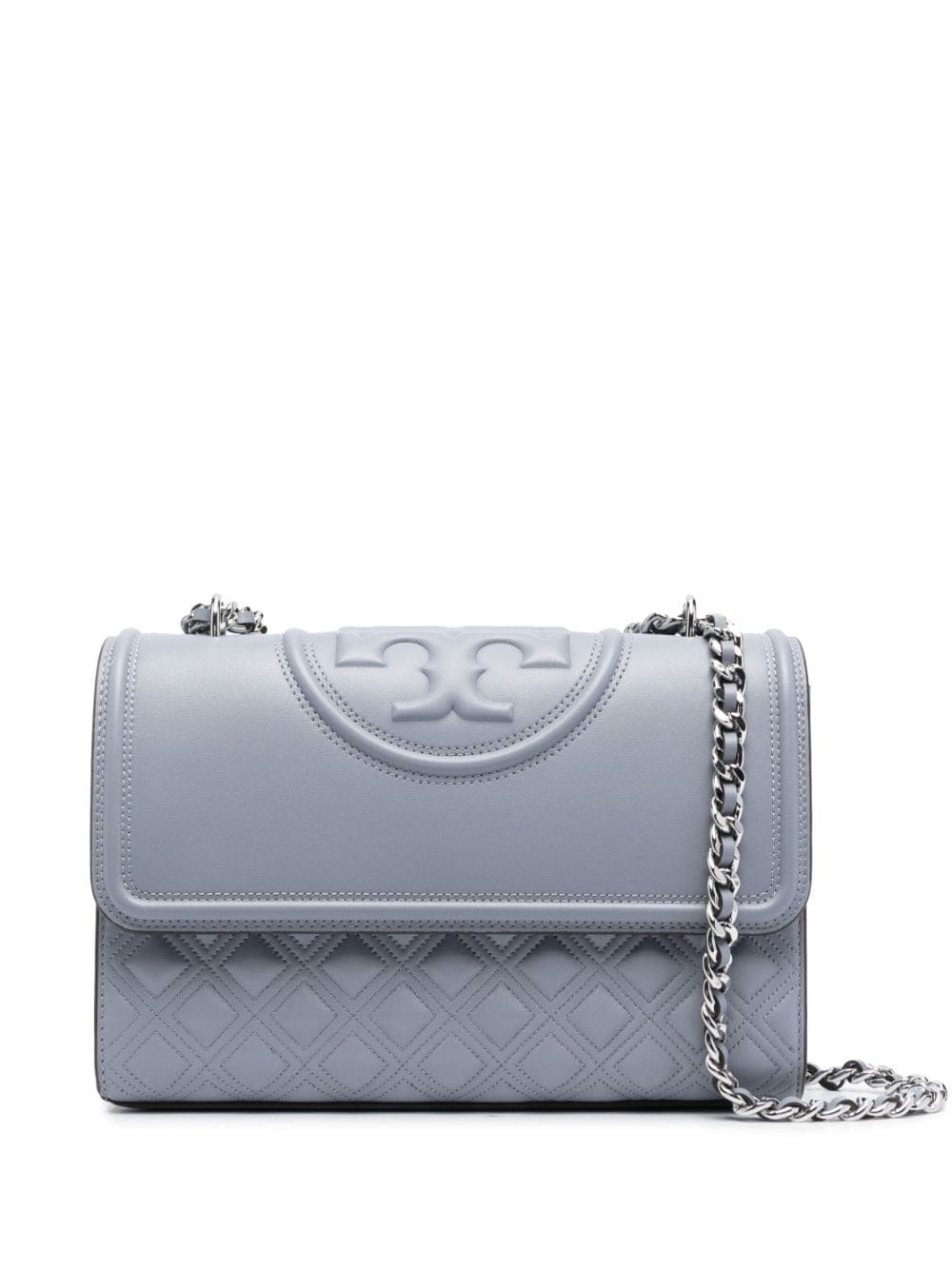 This powder-blue Fleming bag is rich in timeless details. A diamond-quilted body, embossed Double T logo and woven leather and chain-link shoulder strap make for enduring appeal.