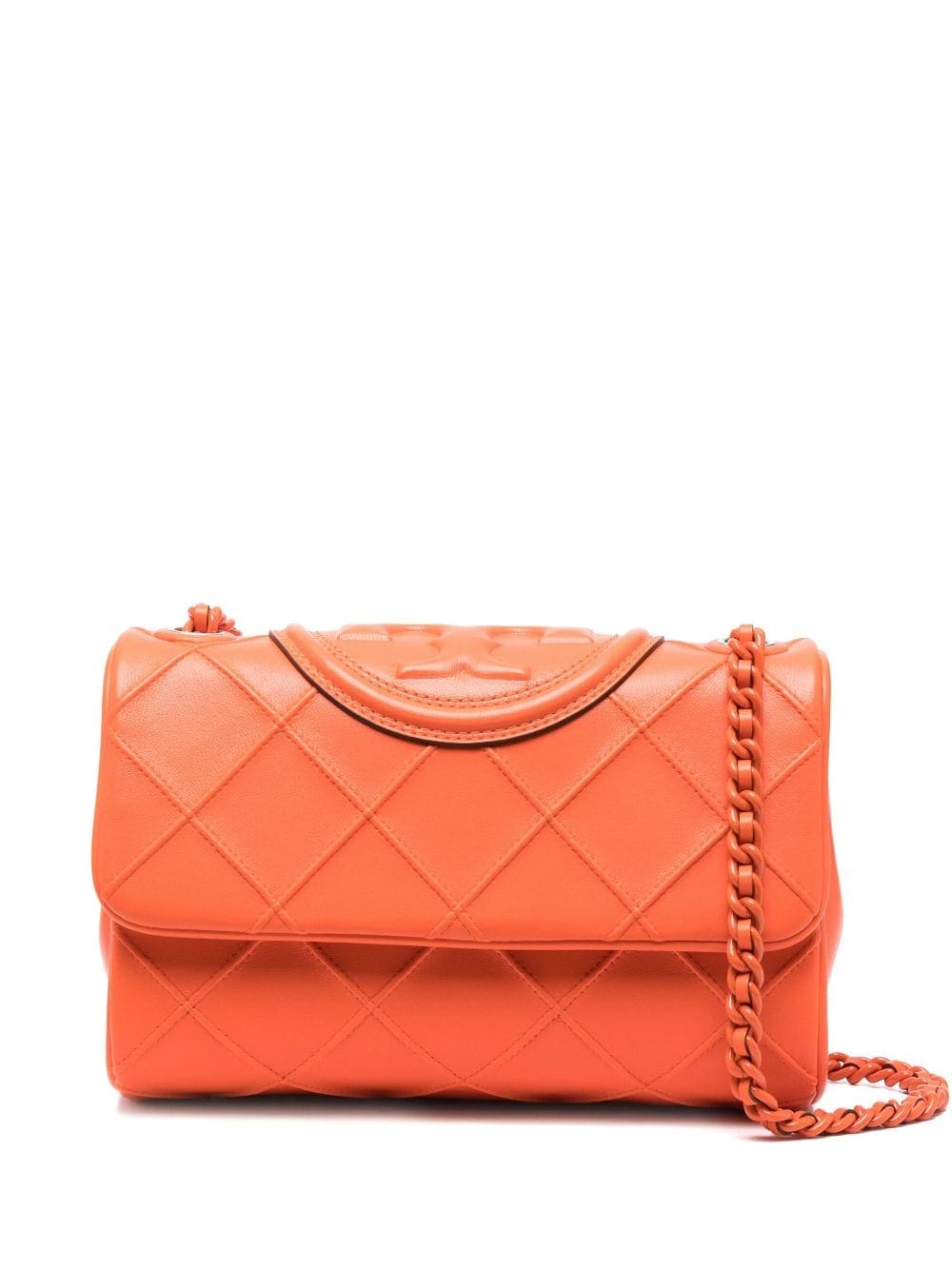Tory Burch's Fleming bag is characterised by the Double T emblem that rests atop the front flap. This vibrant version is crafted from red calf leather and fitted with a convertible chain strap. The compartmentalised interior is lined and equipped with slip pockets.