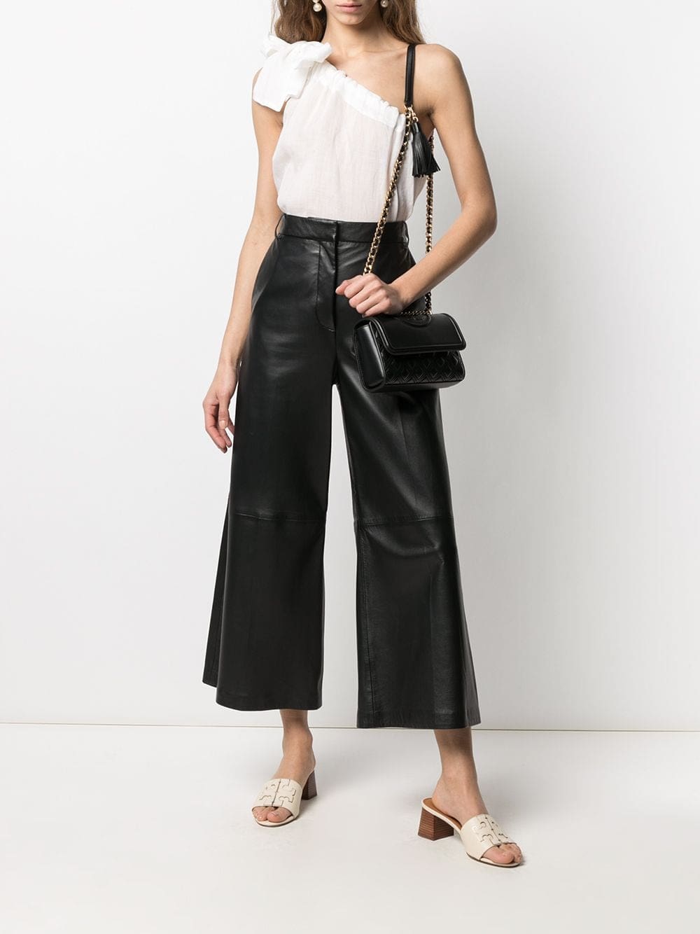 Black leather logo embossed quilted shoulder bag from TORY BURCH featuring embossed logo to the front, quilted, gold-tone hardware, tassel detail, leather and chain-link shoulder strap, foldover top, magnetic fastening, internal zip pocket and internal logo patch.
