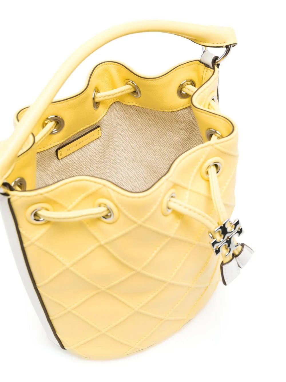 Fleming Soft leather bucket bag from TORY BURCH featuring lemon yellow, white, calf leather, logo plaque, drawstring fastening, single circular top handle, single shoulder strap, main compartment and full lining.