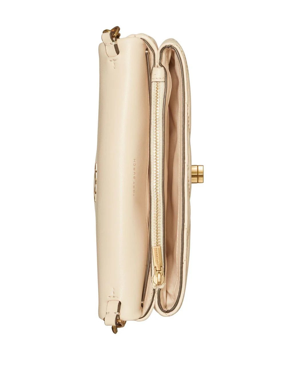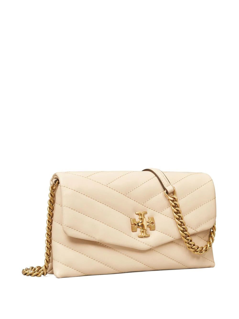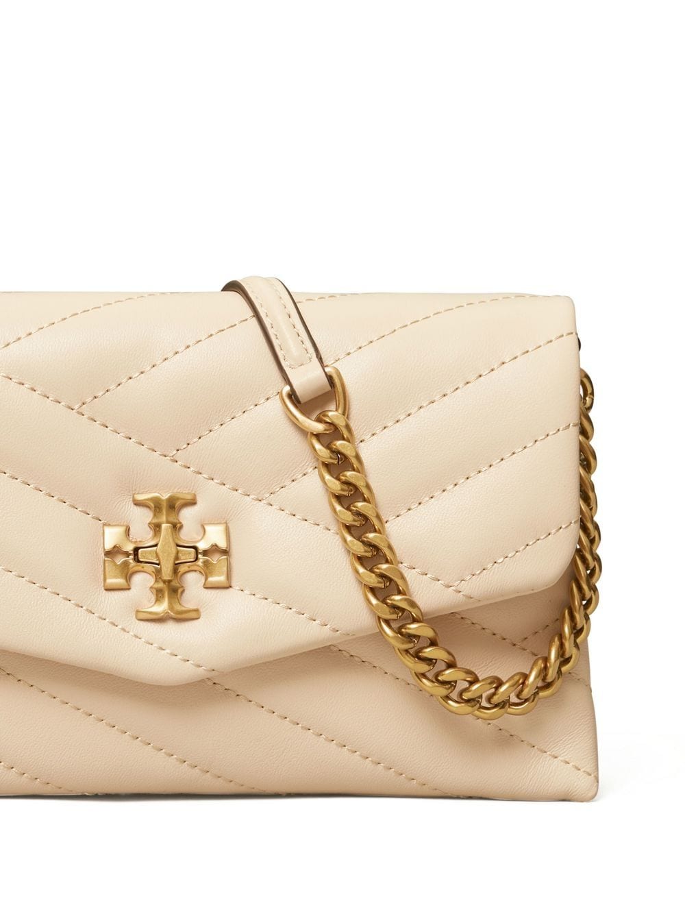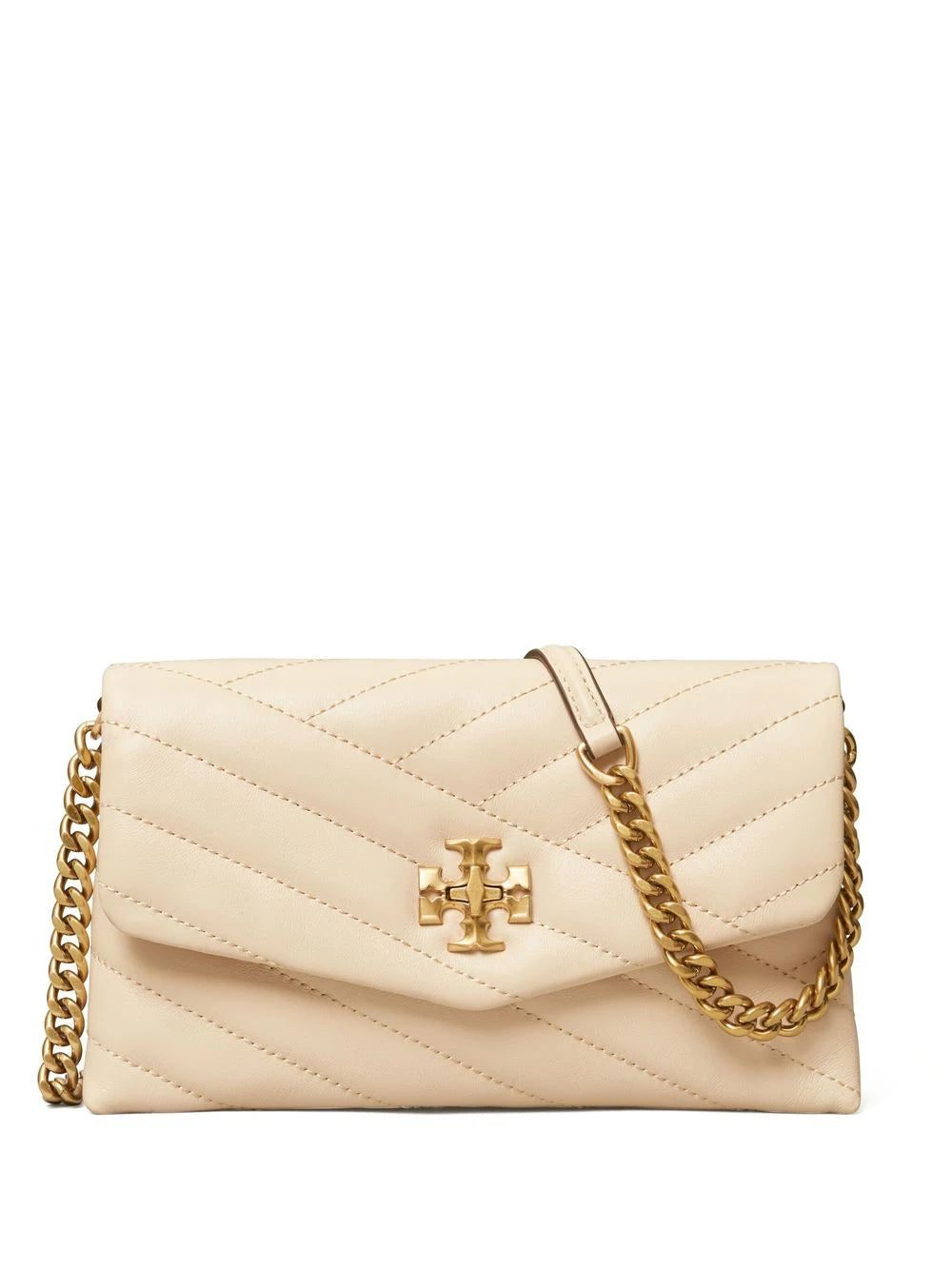 Kira chevron-quilted mini bag from TORY BURCH featuring gold-tone hardware, gold-tone logo plaque, quilted finish, leather and chain-link shoulder strap, twist-lock closure, foldover top, main compartment, internal zip-fastening pocket, new cream and leather.