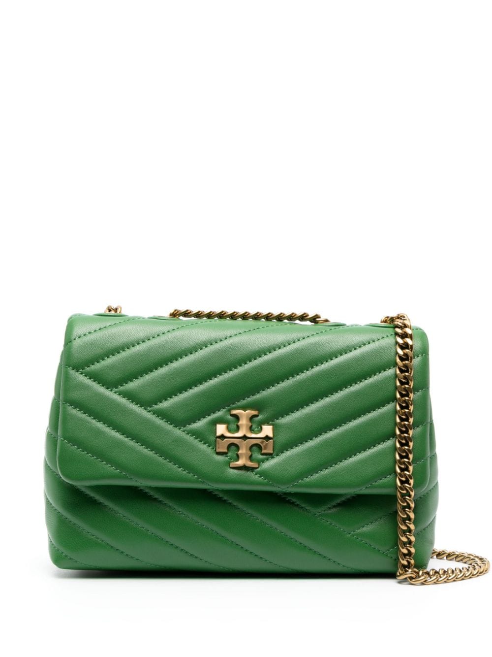 This version of the small Kira bag by Tory Burch is crafted from soft, quilted Nappa leather. It boasts a foldover top construction with multiple internal pockets. Thanks to the adjustable sliding chain-link strap, it can be carried across the body or over the shoulder. The recognisable Double T motif, featured in every Tory Burch bag, completes the piece.