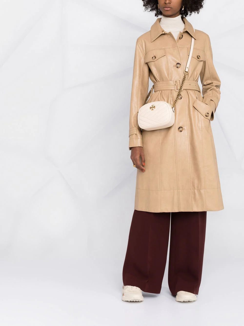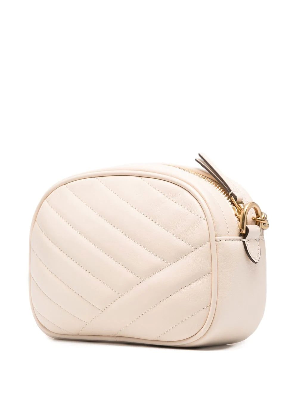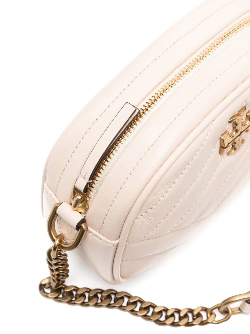 Kira quilted camera bag from TORY BURCH featuring cream white, faux leather, quilted finish, gold-tone hardware, quilted, top zip fastening and leather and chain-link shoulder strap.