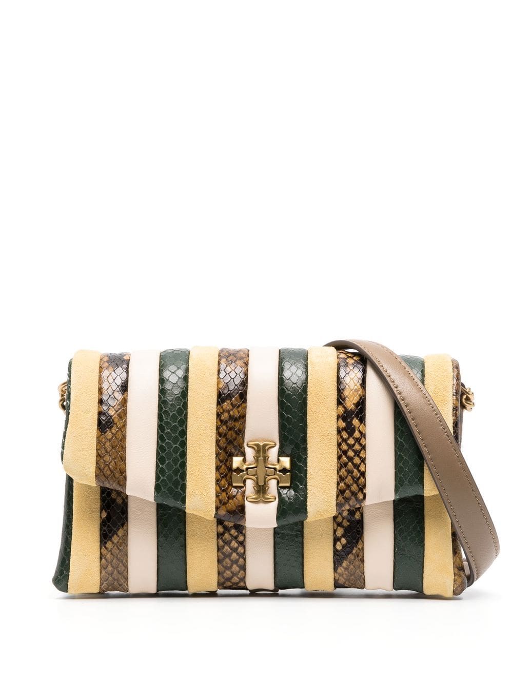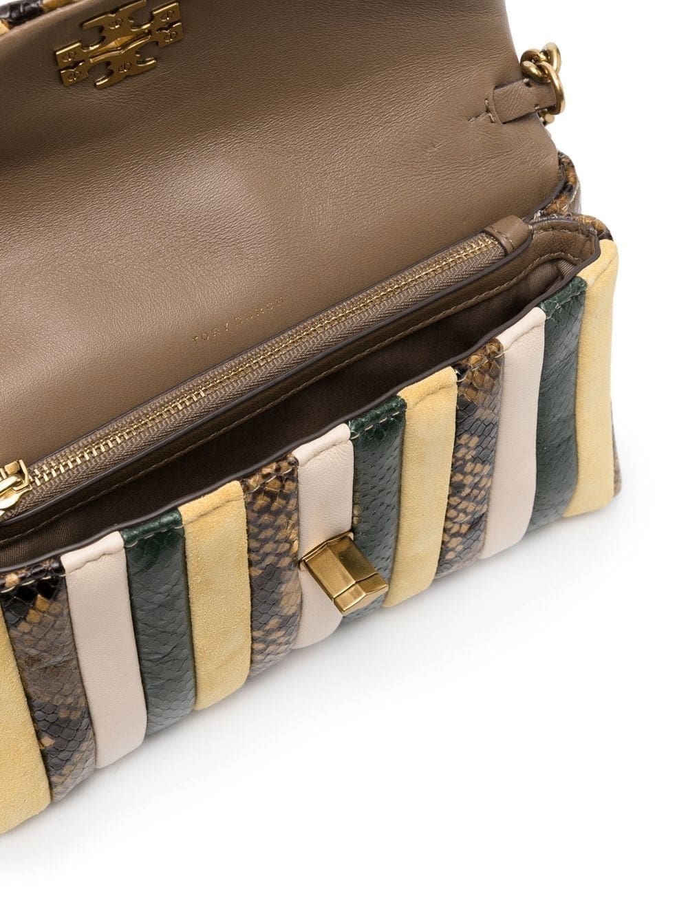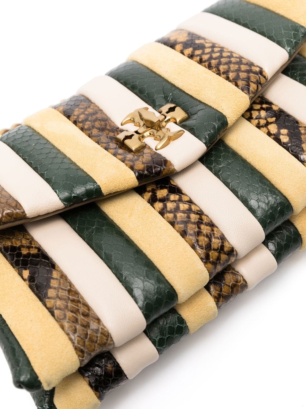 butter yellow/multicolour calf leather vertical stripe pattern python print gold-tone logo plaque twist-lock fastening foldover top leather and chain-link shoulder strap slip pocket to the rear gold-tone hardware internal zip-fastening pocket internal logo stamp