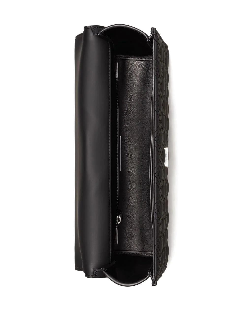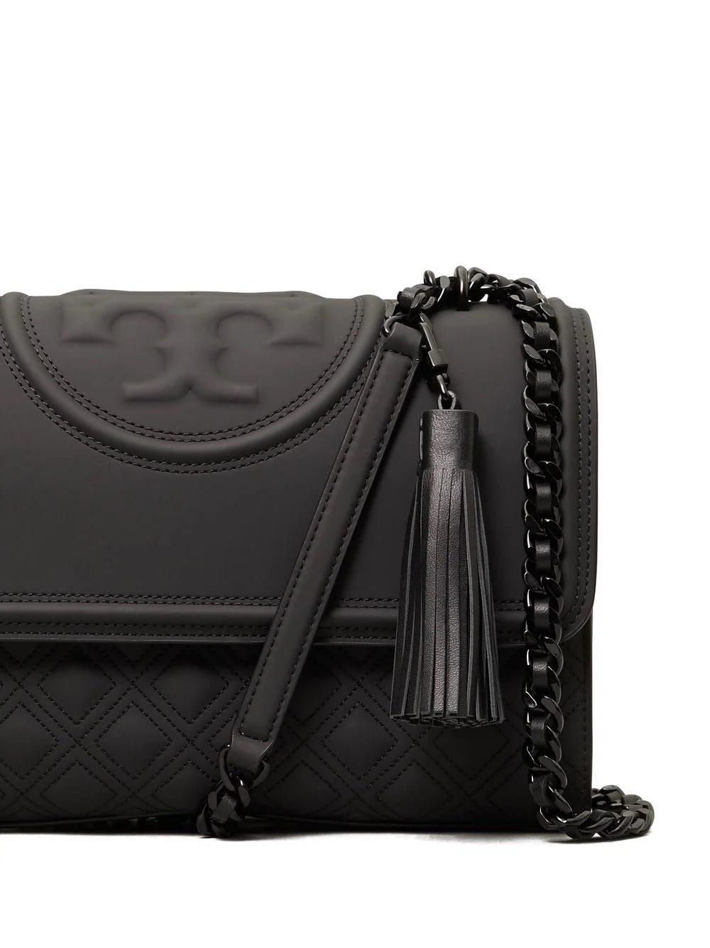leather logo-embossed shoulder bag from TORY BURCH featuring black, leather, embossed logo to the front, chain-link shoulder strap, front flap closure, front flap closure and main compartment.