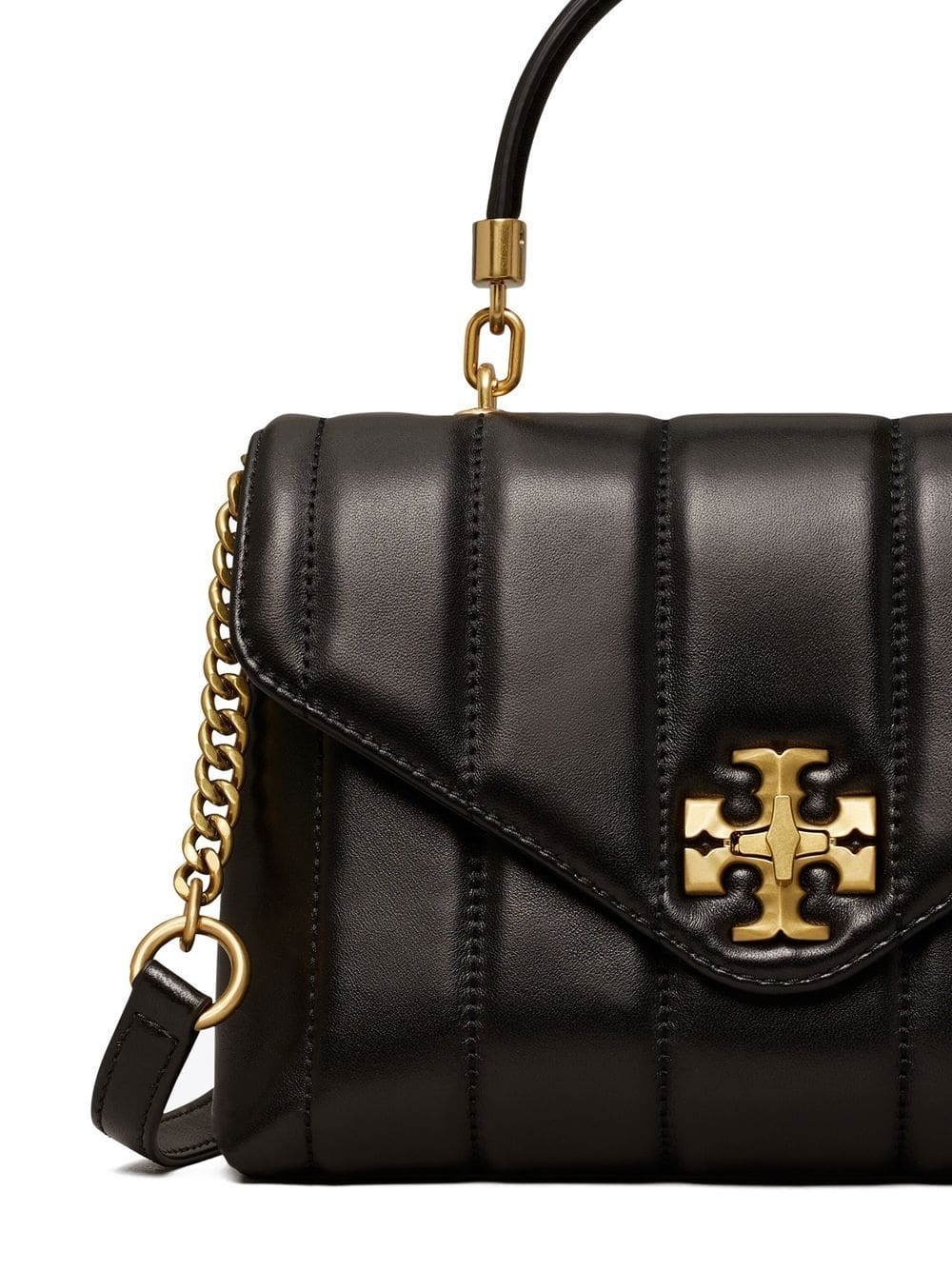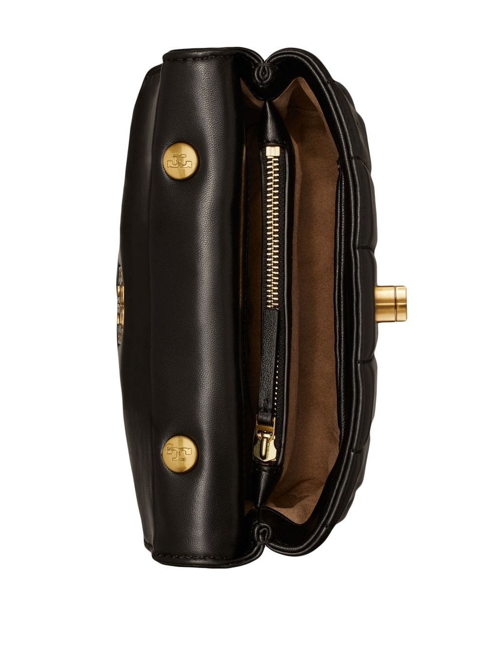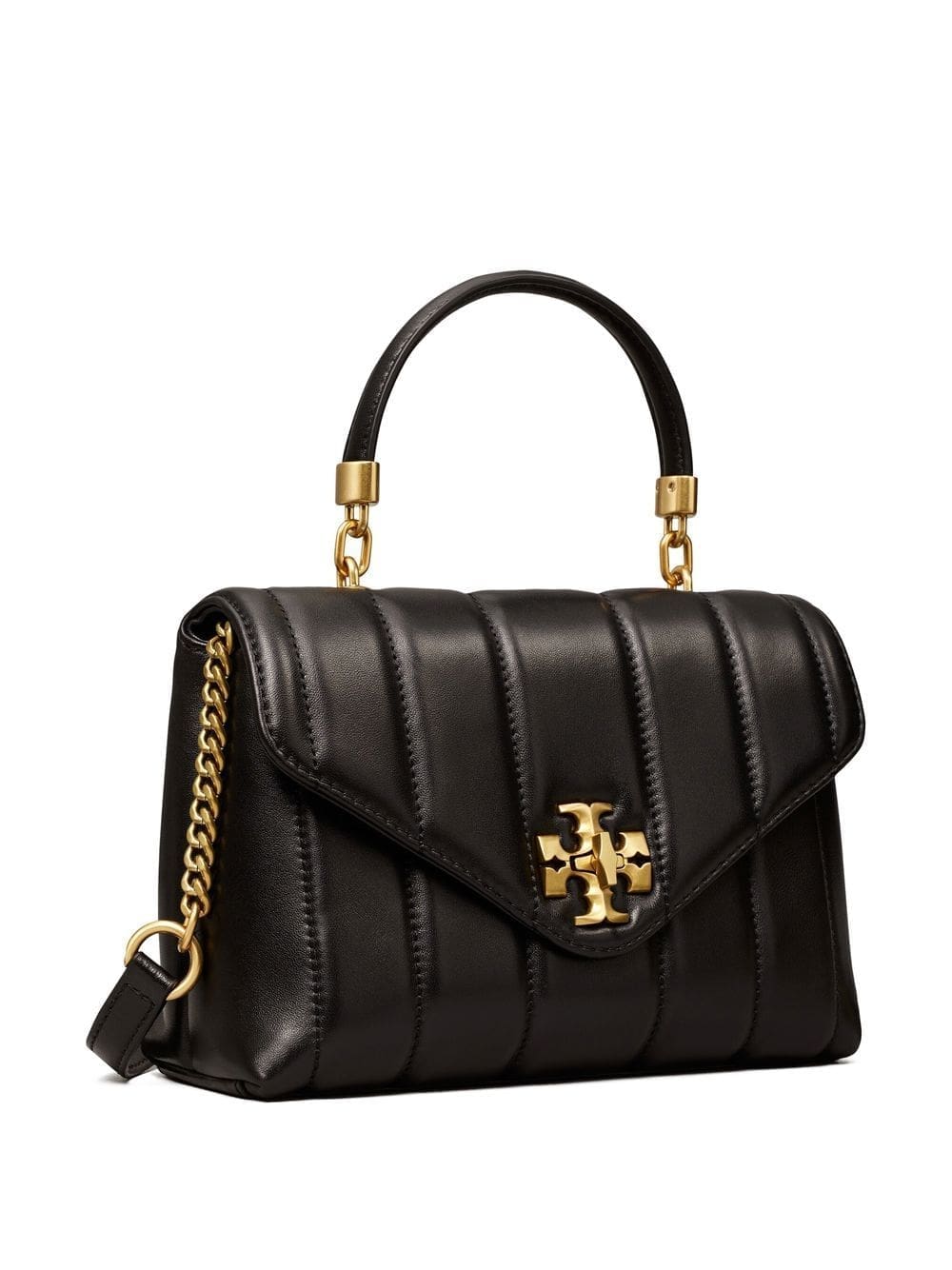 black leather quilted finish gold-tone logo plaque front flap closure single top handle leather and chain-link shoulder strap main compartment