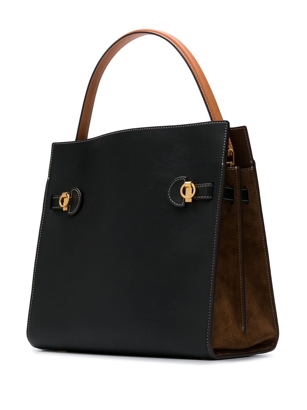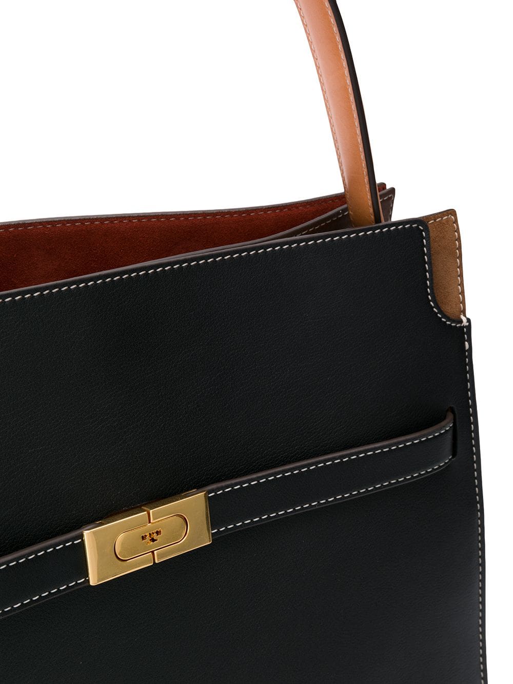 Black leather Lee Radziwill double tote from Tory Burch featuring a top handle, a snap button closure, a main internal compartment, an interior zipped compartment and gold-tone hardware.