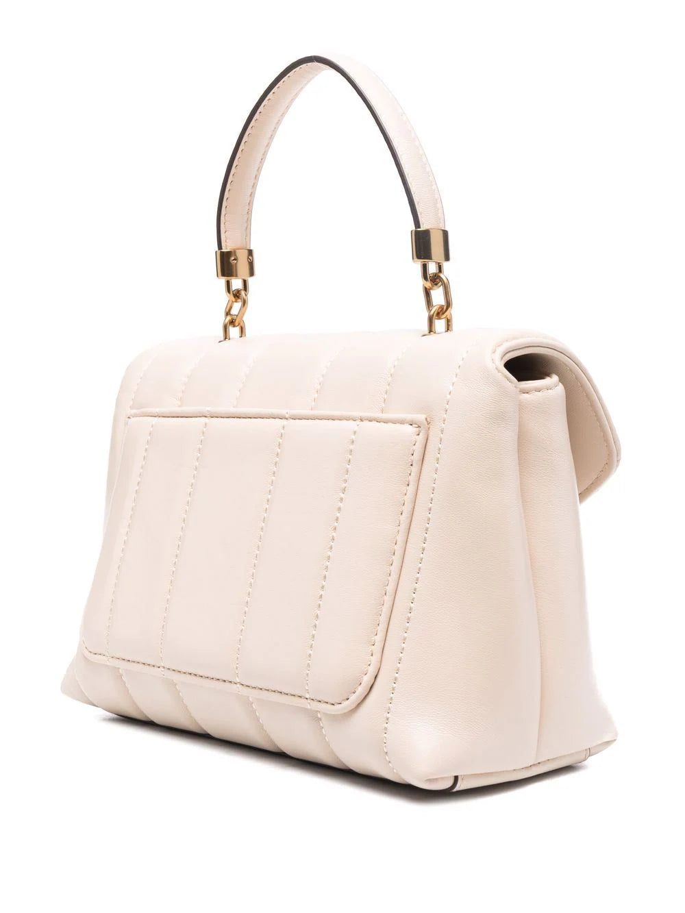 Off-white leather logo-plaque quilted leather satchel bag from TORY BURCH featuring quilted, logo plaque, foldover top, single shoulder strap and main compartment.