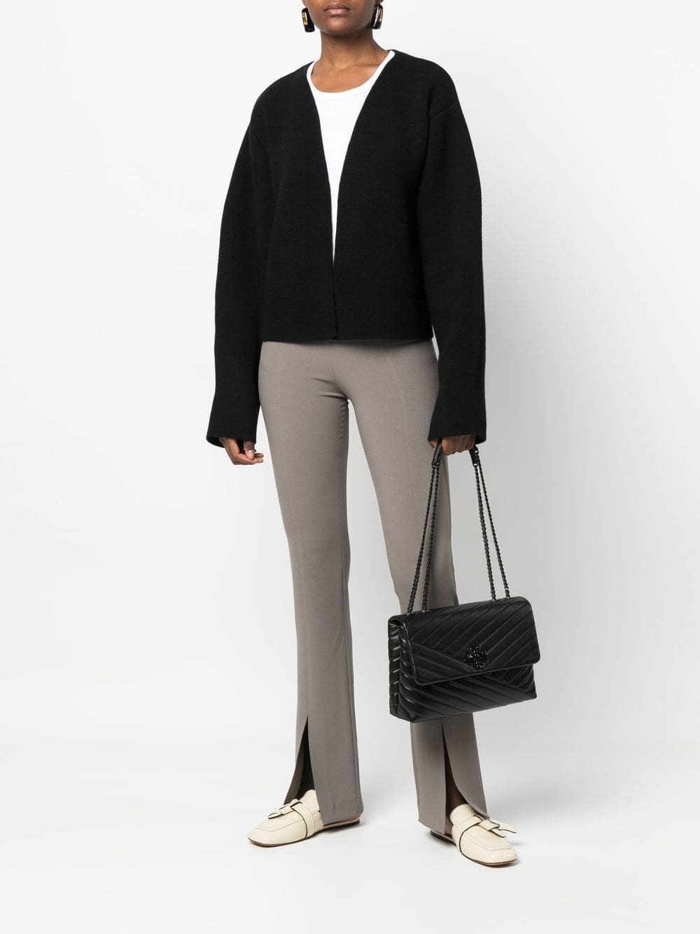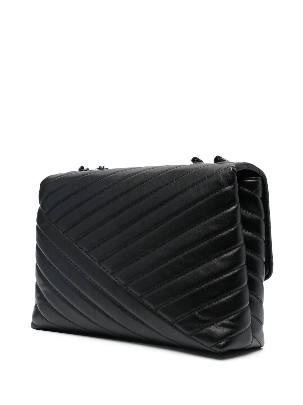 A signature silhouette for the brand, the Kira bag is included in Tory Burch's AW22 collection in an all-black iteration complete with tonal hardware. Adorned with a Double T plaque at the front, this accessory features double chain-link shoulder straps.