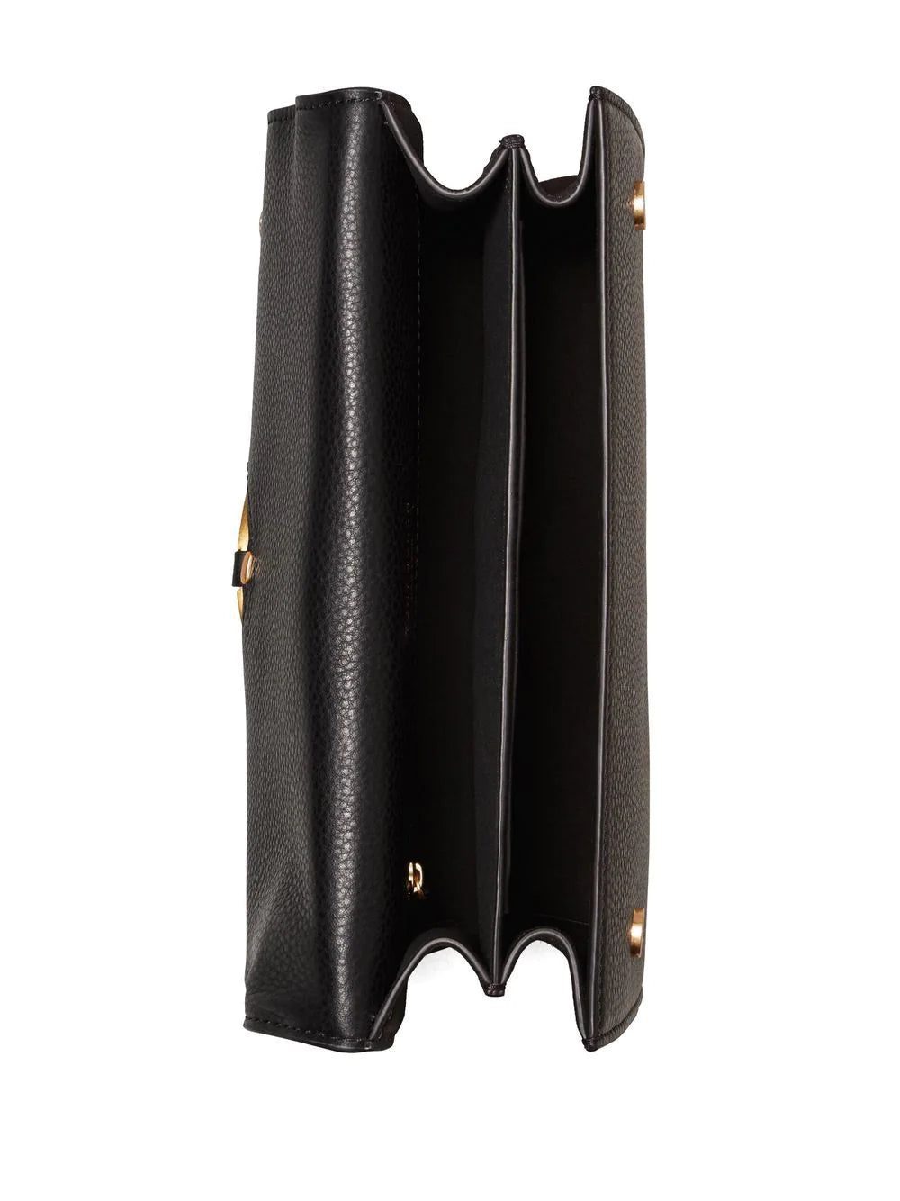logo plaque shoulder bag from TORY BURCH featuring black, leather, grained texture, gold-tone logo plaque, chain-link detailing, front flap closure, single shoulder strap and main compartment.