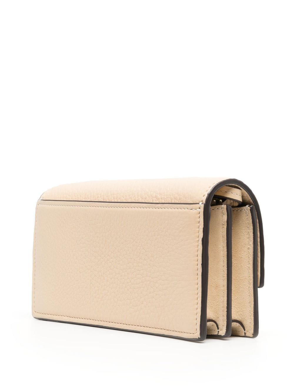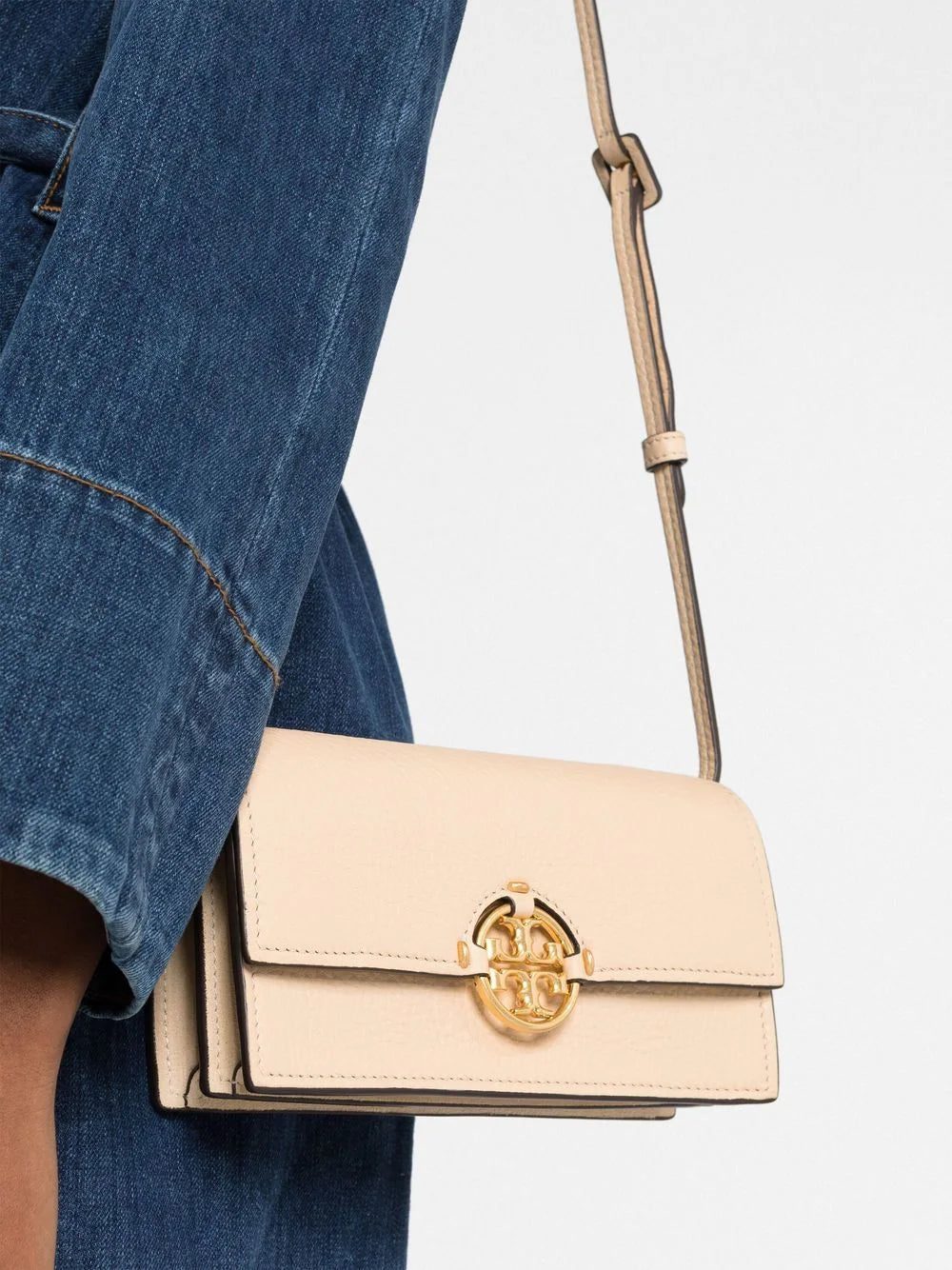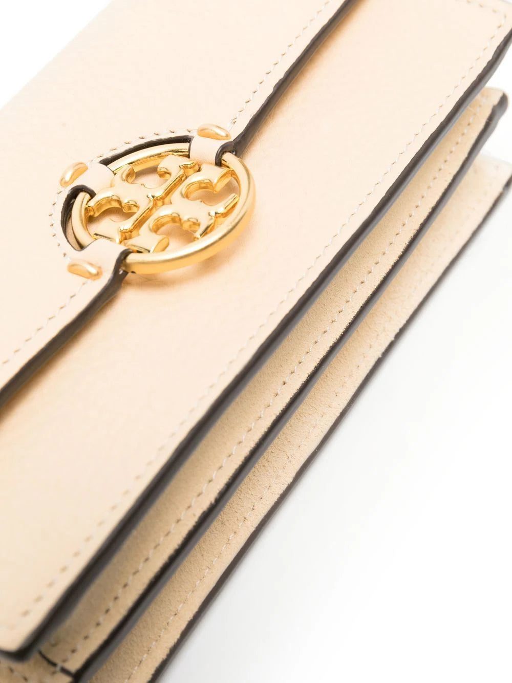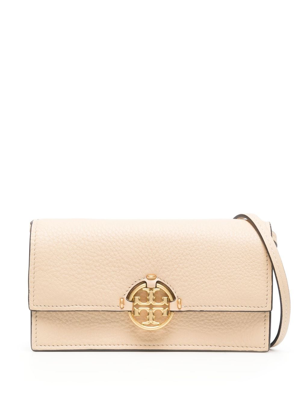 Known for using its serif T plaque as an identifier on each of its products, Tory Burch's Miller clutch bag is detailed with the gold-tone motif on the front. Crafted from beige leather, the compact accessory is suspended from a slim, detachable shoulder strap.