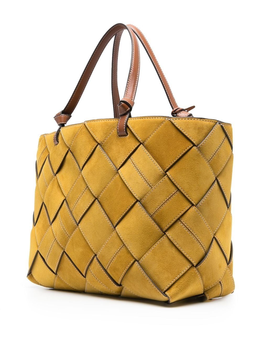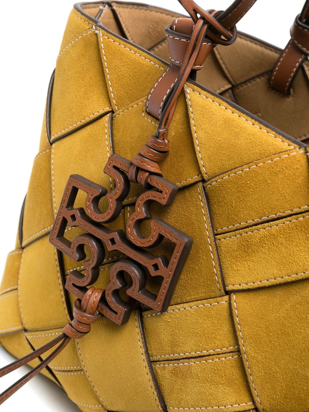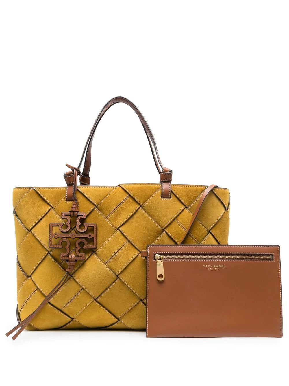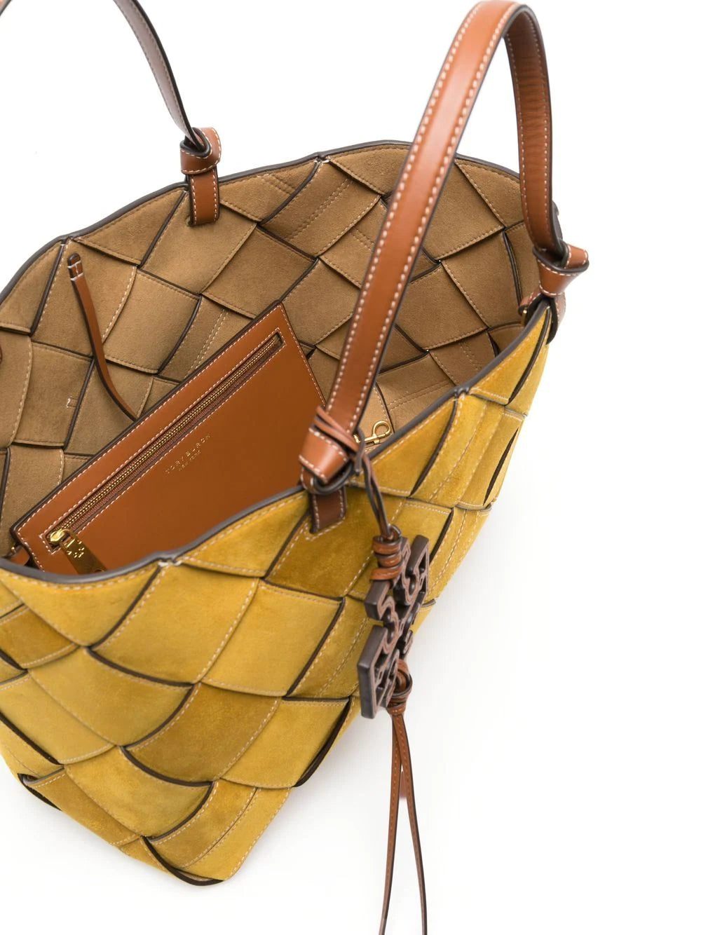 Miller woven tote bag from TORY BURCH featuring mustard yellow, calf suede, calf leather, interwoven design, logo tag, tie-top fastening, two top handles and main compartment.