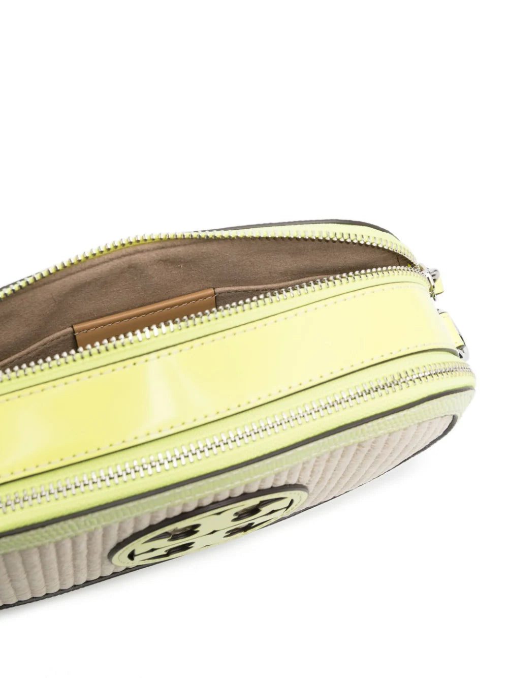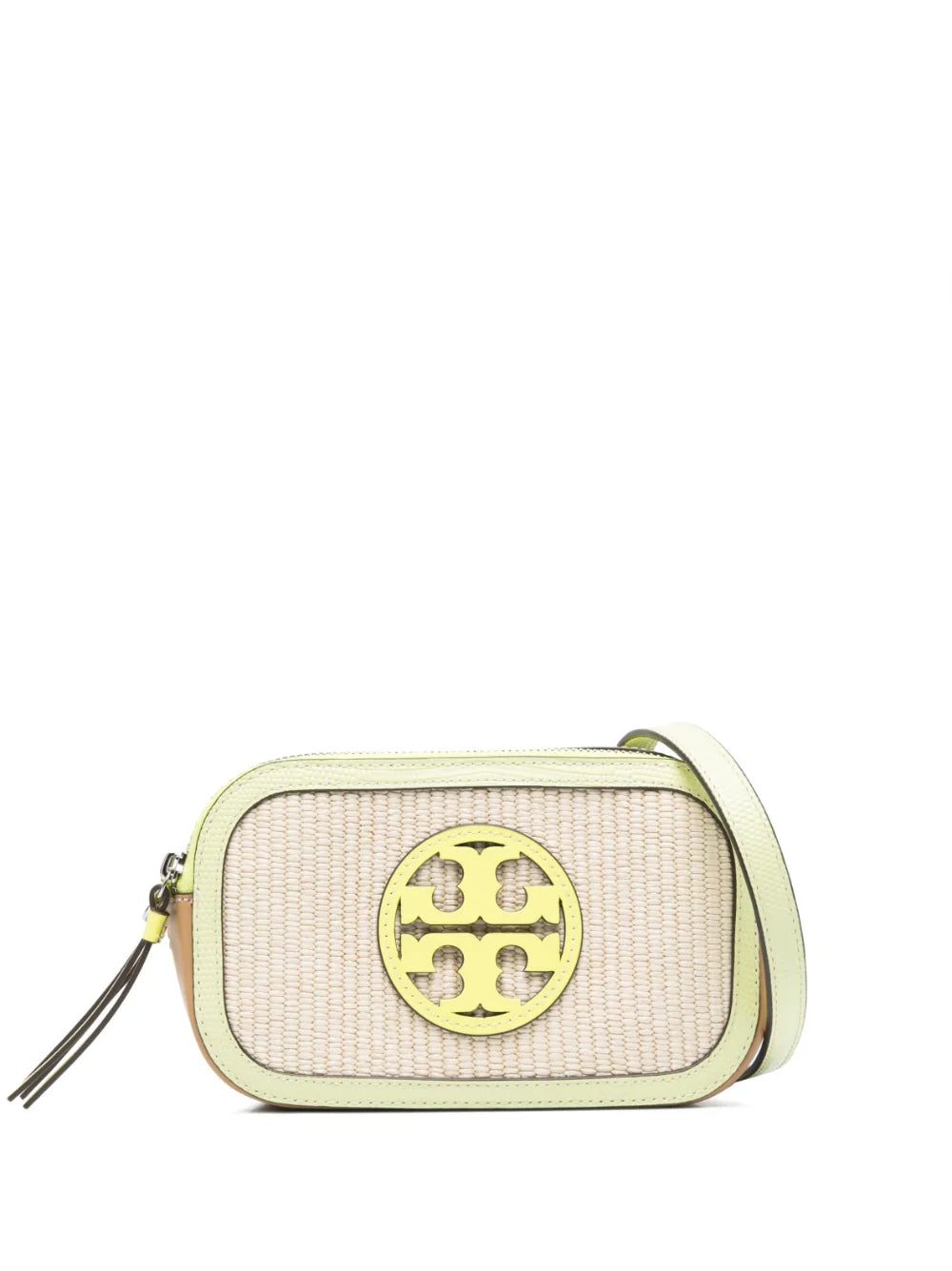 mini Miller contrasting raffia crossbody bag from TORY BURCH featuring light beige, lime green, raffia, leather, pebbled texture, woven raffia design, contrasting trim, leather trim, signature Double T motif, silver-tone hardware, internal logo patch, top zip fastening, adjustable detachable shoulder strap, rear slit pocket and two zip-fastening compartments.