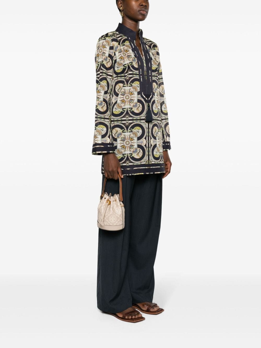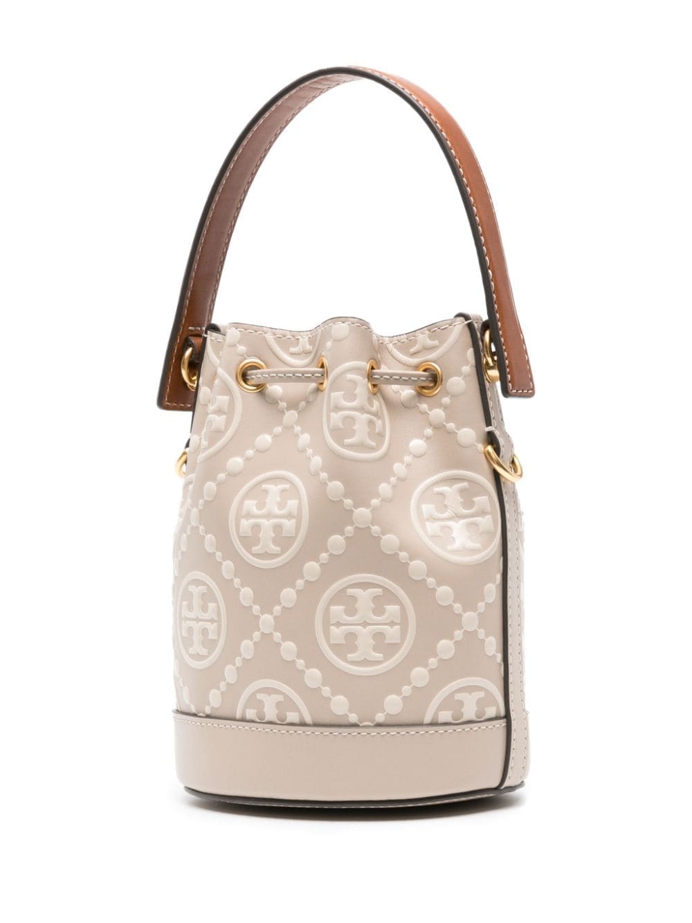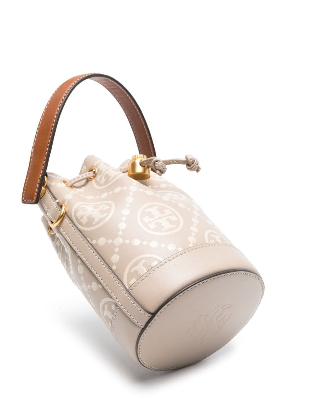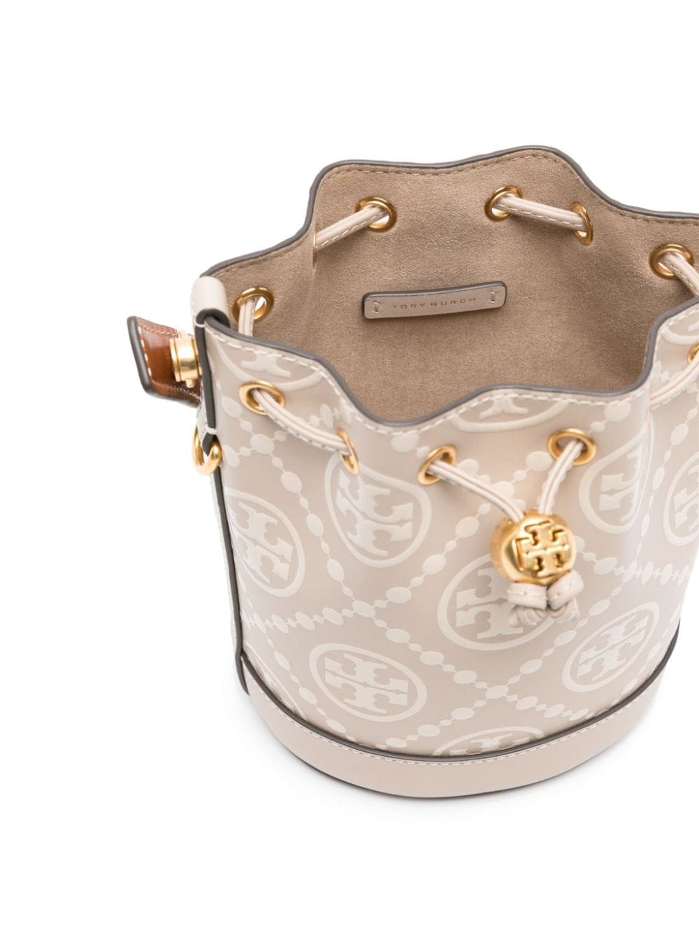 The T Monogram pattern embossed across this beige and white Tory Burch bag is inspired by traditional Pennsylvanian Dutch quilting. It’s crafted to a mini bucket silhouette with a drawstring top that cinches shut with a branded toggle.