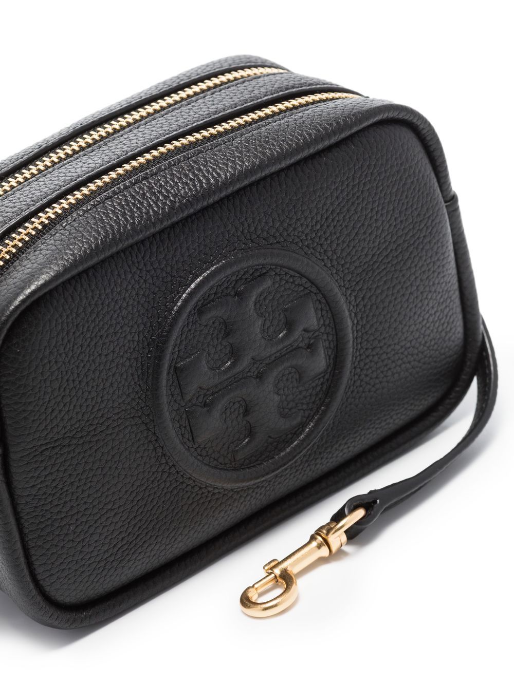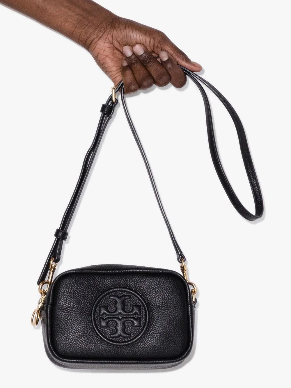 Perry Bombe crossbody bag from TORY BURCH featuring black, leather, embossed logo to the front and adjustable shoulder strap.