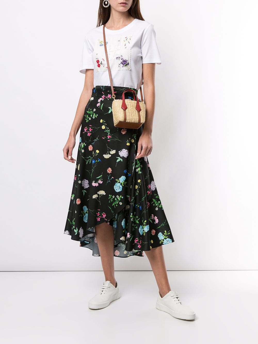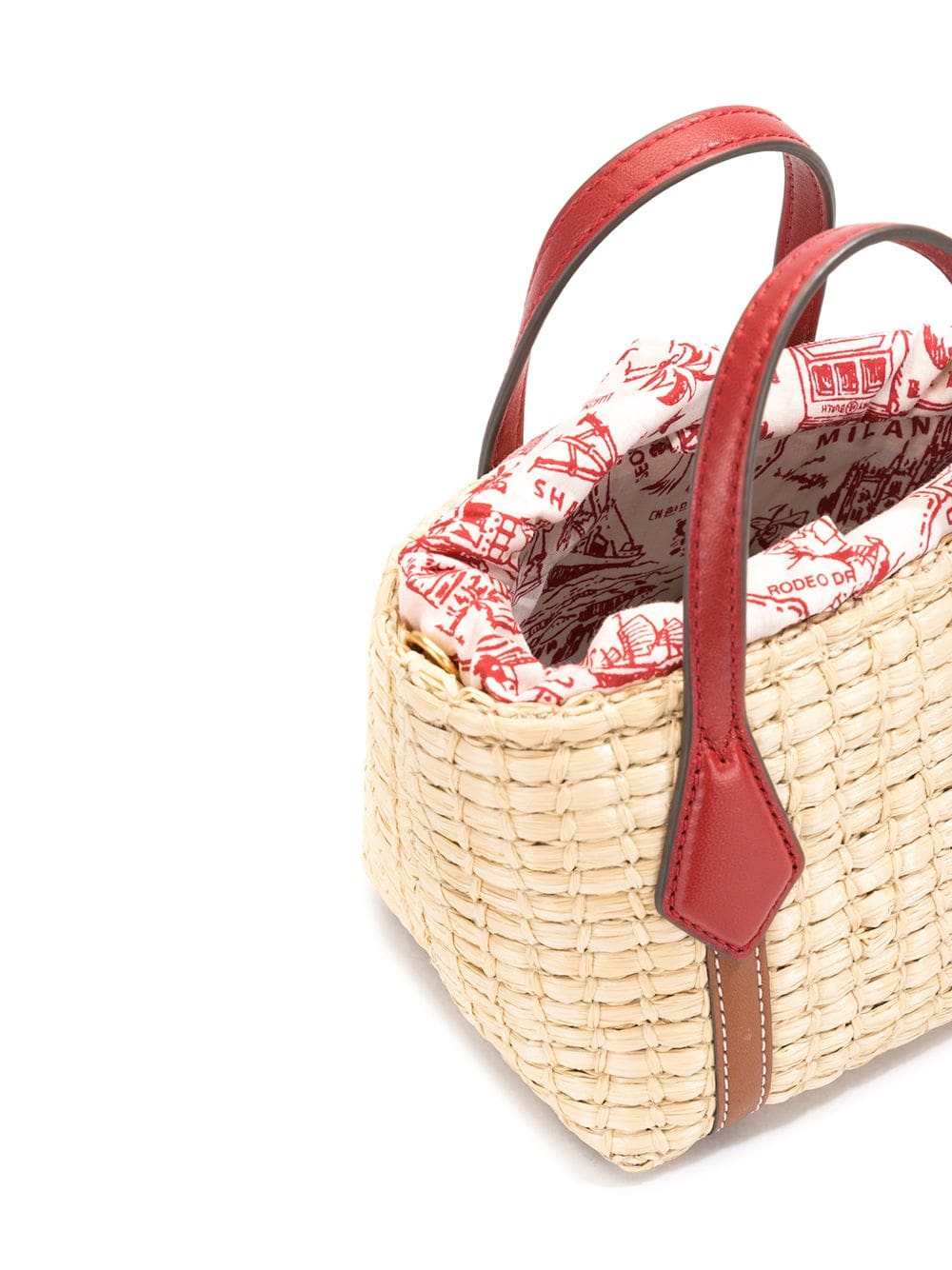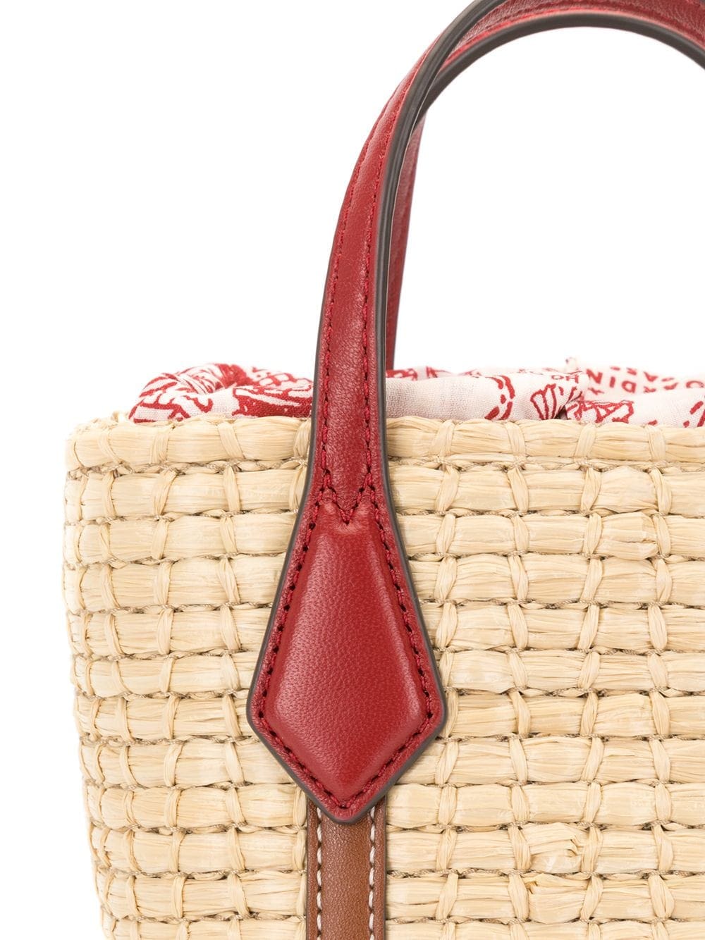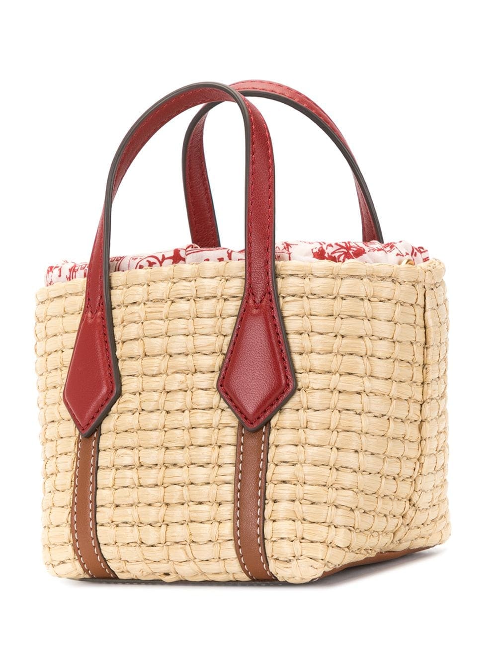 Red Perry Straw mini bag from Tory Burch featuring round top handles, a detachable and adjustable shoulder strap, an open top design, a main internal compartment and a printed lining.