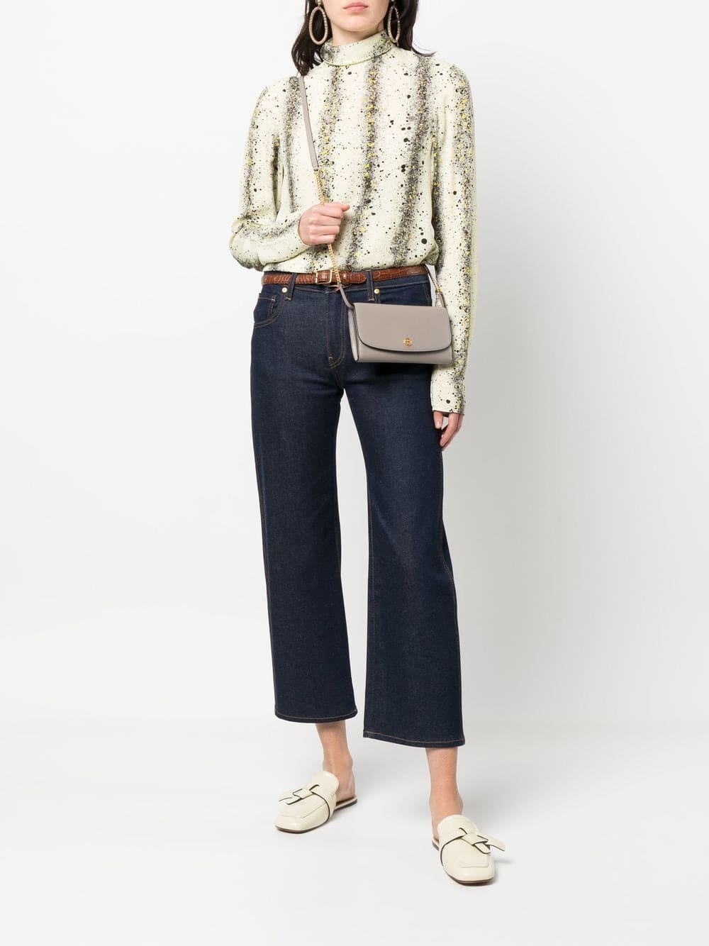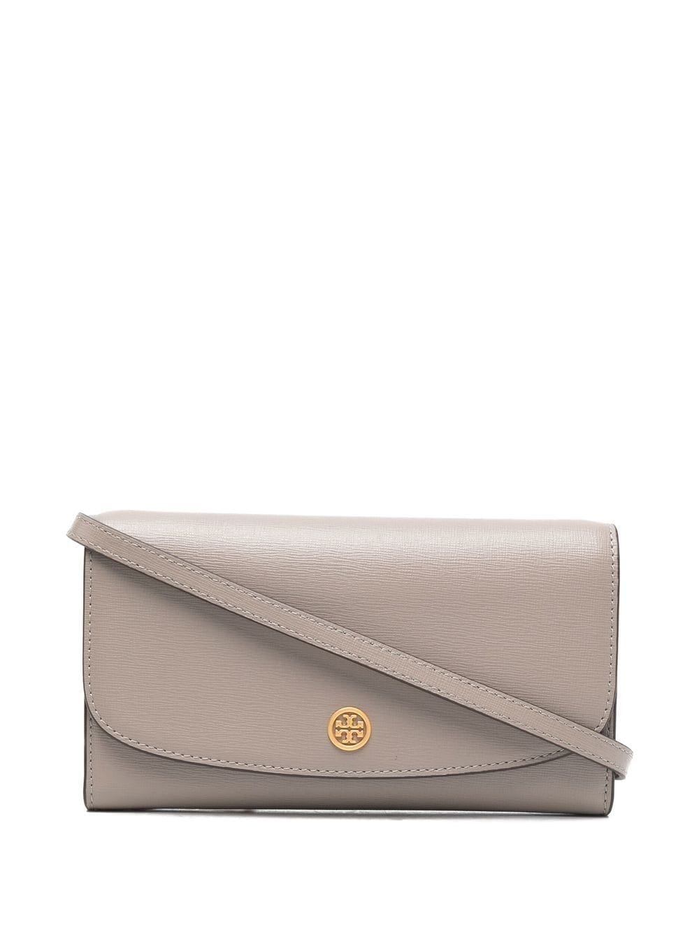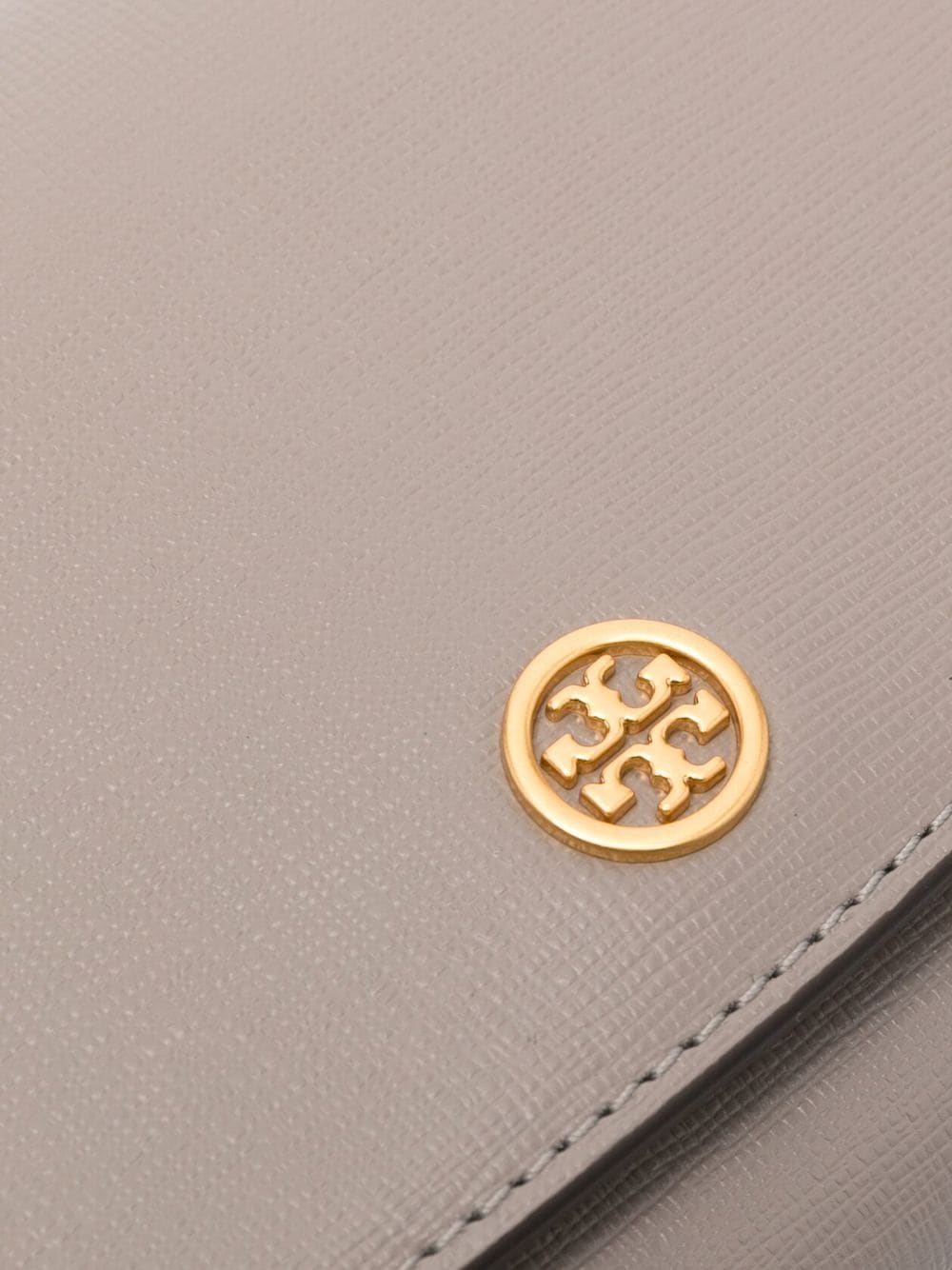 logo-plaque leather satchel bag from TORY BURCH featuring light grey, calf leather, logo plaque, foldover top, single shoulder strap and main compartment.