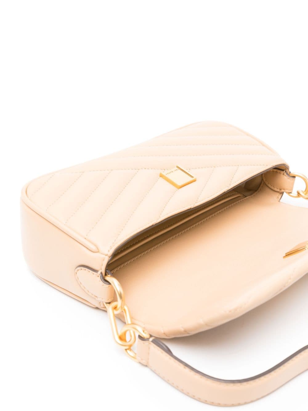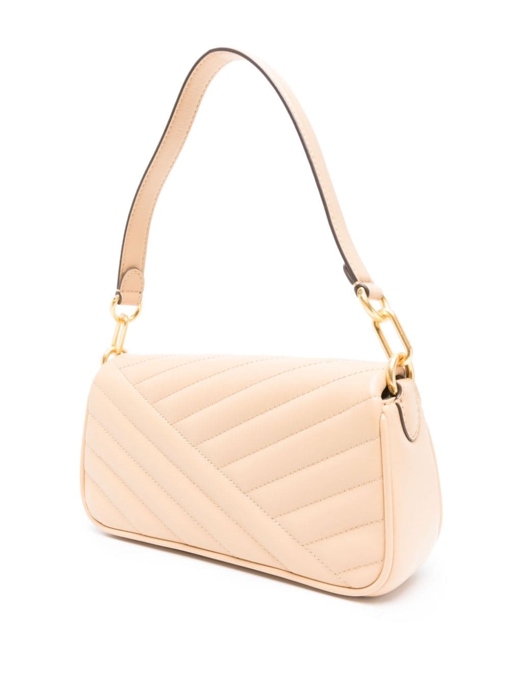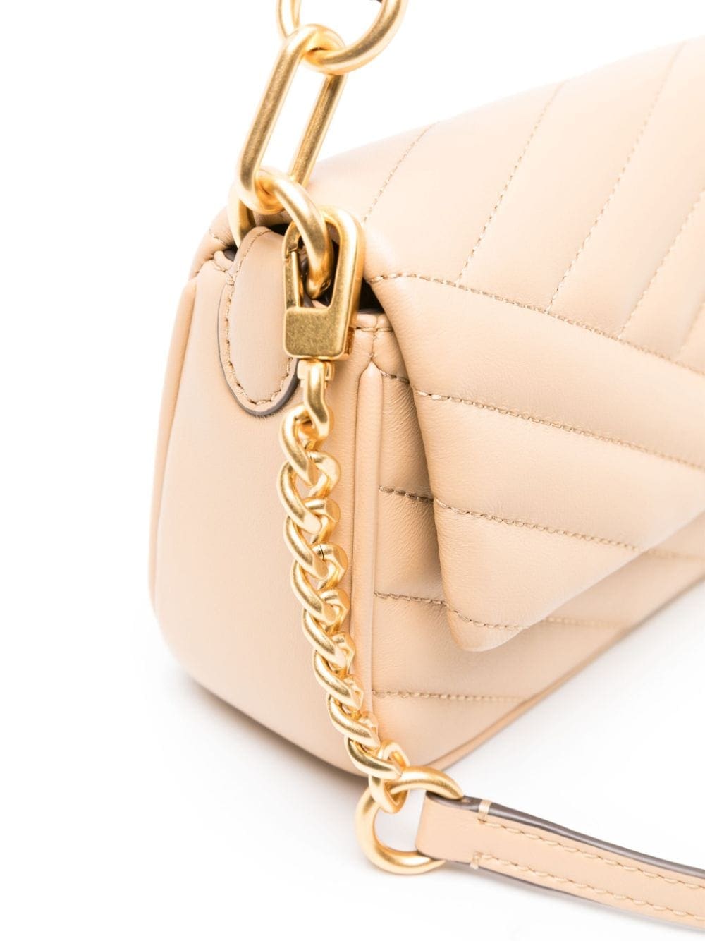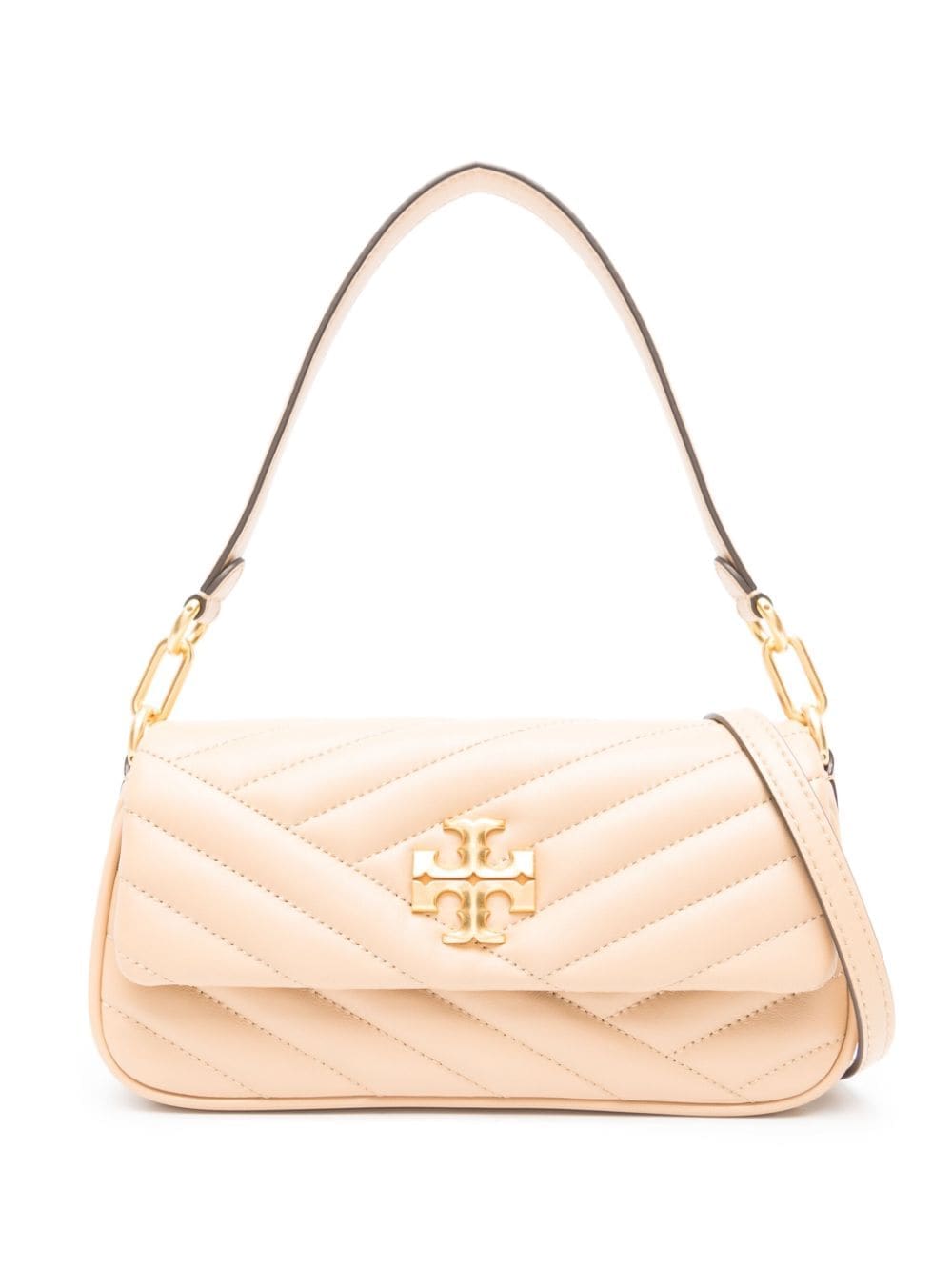 Tory Burch's small Kira bag is crafted from beige leather with asymmetric chevron quilting and a gold-tone double T plaque at the front flap – the emblem debuted in the ‘70s and remains the brand’s sole logo.
