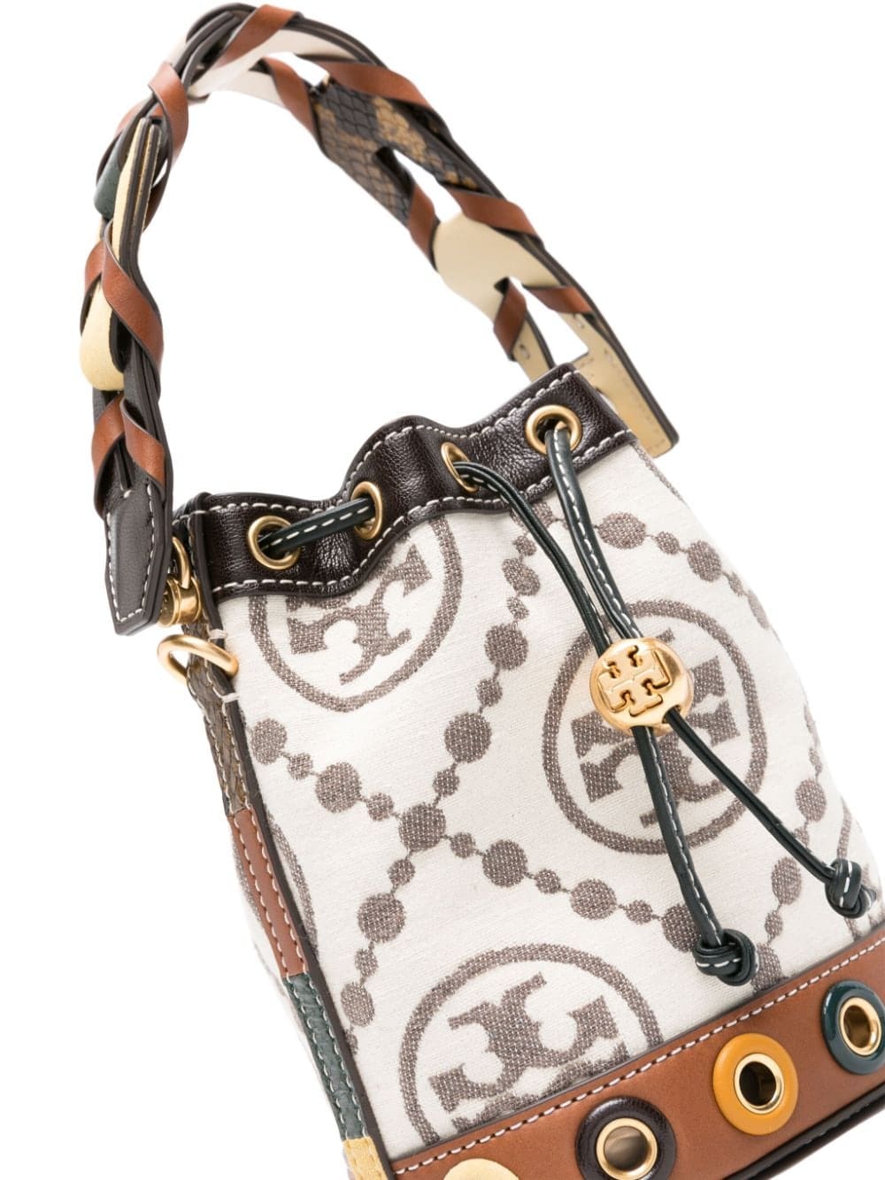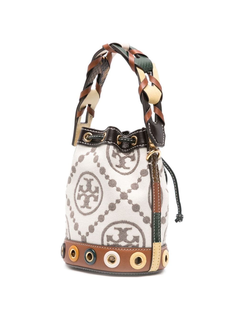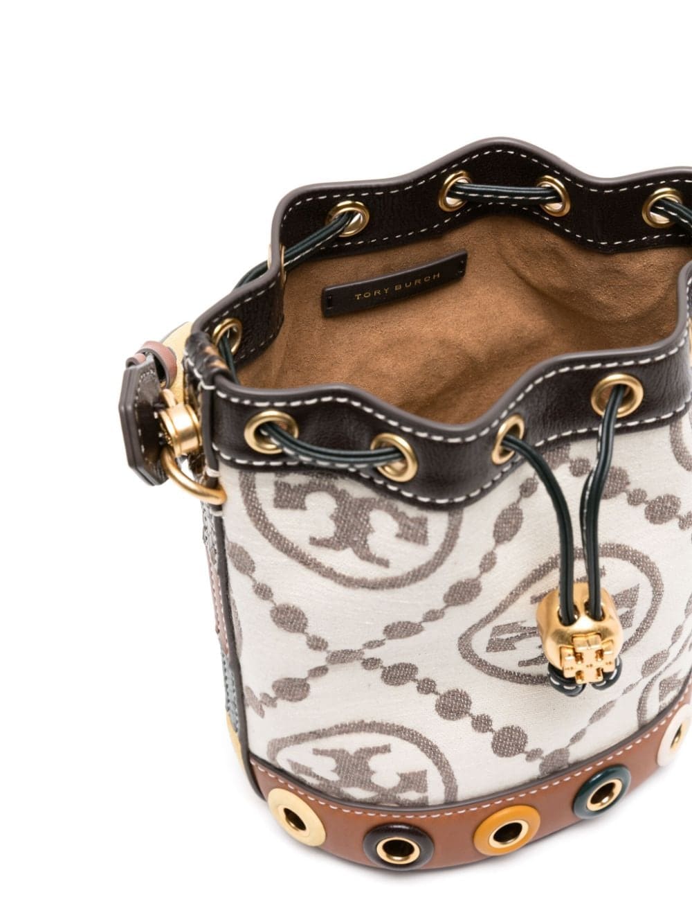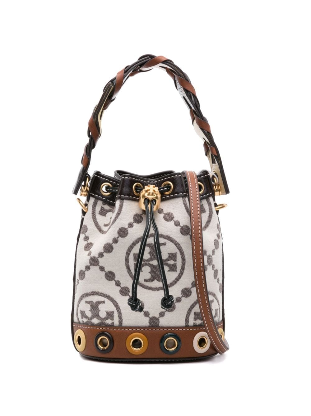 Descendant of a line of bucket bags, this cotton two-way iteration displays Tory Burch's T monogram on a drawstring construction. The design is finalised with colourful gold-tone eyelet detailing.