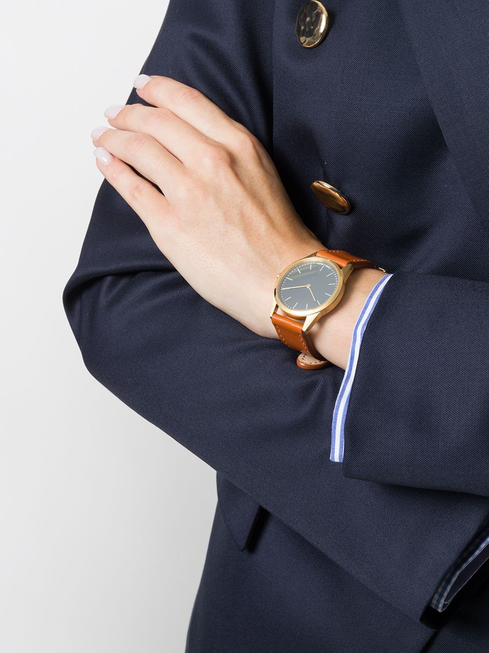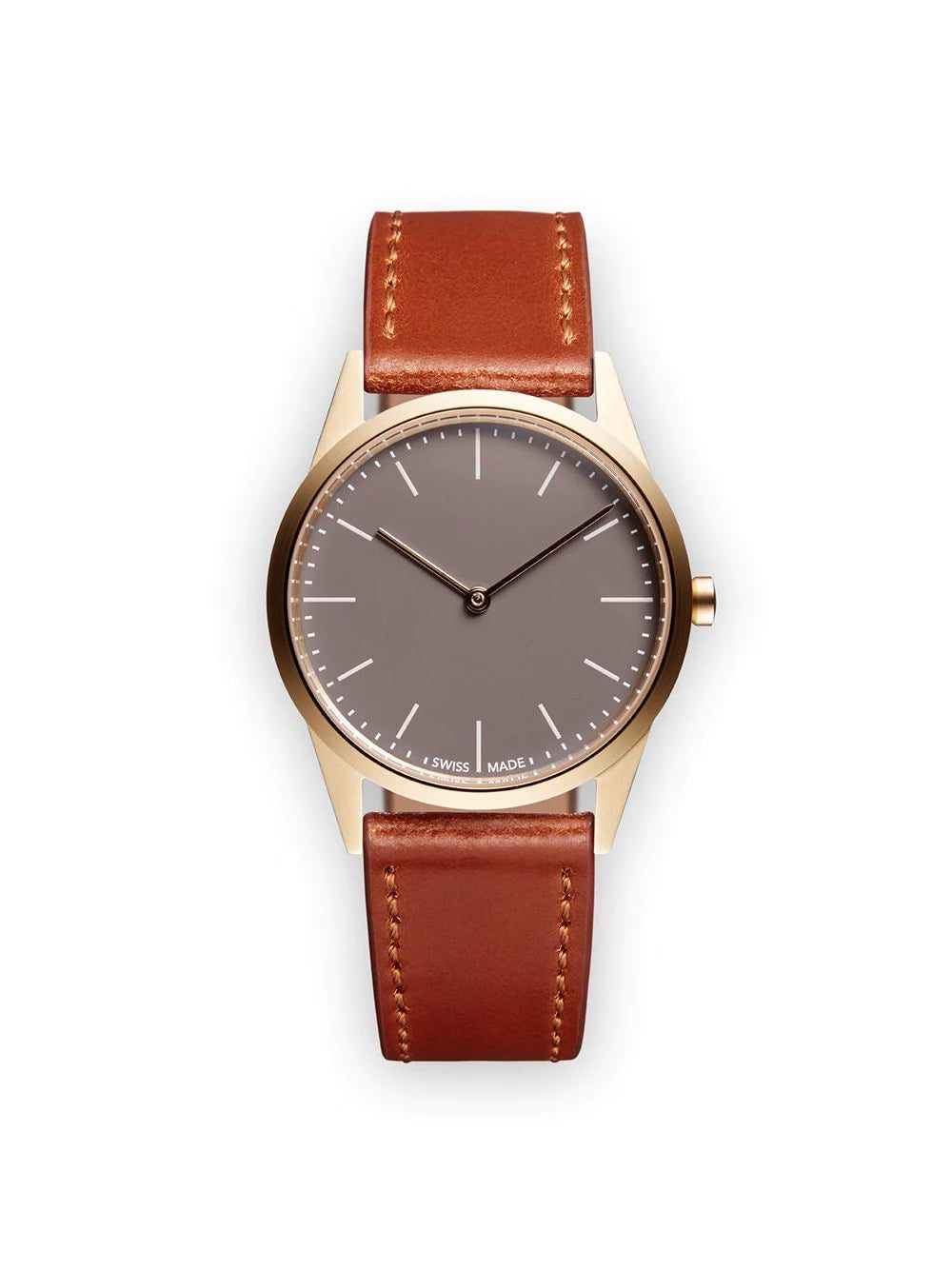 Uniform Wares presents a collection of contemporary British timepieces with a distinctly minimal design aesthetic. Each watch proves to be undeniably luxurious in its simplicity yet demonstrates the brand's intelligent design ethos. Crafted from PVD-coated satin gold stainless steel, this C33 Two-Hand watch from Uniform Wares features a supple tan Nappa leather strap, a classic C-line Lunette 33mm case, a Swiss-made quartz movement Ronda 1062, 4 jewels, a scratch-resistant sapphire glass lens, a 5 ATM water resistance and a 2-year manufacturer warranty.