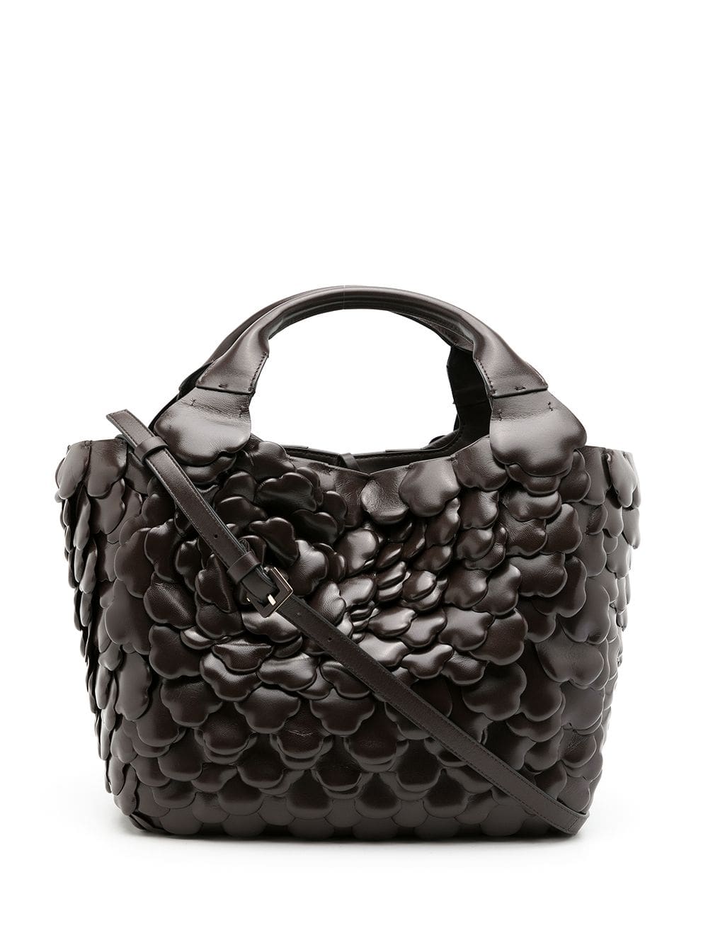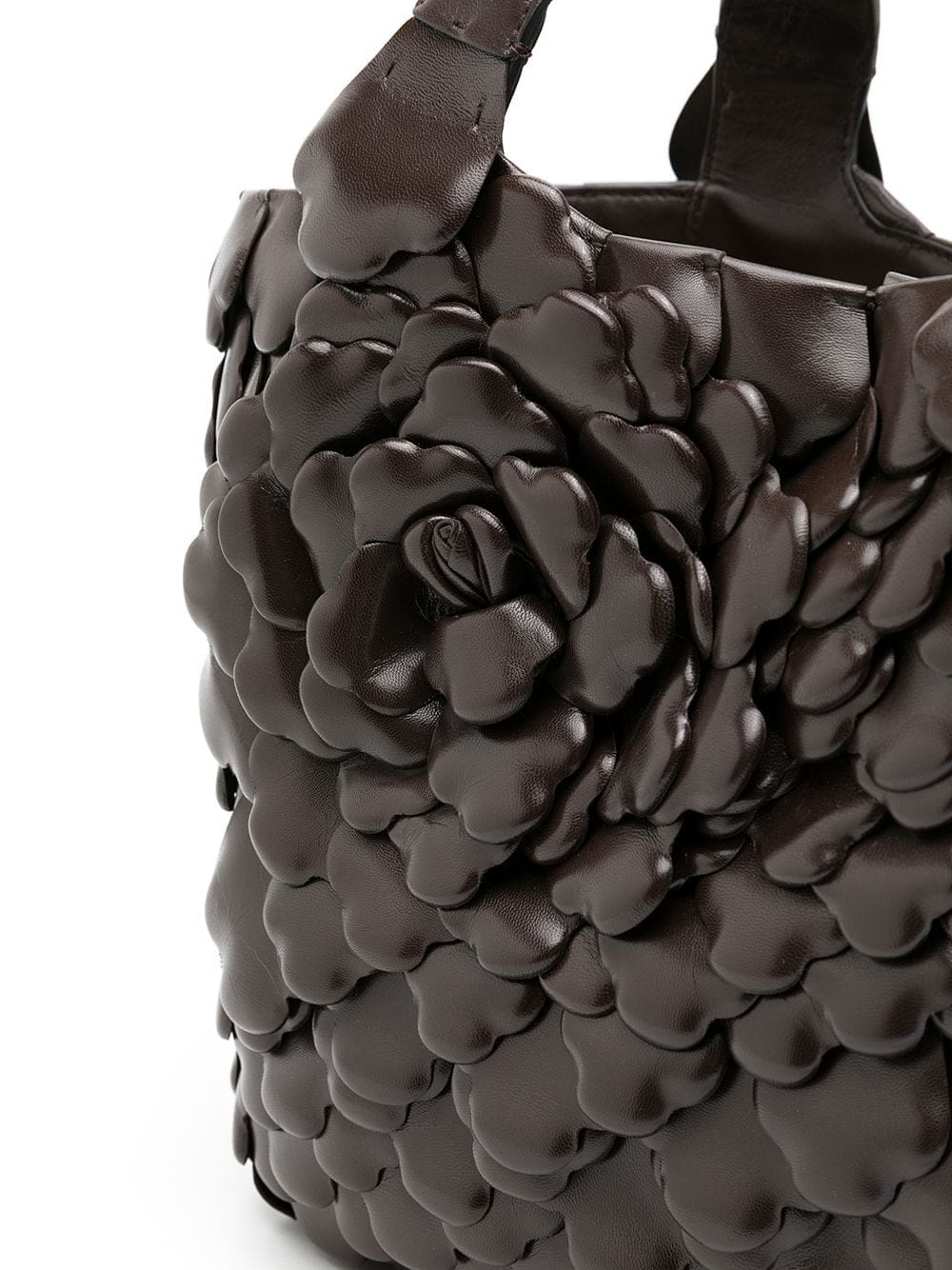 Brown two top handles open top leather trim appliqué detailing 3D detailing rose motifs main compartment internal logo patch