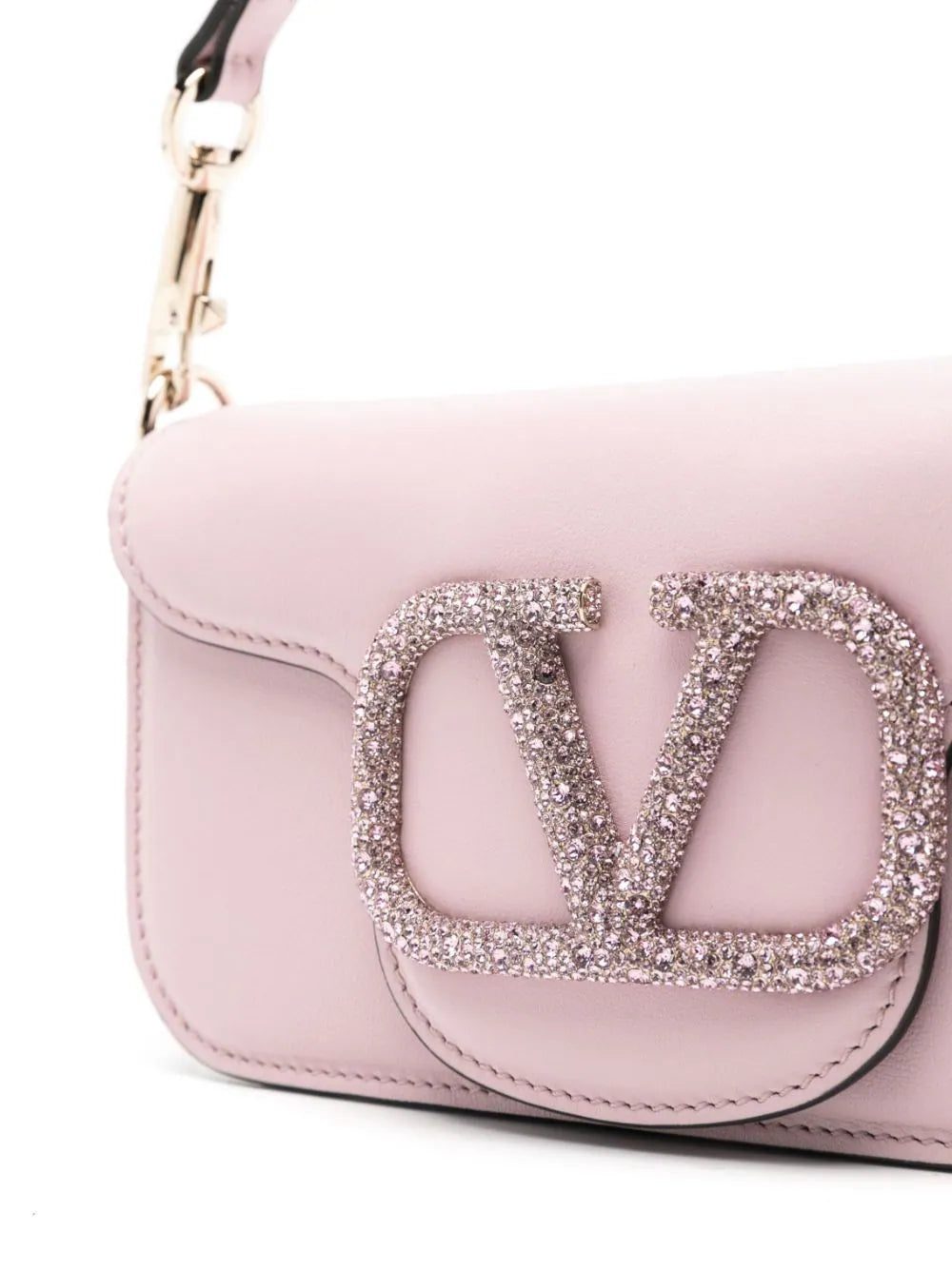 Valentino Garavani's signature VLogo steals focus on this light pink leather bag, encrusted in light-catching crystals. The compact accessory is fitted with a detachable top handle and a chain-link shoulder strap.