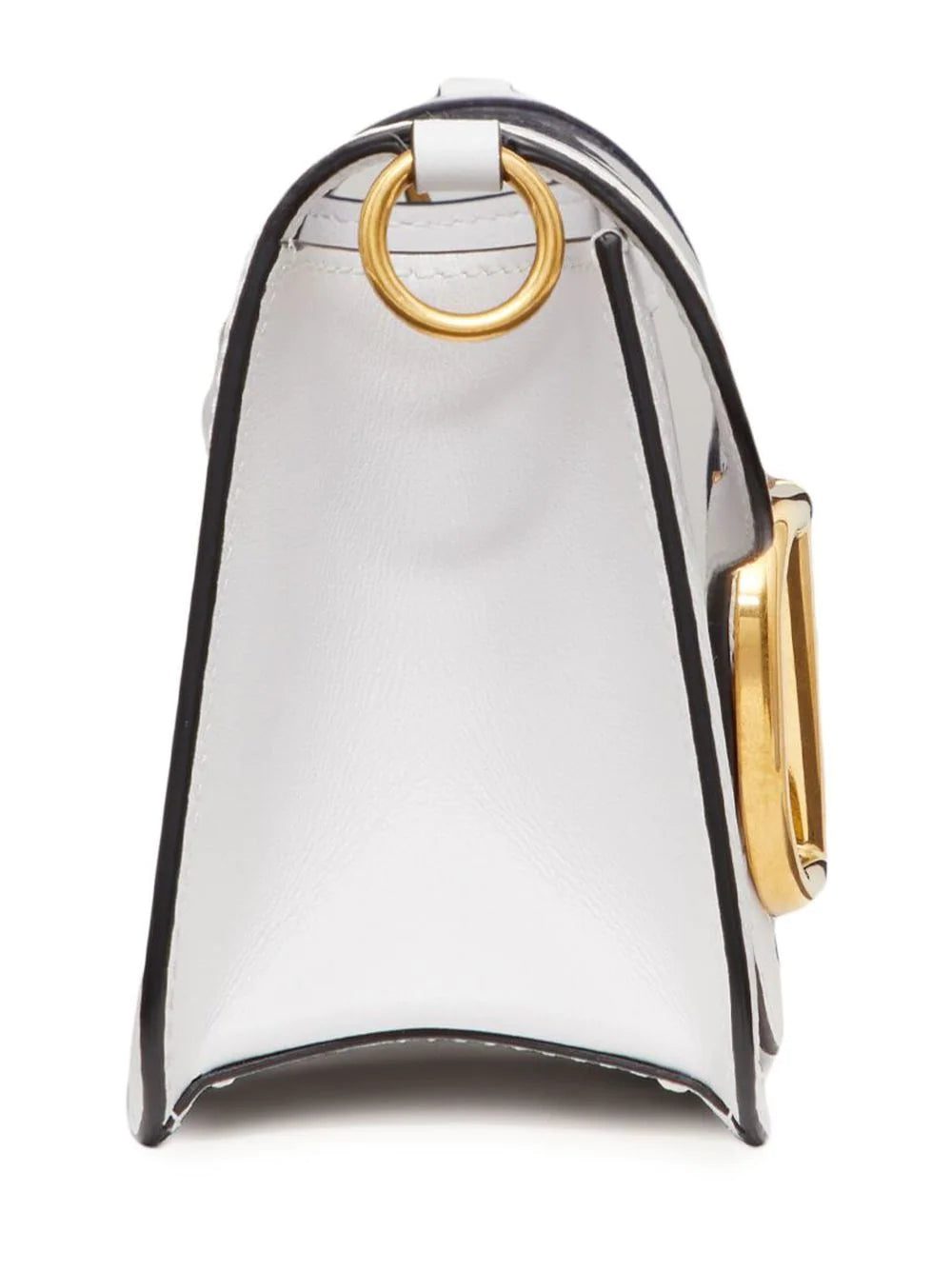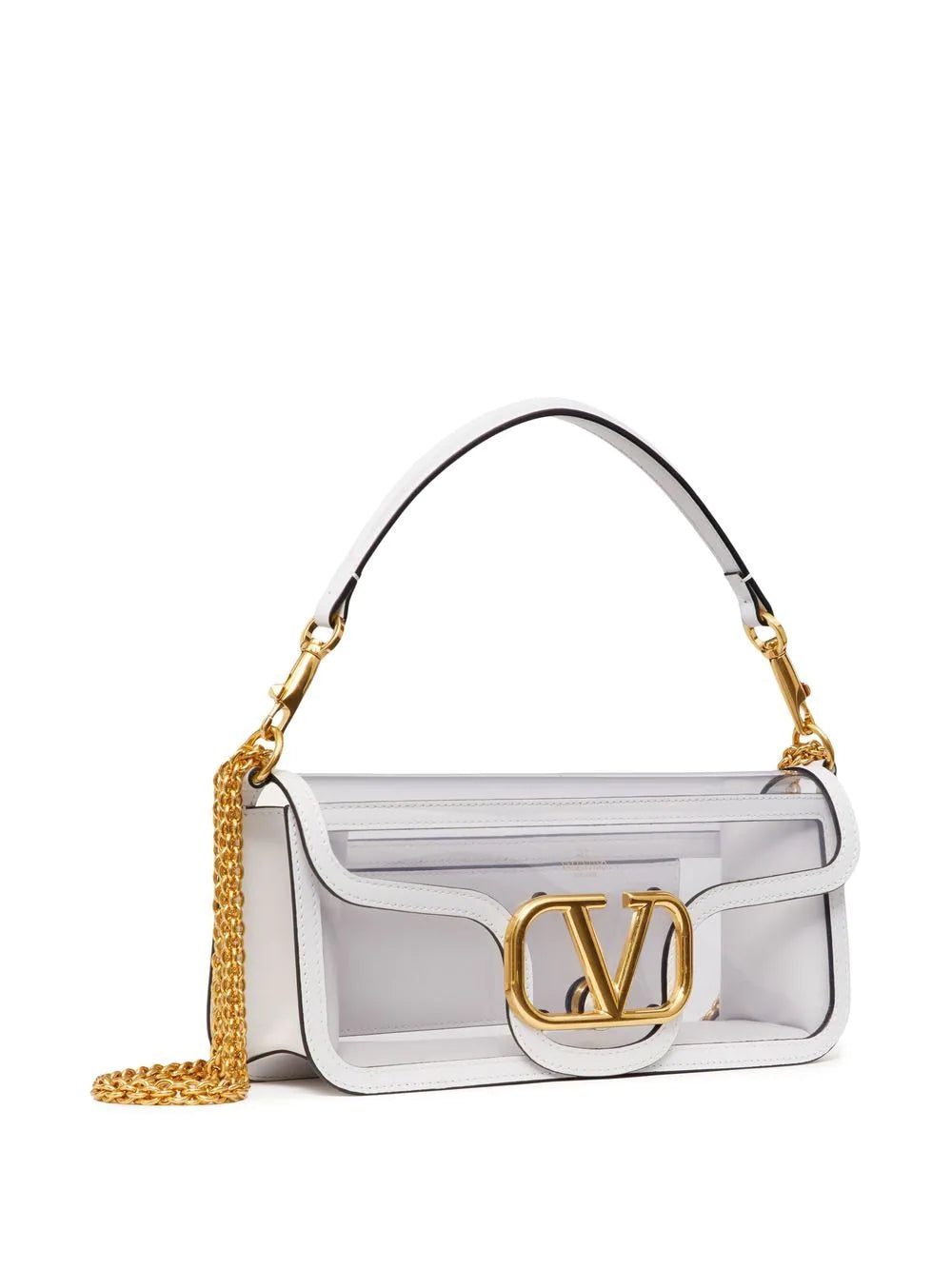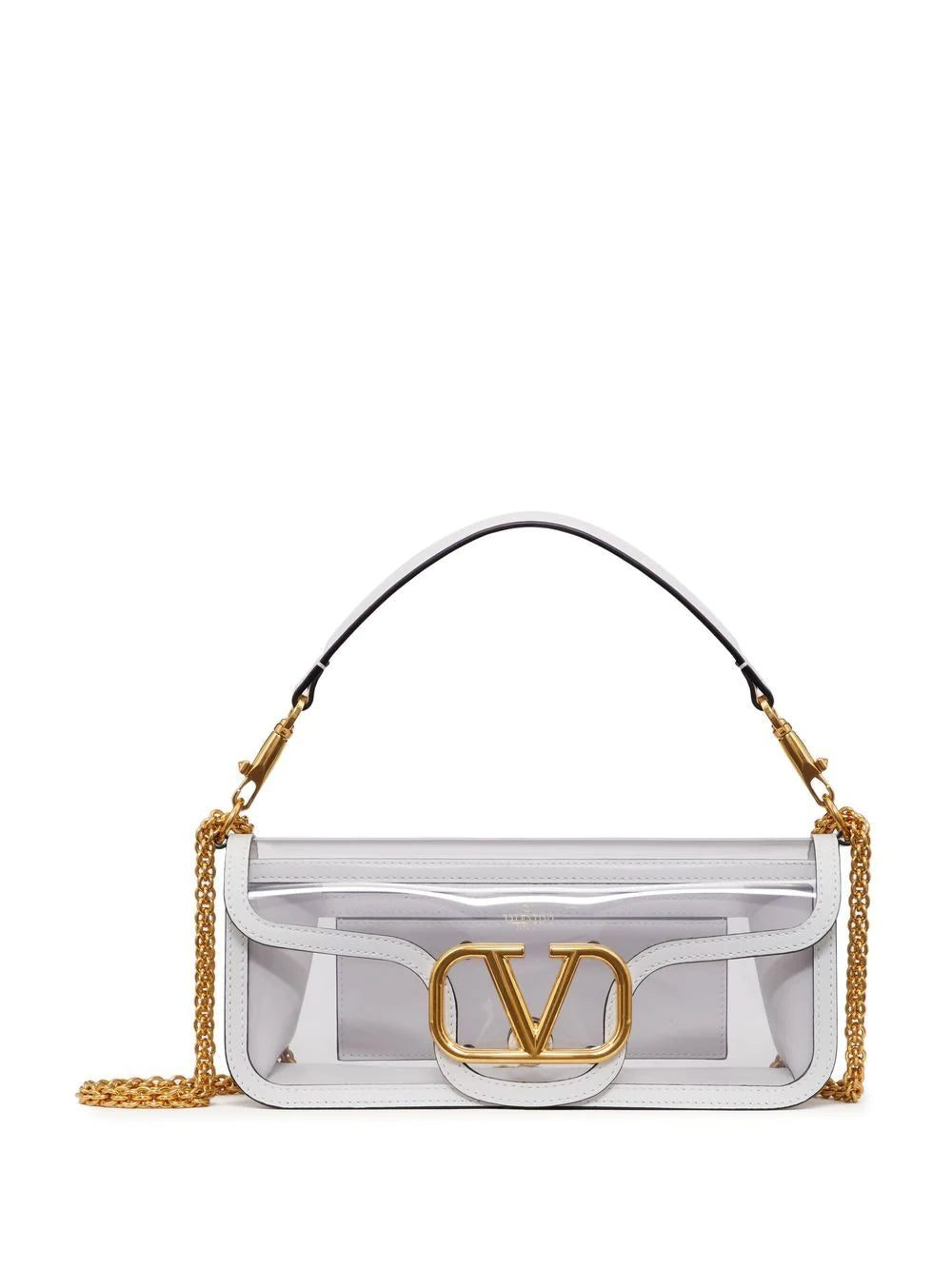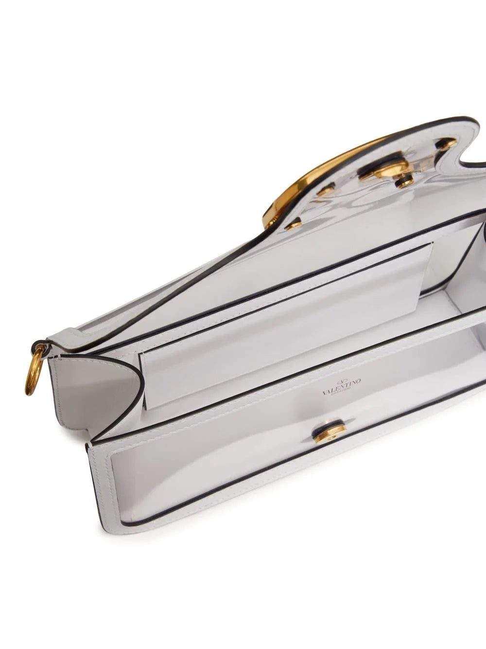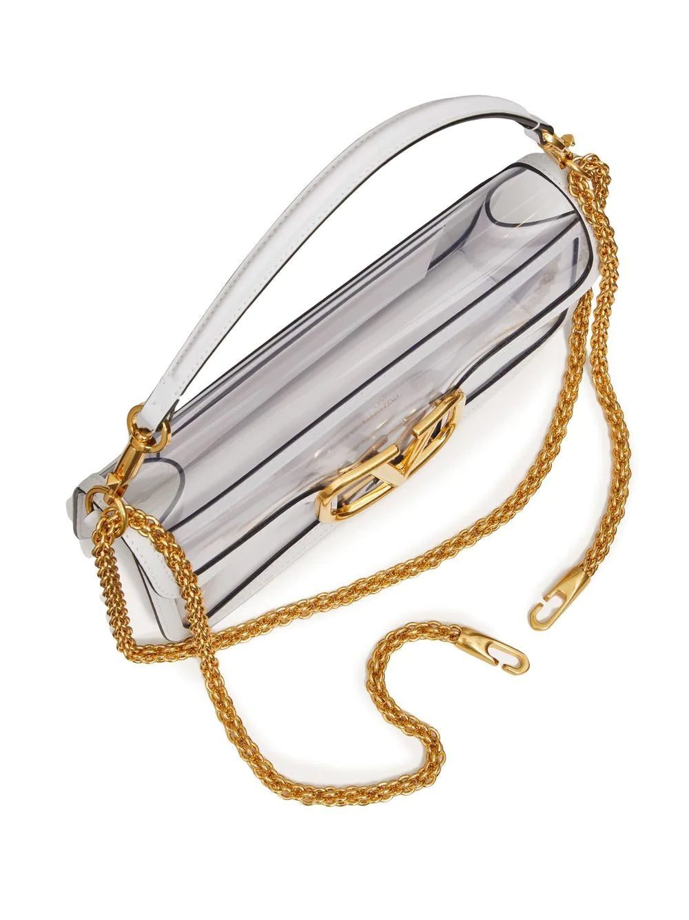 Valentino Garavani's VLogo Signature is brought back season after season with distinct colours and finishes. In this leather shoulder bag, the detail appears on the front, contrasting with the rest of its transparent design.