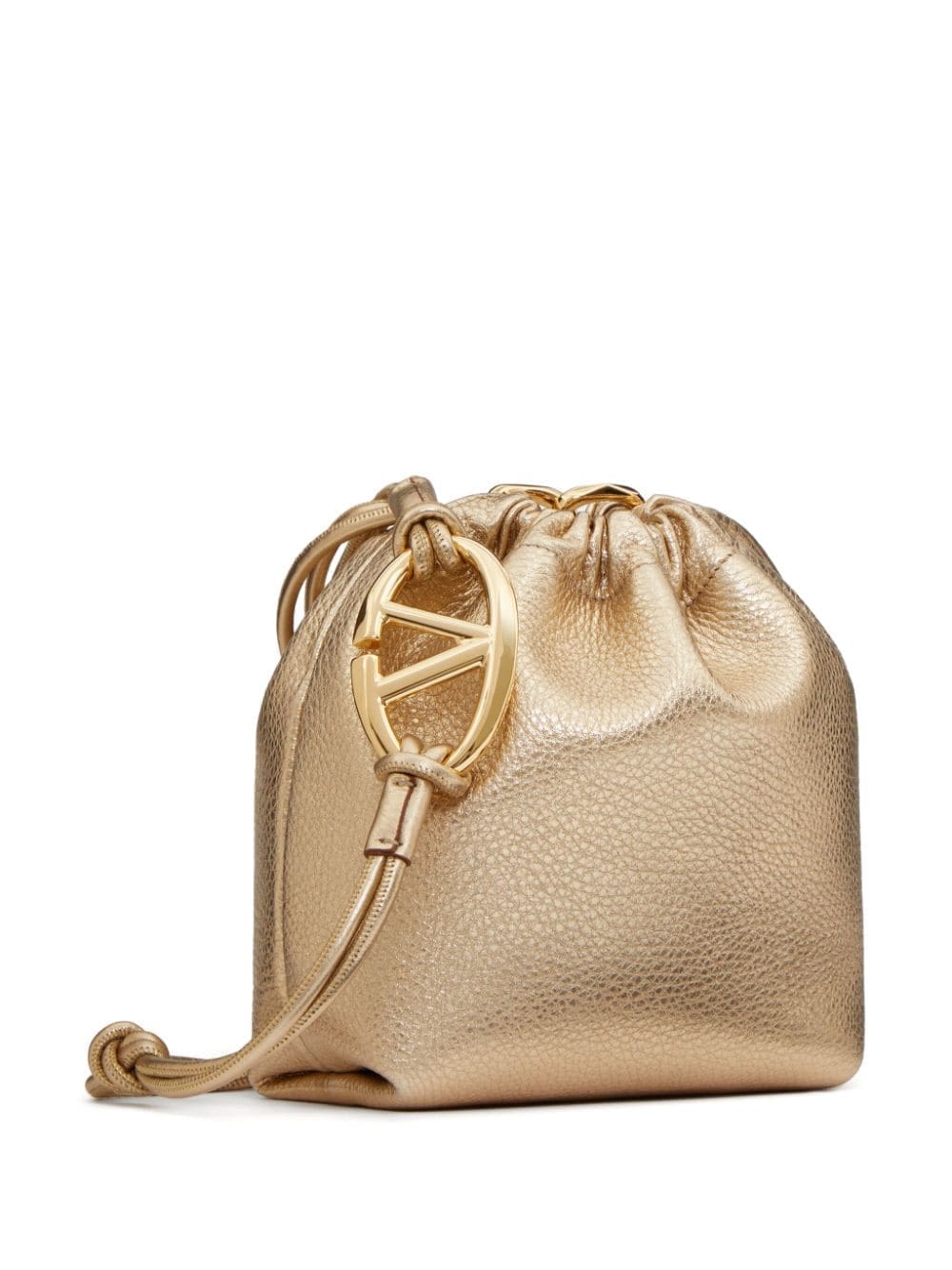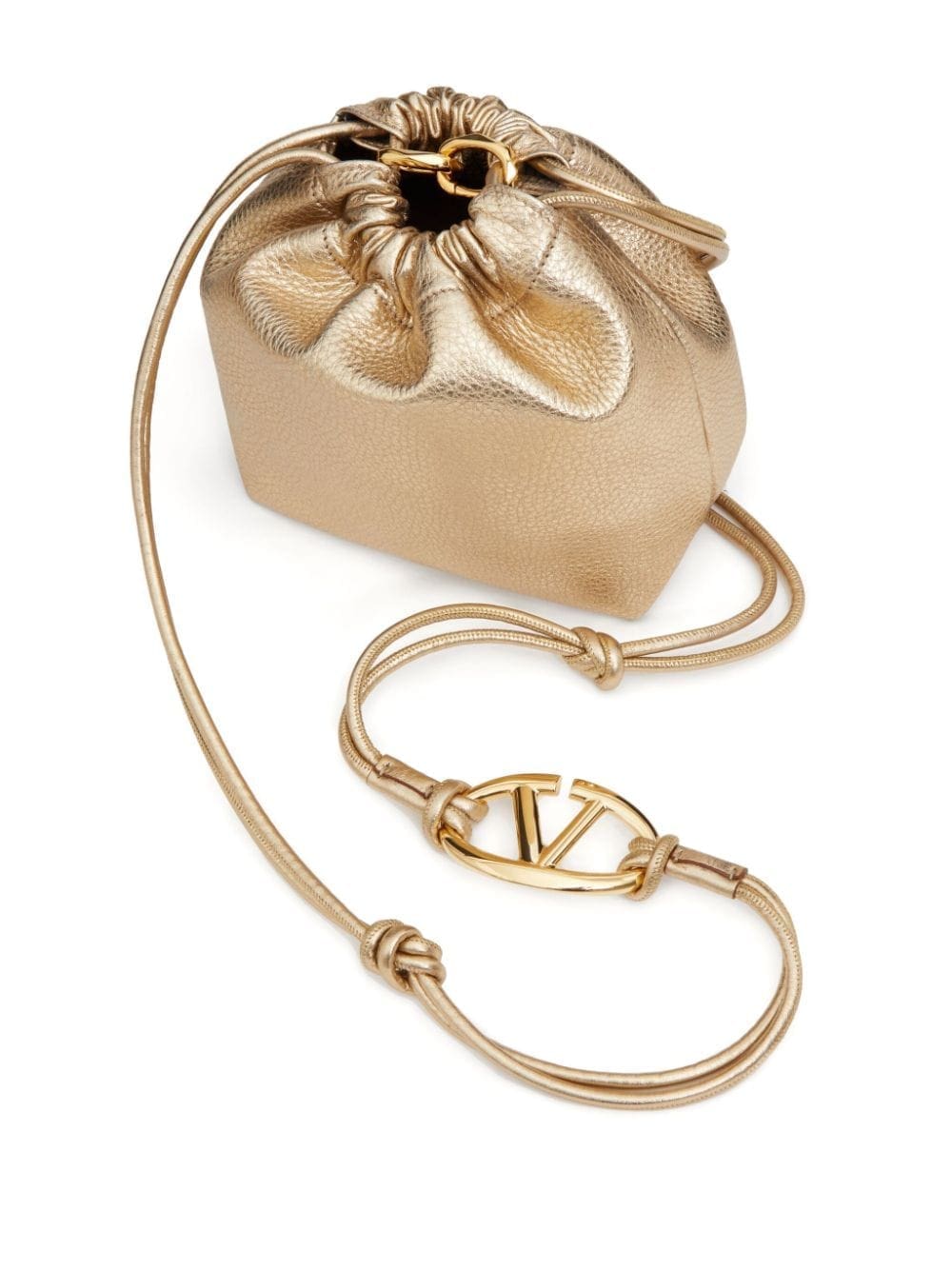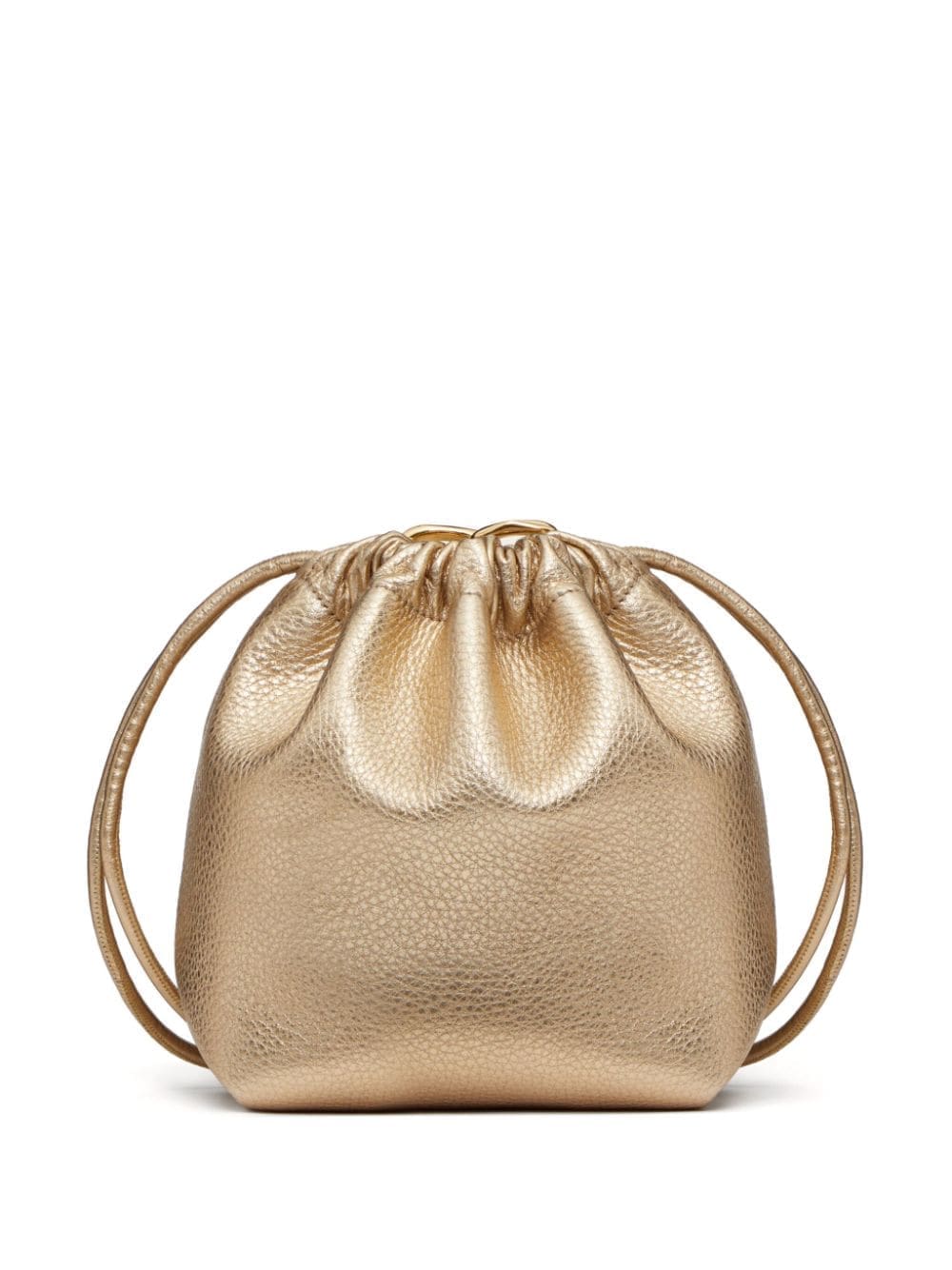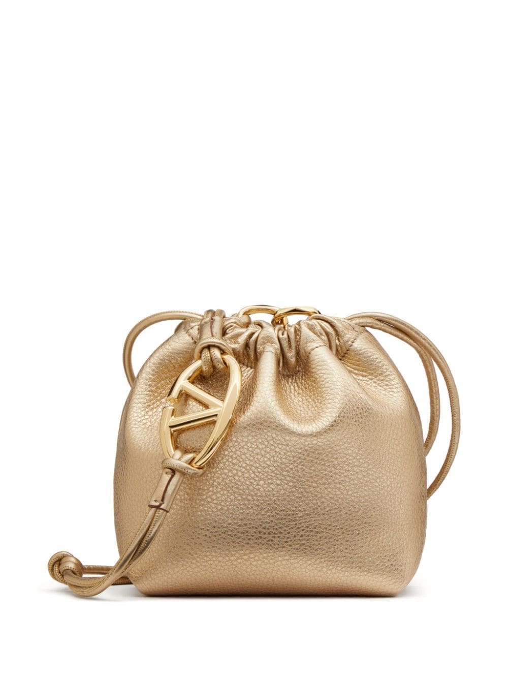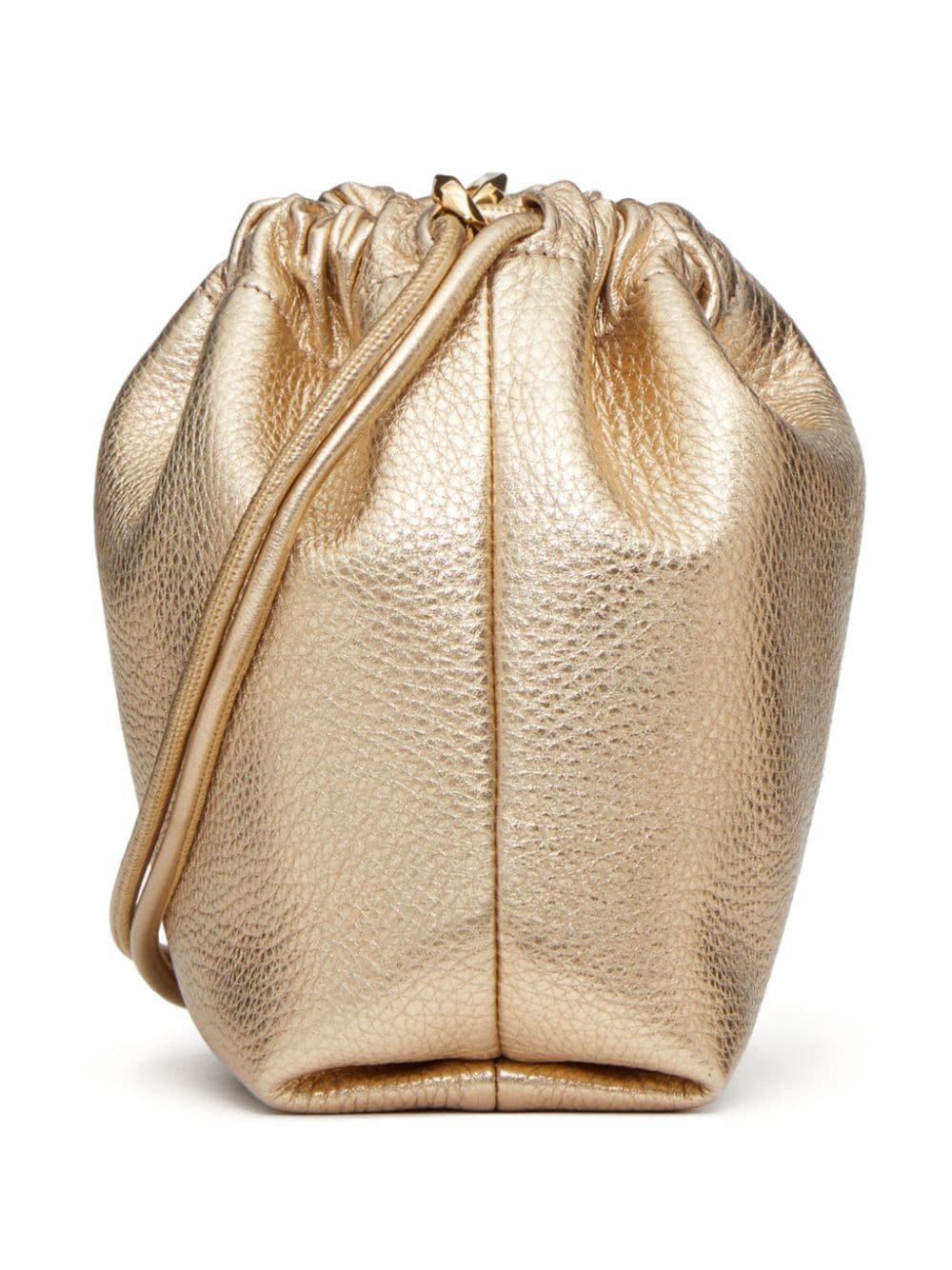 This iteration of Valentino Garavani's mini VLogo Pouf bucket bag is crafted from metallic gold-tone leather. It's fastened with a drawstring and boasts the signature VLogo plaque on the strap in polished gold-tone hardware.
