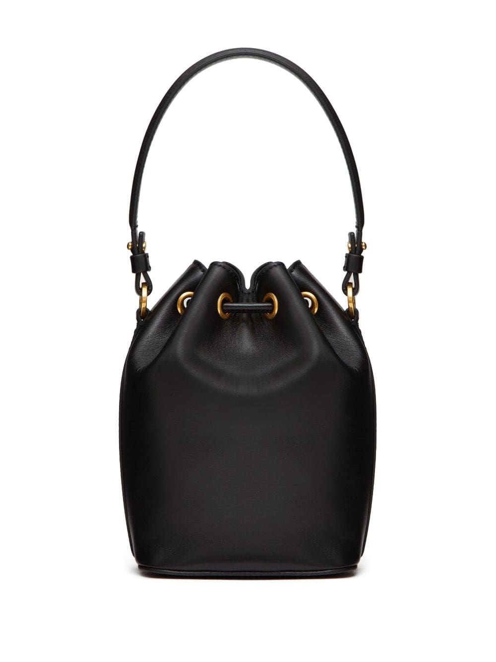 Presented in micro size, this bucket bag by Valentino Garavani is crafted from smooth leather and rendered in a black colour. Featuring a drawstring fastening and main compartment, the classic silhouette is highlighted with a gold-tone VLogo plaque at the front.