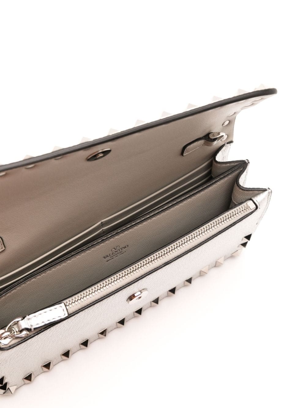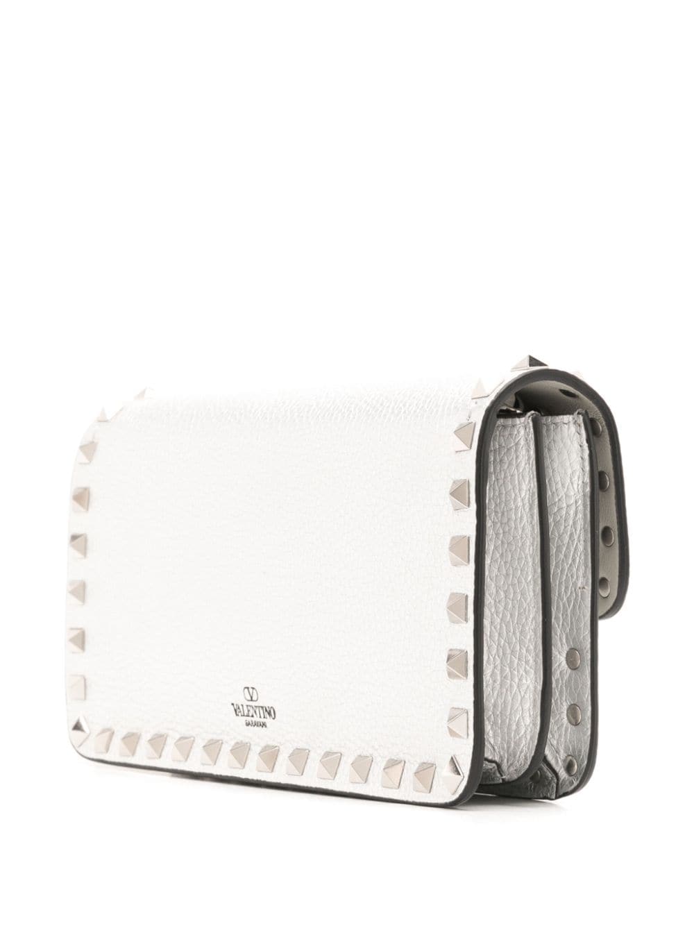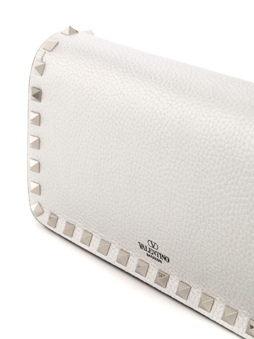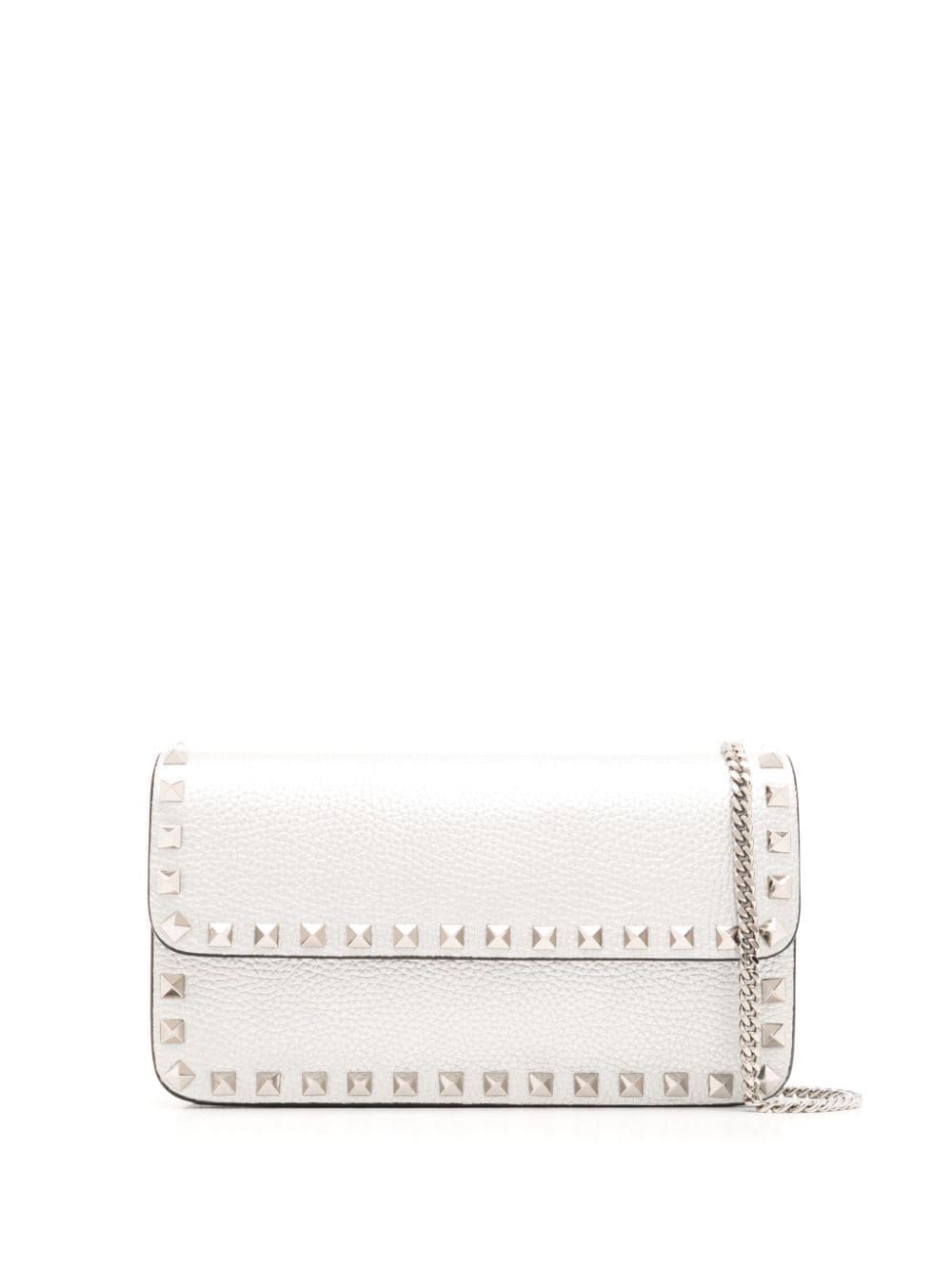 Valentino Garavani’s iconic Rockstuds are an ode to its home city – they’re inspired by the 'bugnato' exteriors of Rome’s palazzos. Silver-tone versions of the spiked hardware trace the rectangular silhouette of this white wallet-on-chain, each hand-polished to maintain its shine.