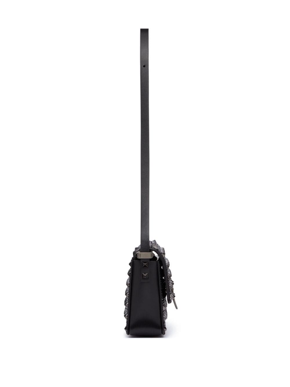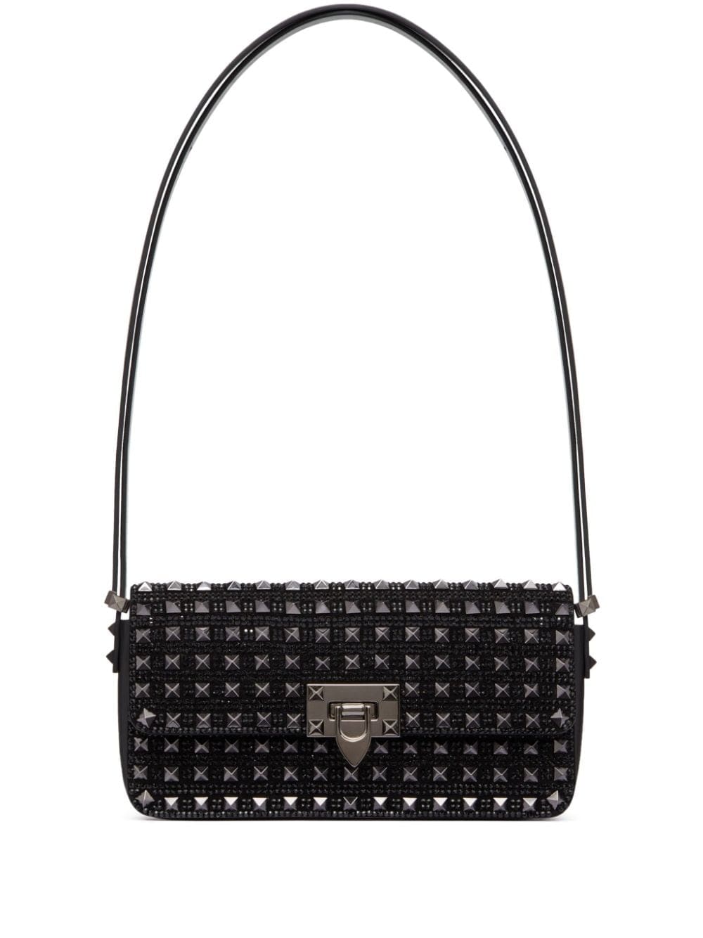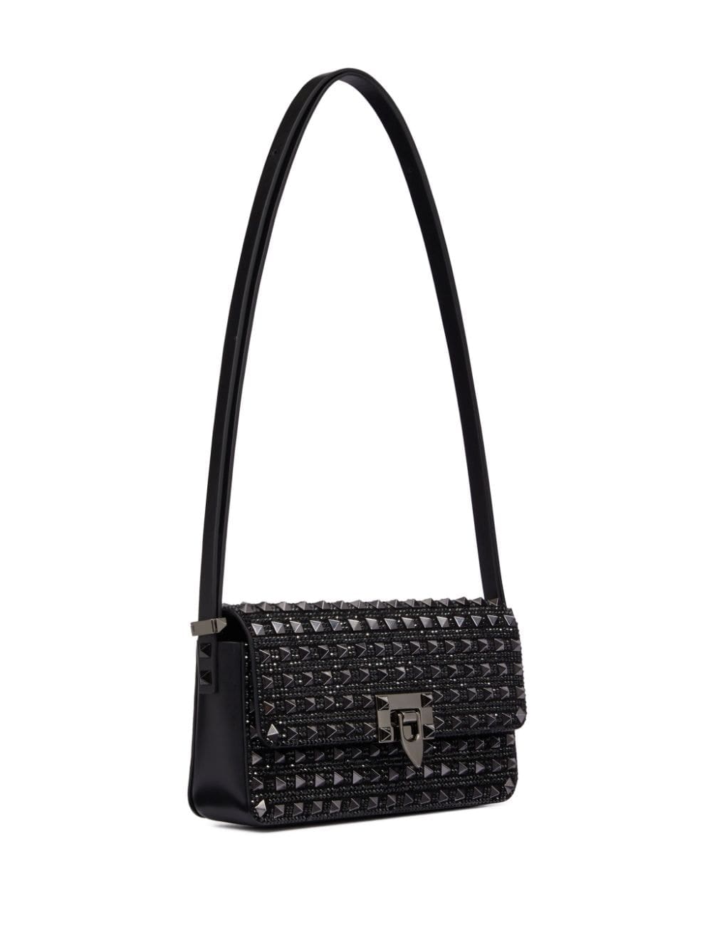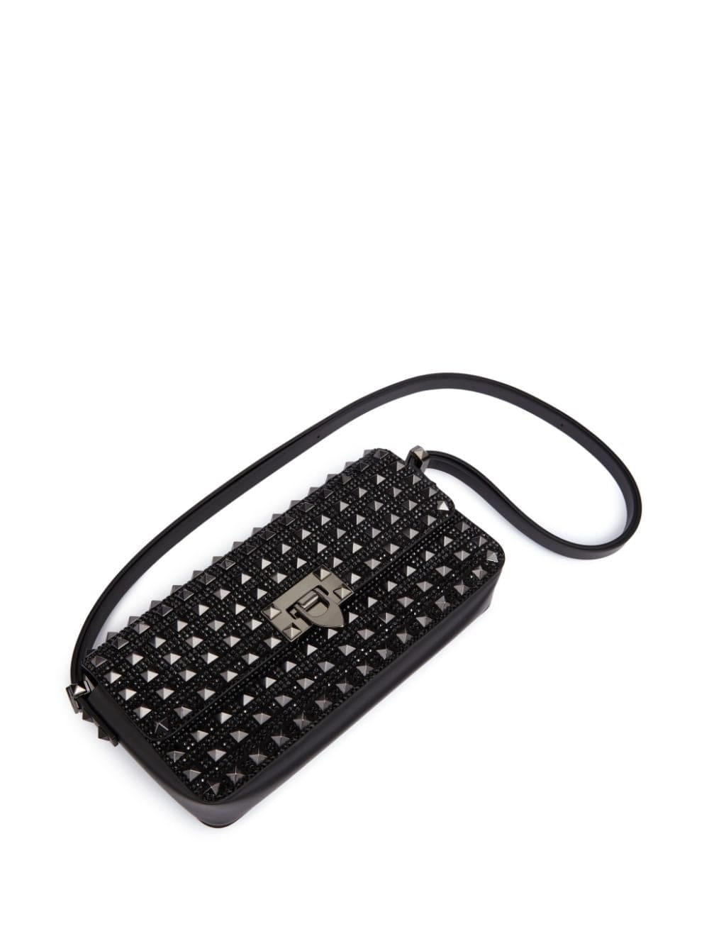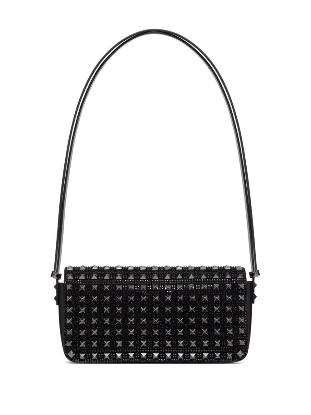 Dimension and texture stand out as key features of this black Rockstud23 shoulder bag by Valentino Garavani. Crafted from leather to an elongated East-West silhouette held on an adjustable strap, it is encrusted with scores of tonal rhinestones and the house's signature Rockstud embellishment for a luminous and tactile finish.