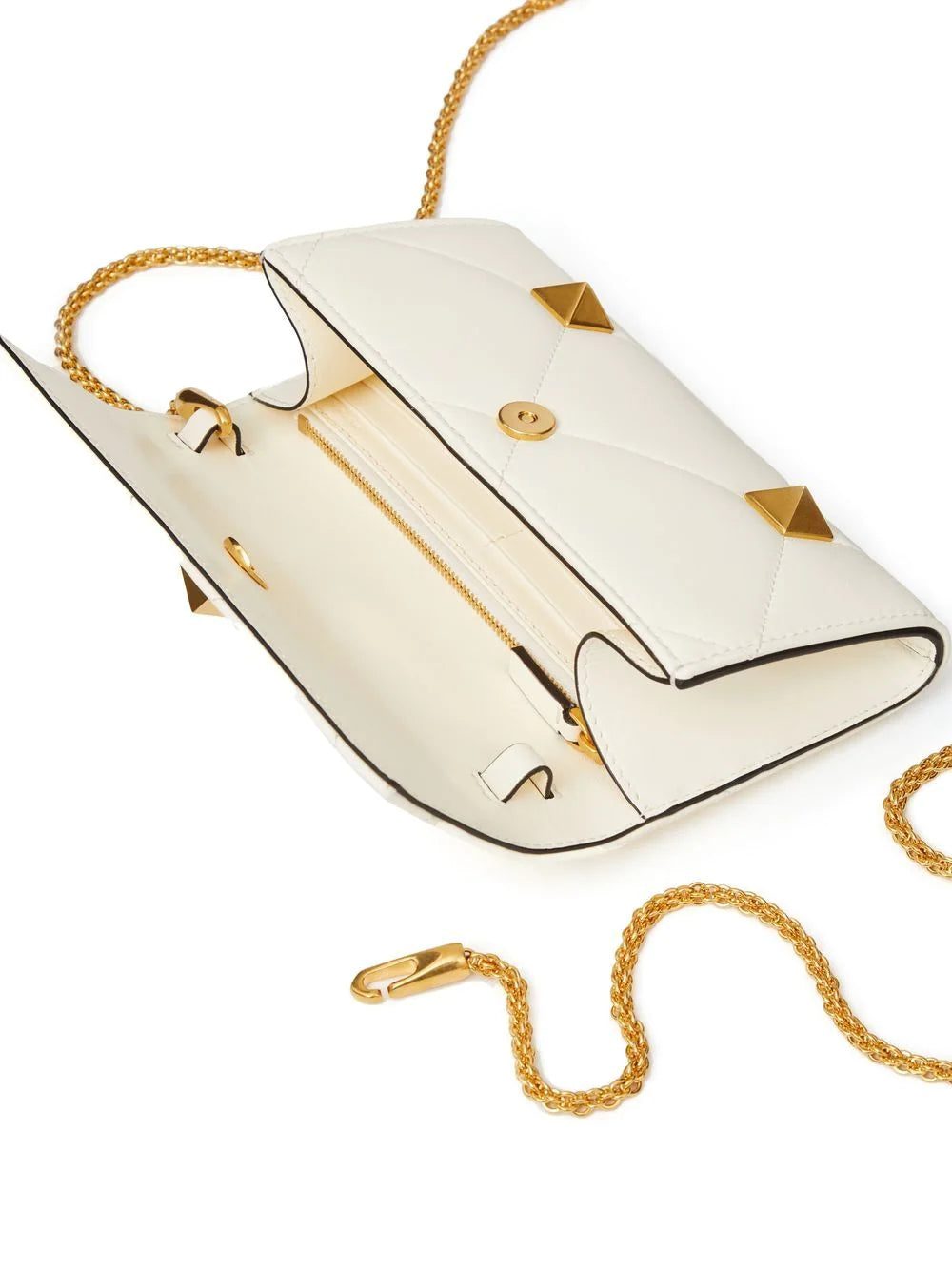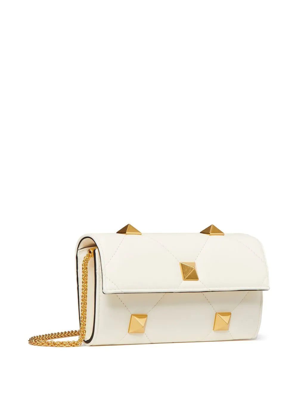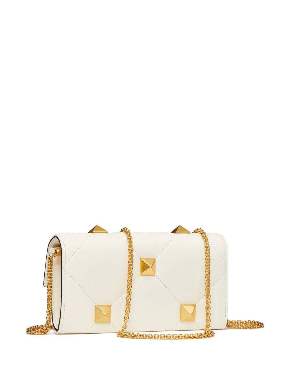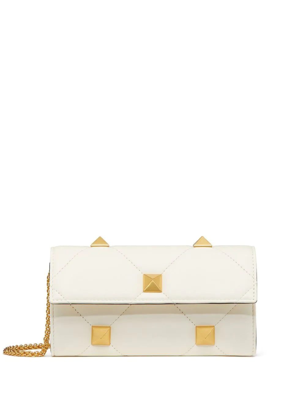 The Roman Stud chain wallet from Valentino Garavani is presented here in a timeless white hue with gold-tone hardware. The quilted design is complete with a sleek chain shoulder strap for a special touch.
