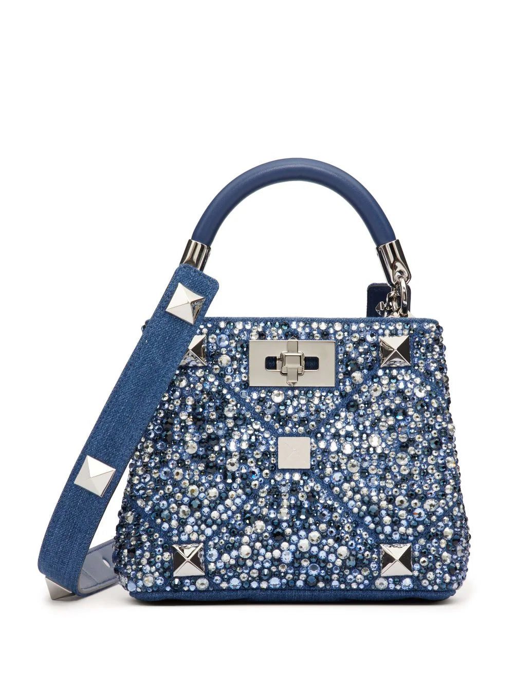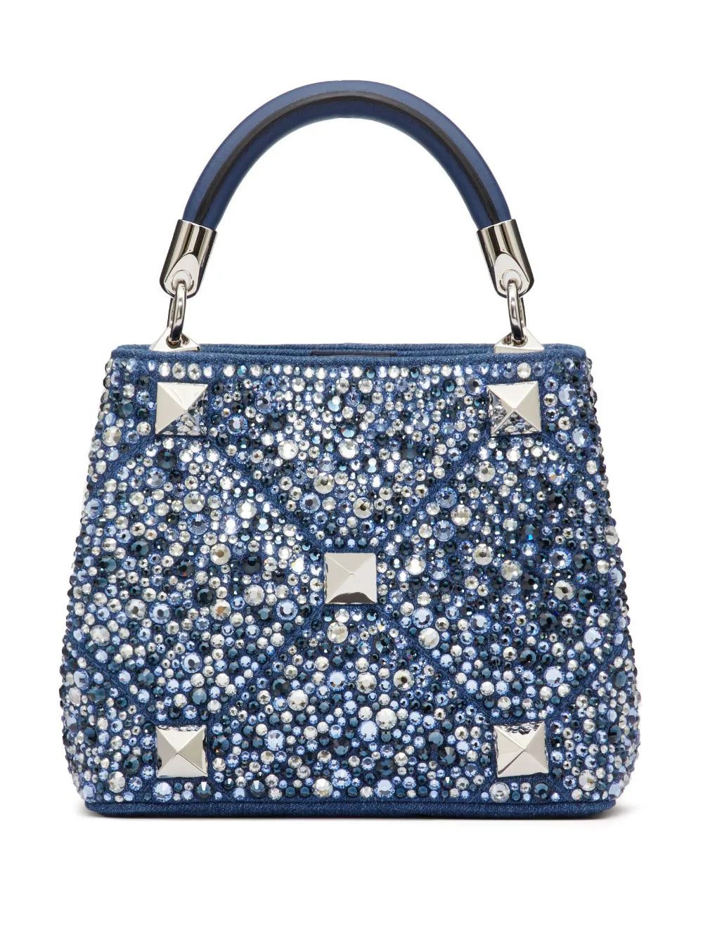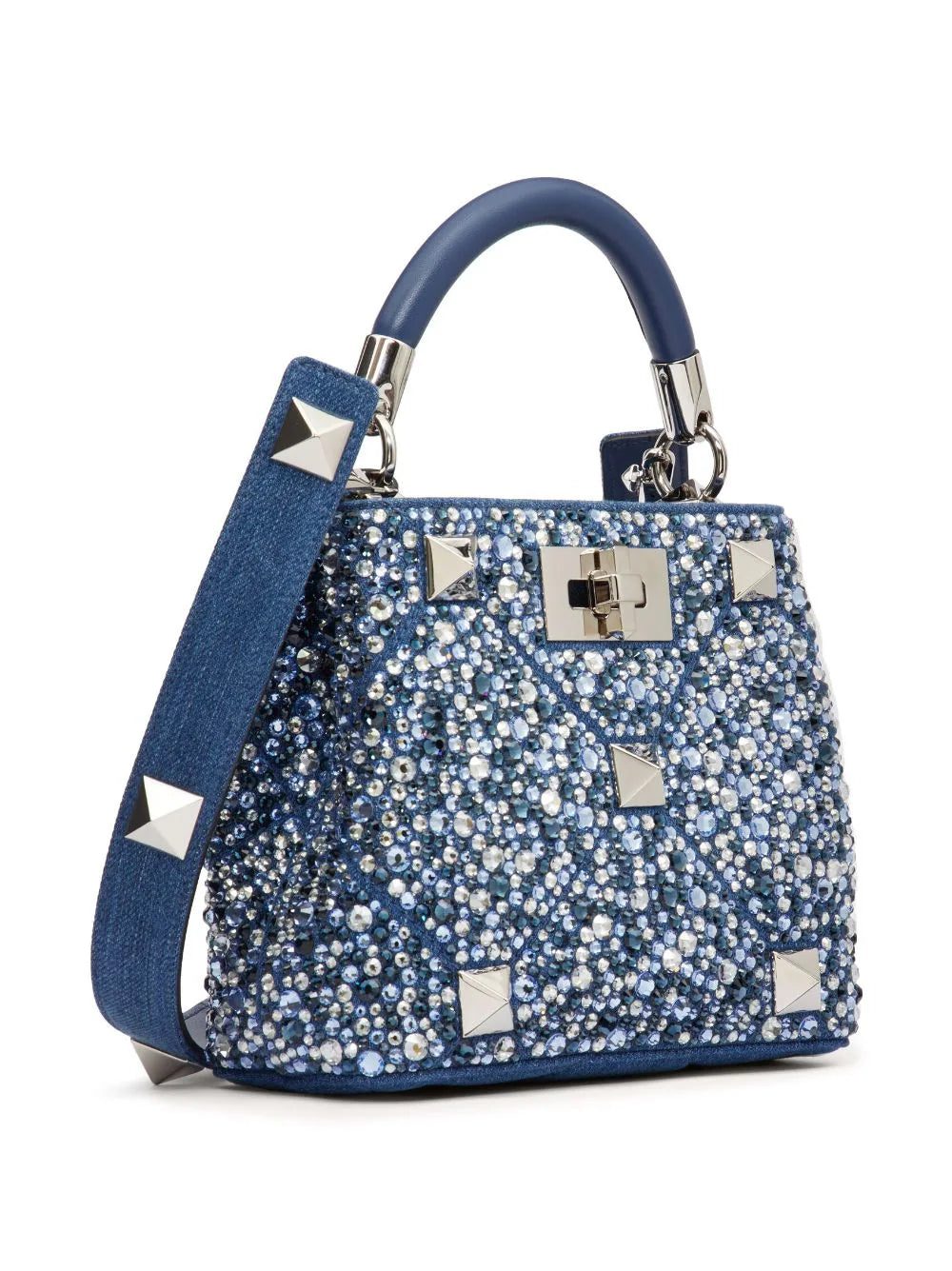 Introduced in 2020, Valentino Garavani's Roman Stud is an enlarged version of the brand's iconic Rockstud embellishment. Rendered in polished silver-tone hardware, it anchors the crystal-covered exterior of this denim tote bag.