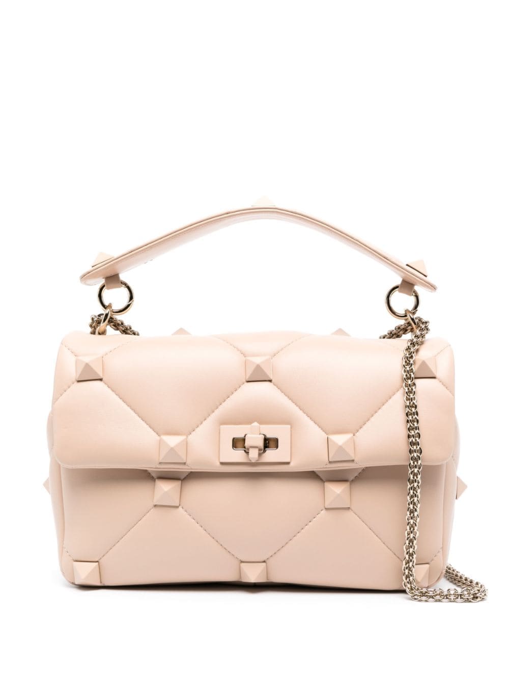 Adorned with Valentino Garavani’s distinctive Roman Stud hardware, this bag is an ode to the brand’s storied heritage. The distinctive pyramidal embellishments stand out against the powder-pink calf leather construction.