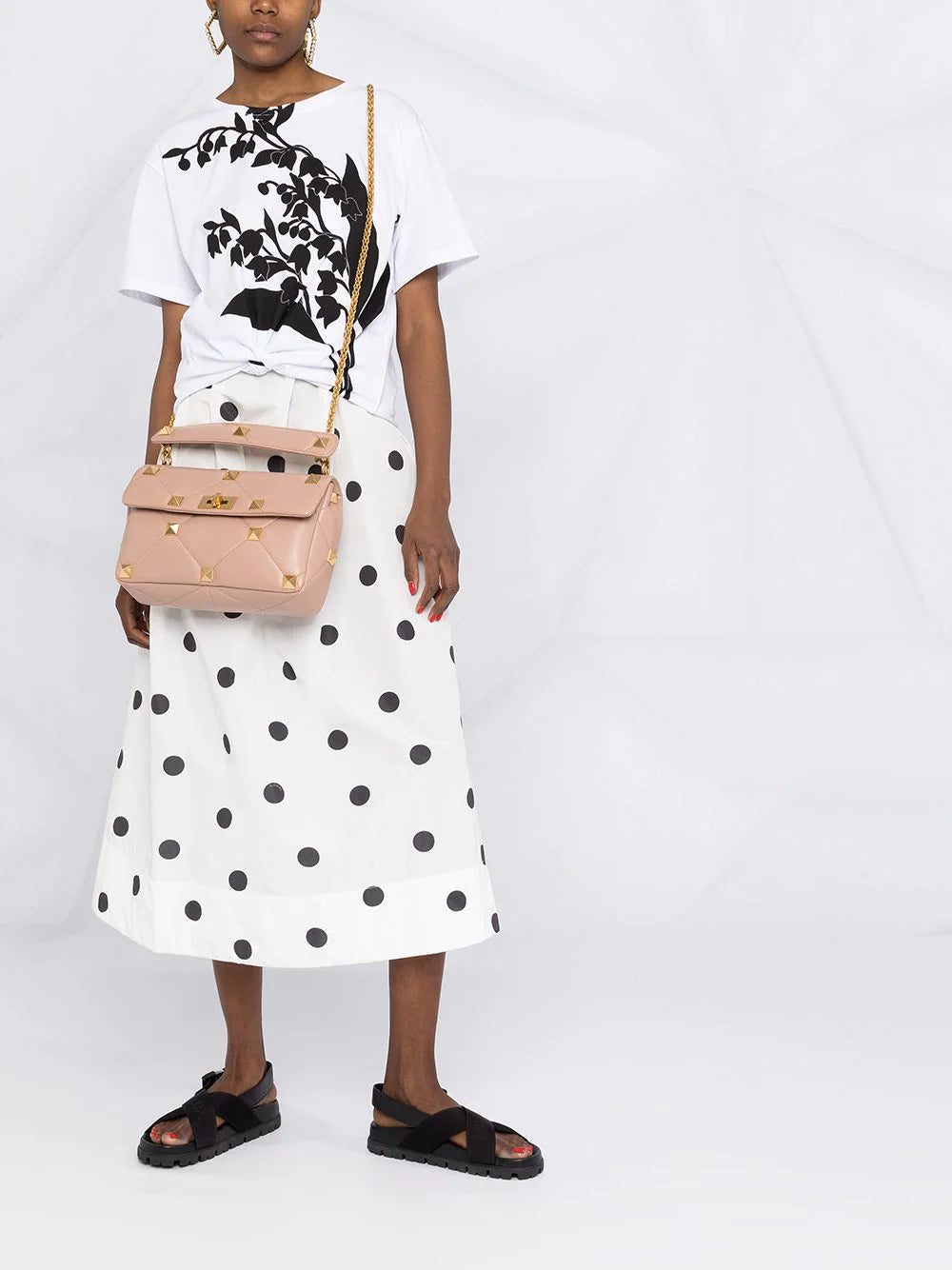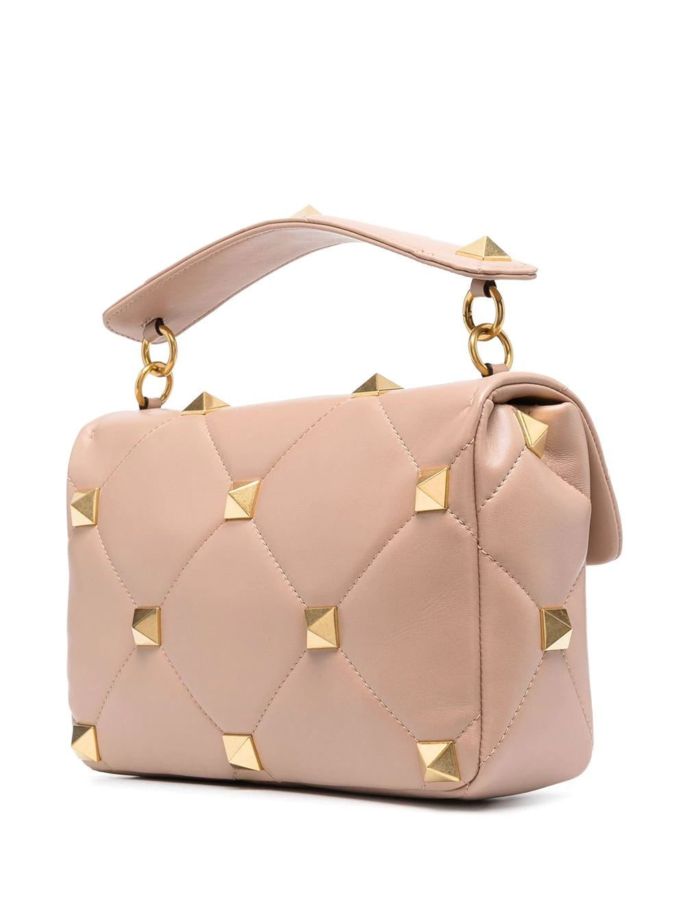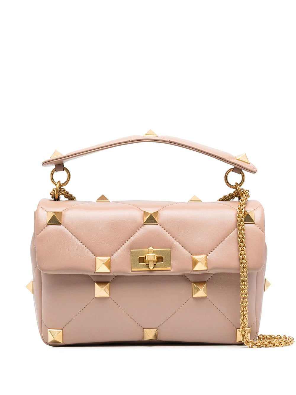 Supersize your embellishments with the help of this Roman Stud top-handle bag from Valentino Garavani. Designed with diamond quilting and gold-tone hardware, this leather accessory is sure to become your new favourite companion.