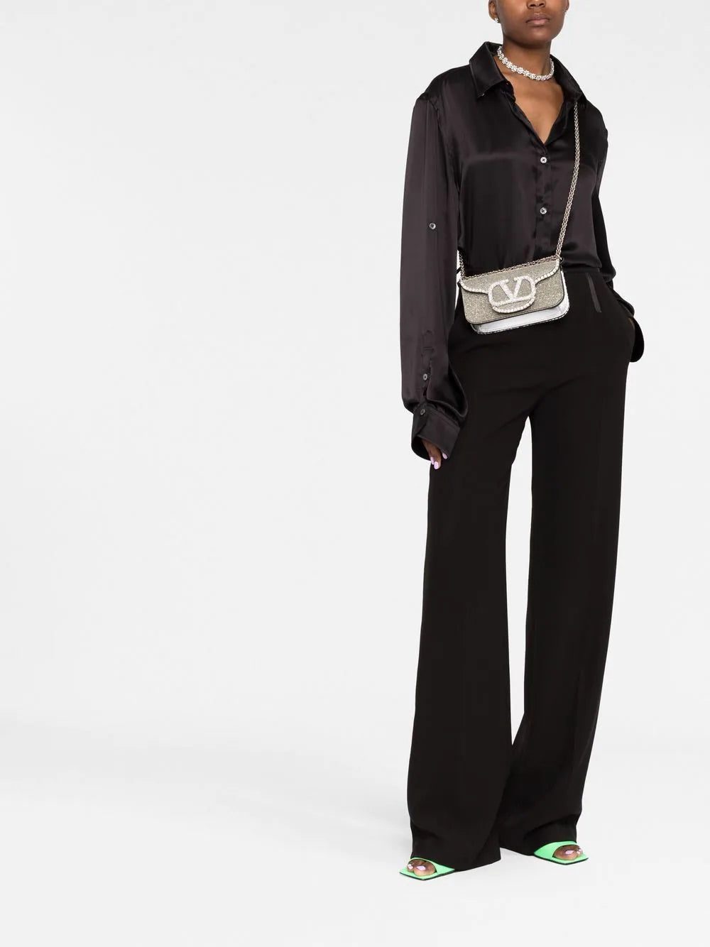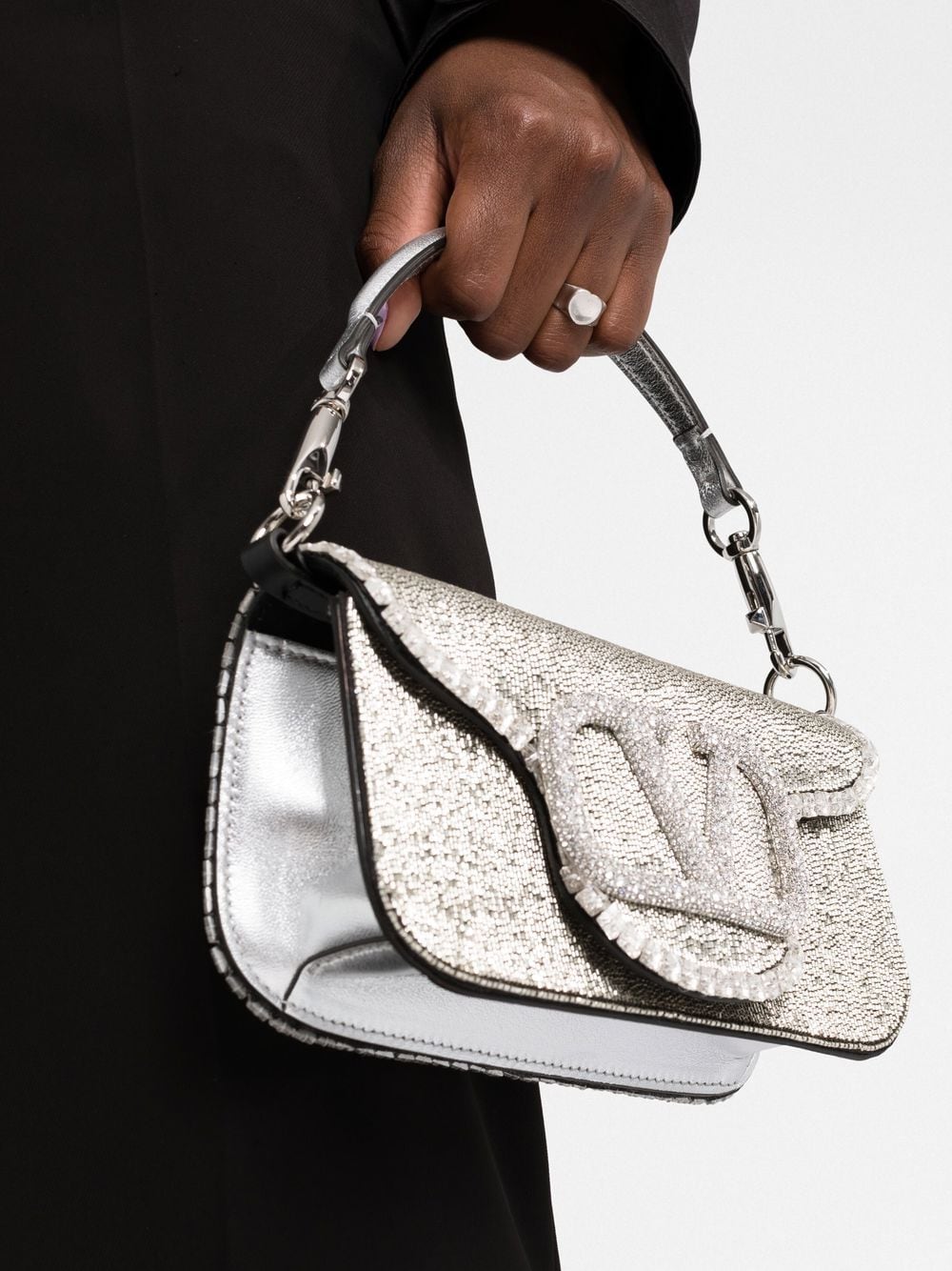 Valentino Garavani's Locò bag honours the brand's iconic VLogo Signature - this silver leather iteration is accented with a gleaming crystal-embellished plaque at the centre. A versatile design, it can also be worn over one shoulder thanks to the detachable strap.