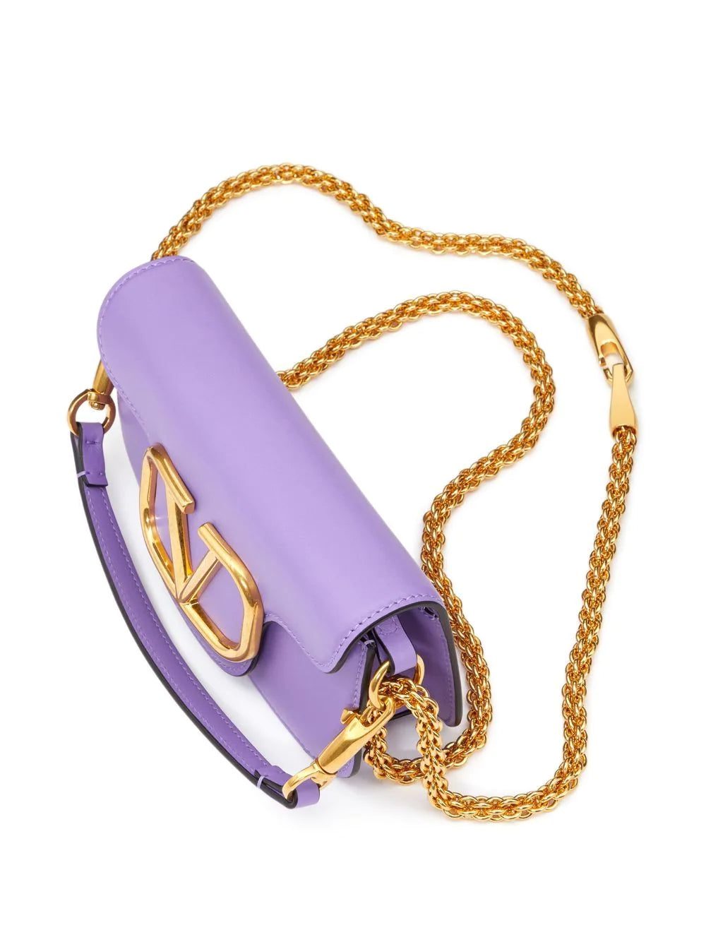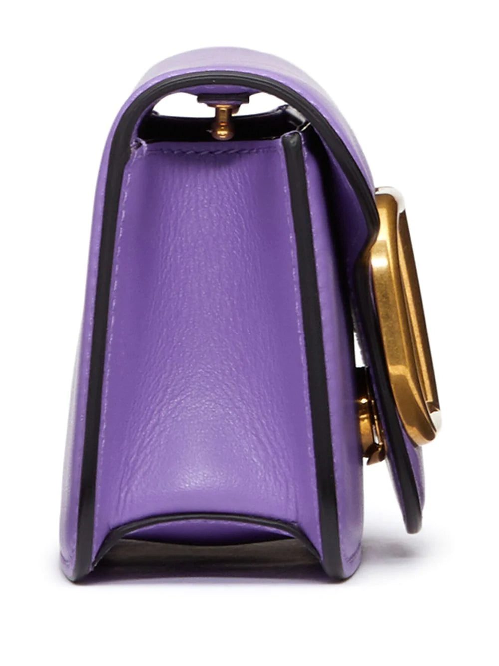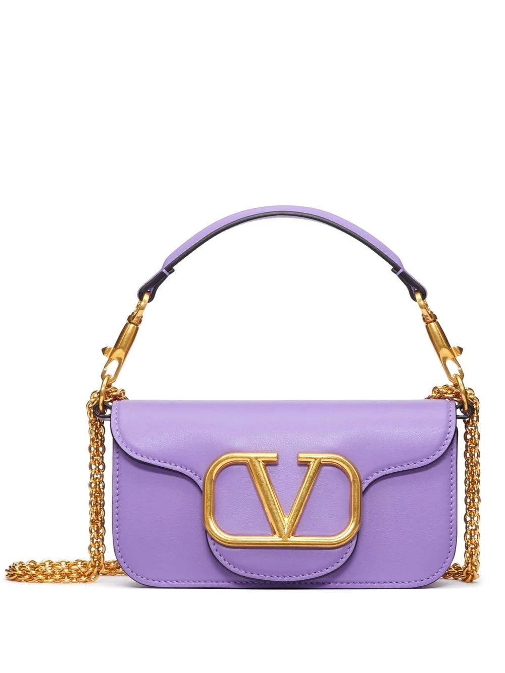 Arriving in a compact leather construction, Valentino Garavani's Locò bag stands out with the iconic VLogo plaque. Here displayed in a gold-tone, it creates a refined contrast with the purple-hued background.